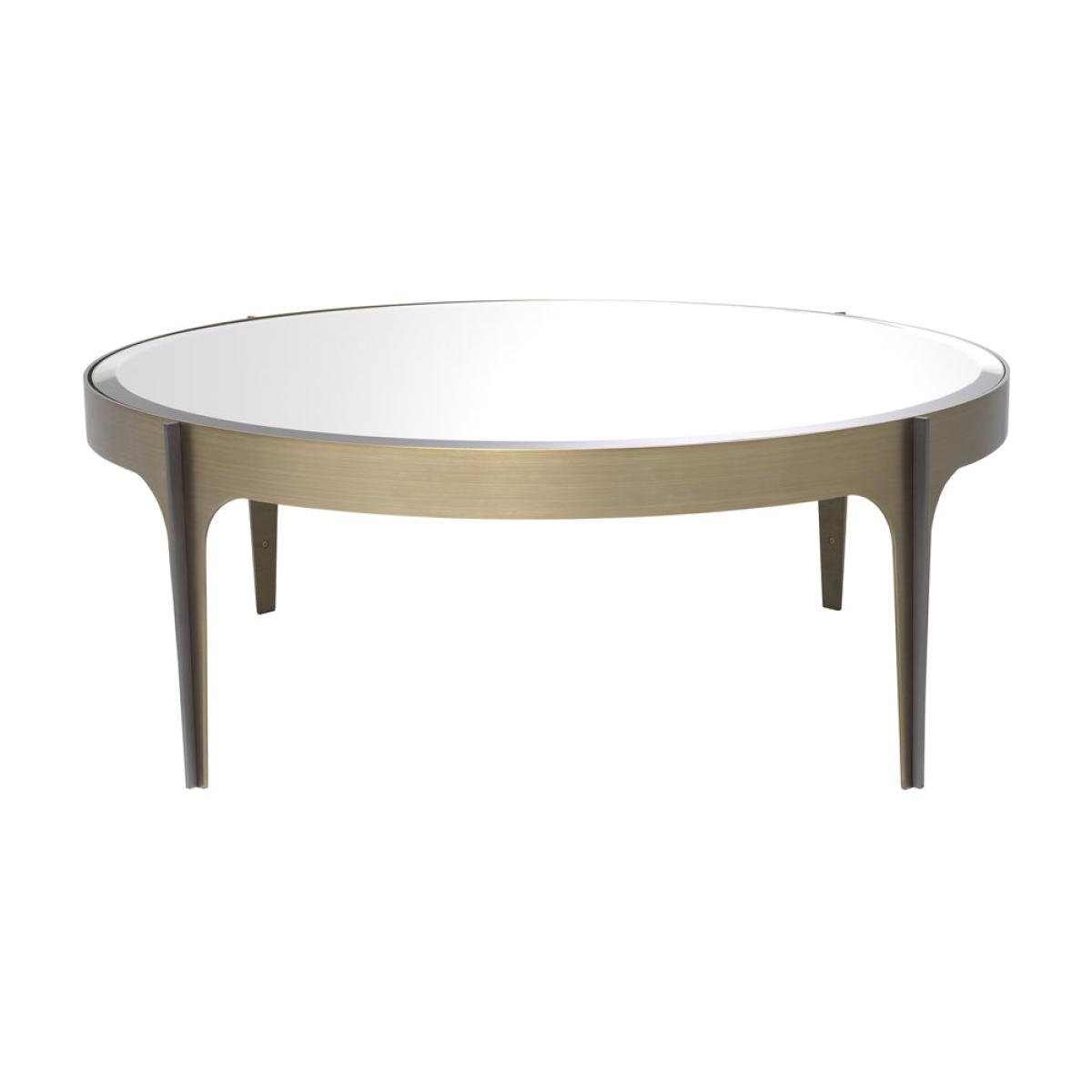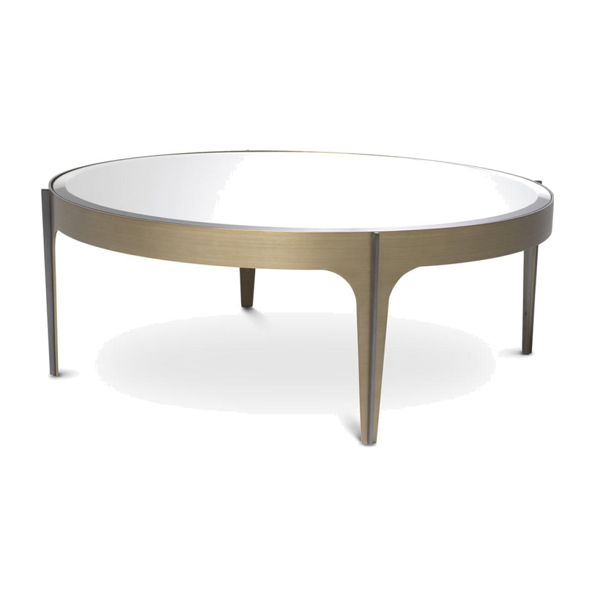 With a Mid-Century Modern design and chic appeal, the small Coffee Table Artemisa makes a statement with an elegant metal frame in a brushed brass finish. The interior curves of the frame are accen. View More. With a Mid-Century Modern design and chic appeal, the small Coffee Table Artemisa makes a statement with an elegant metal frame in a brushed brass finish. The interior curves of the frame are accentuated by sleek bronze bars on the legs and a round tabletop of bevelled mirror glass, bringing focus to the spaciousness within the solid materials shaping this piece. Combine with the large Artemisa Coffee Table for a balanced look.
