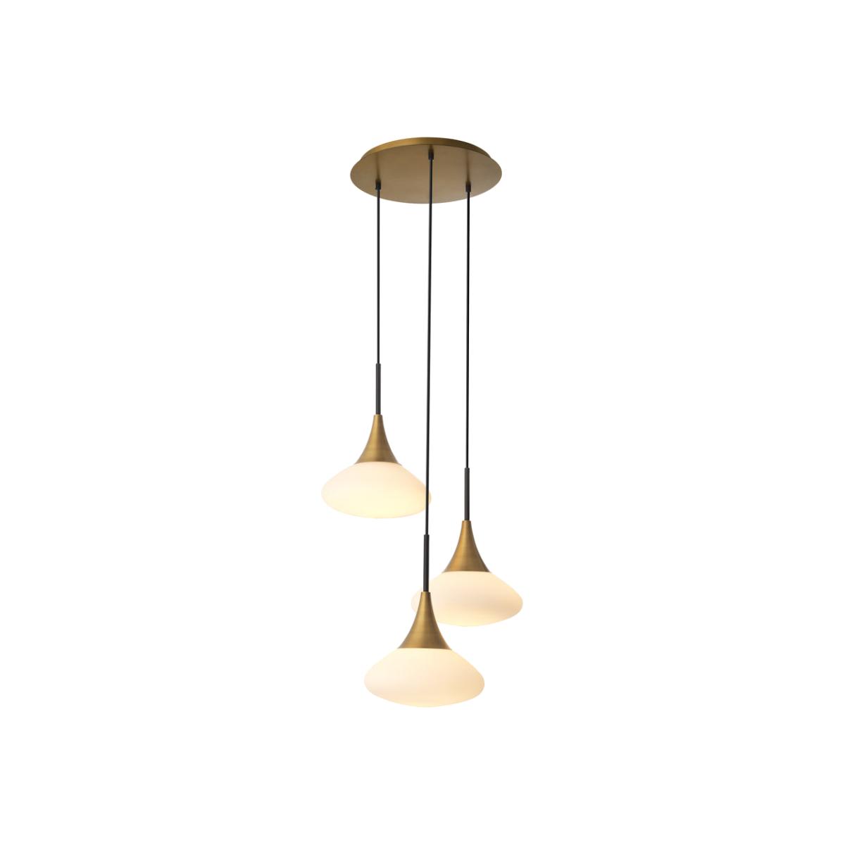 Equally at home in modern and traditional interiors, the 3-light cluster Chandelier Duco brings style as it shines a light in your space. Hanging from a round ceiling plate and provided with an ant. View More. Equally at home in modern and traditional interiors, the 3-light cluster Chandelier Duco brings style as it shines a light in your space. Hanging from a round ceiling plate and provided with an antique brass finish, it features three cables with funnel-shaped holders and elliptical white glass shades that cast an ambient light on your interior surroundings. The cables are adjustable in length, enabling you to shape the chandelier to your wishes.
