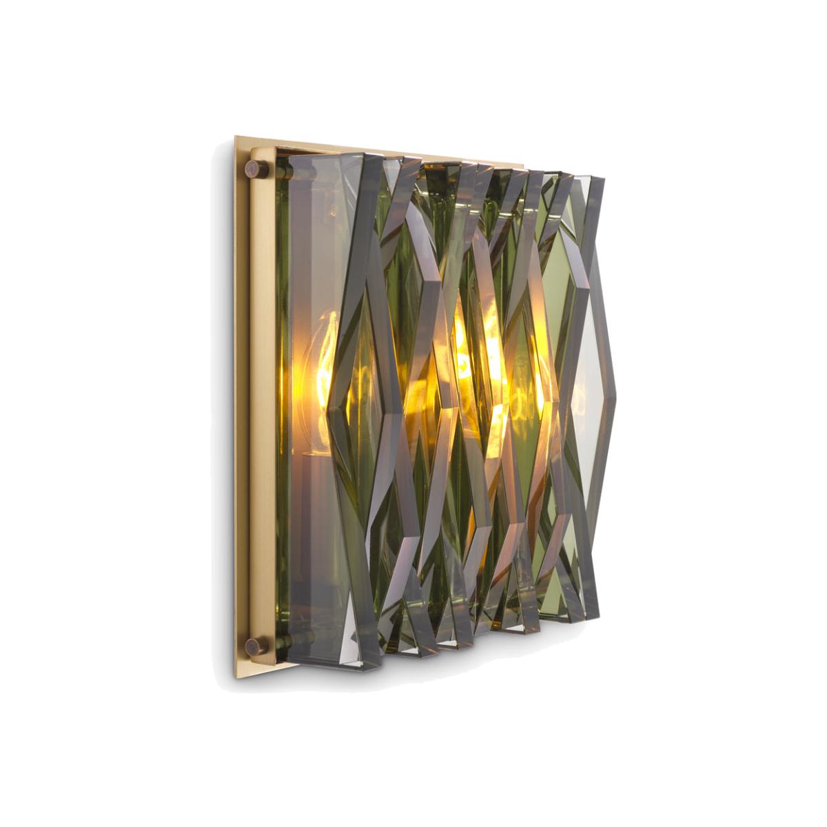 Thick plates of green glass create a striking relief pattern with geometric lines, giving the small Nuvola Wall Lamp an architectural appearance. Mounted on an antique brass fixture, the glass refr. View More. Thick plates of green glass create a striking relief pattern with geometric lines, giving the small Nuvola Wall Lamp an architectural appearance. Mounted on an antique brass fixture, the glass refracts the light, thus creating a wonderful play of light in your interior.