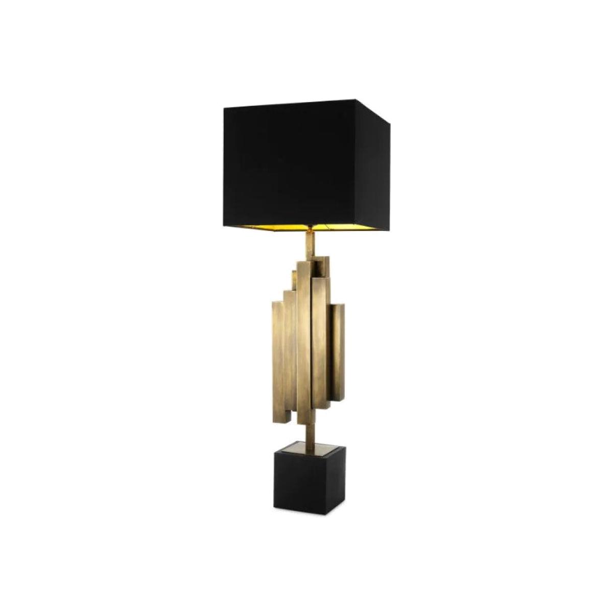 Give your home décor a unique edge with the brutalist Beau Rivage Table Lamp. In line with the rough-around-the-edges trends, this abstract sculptural lighting fixture with vintage brass finish evokes a dramatic vibe. Featuring a black base and a square black lampshade, it is the perfect complement to softer, rounder furniture pieces, like curved sofas and armchairs. Dimensions: A. 18 | B. 35 | C. 105,5 cm