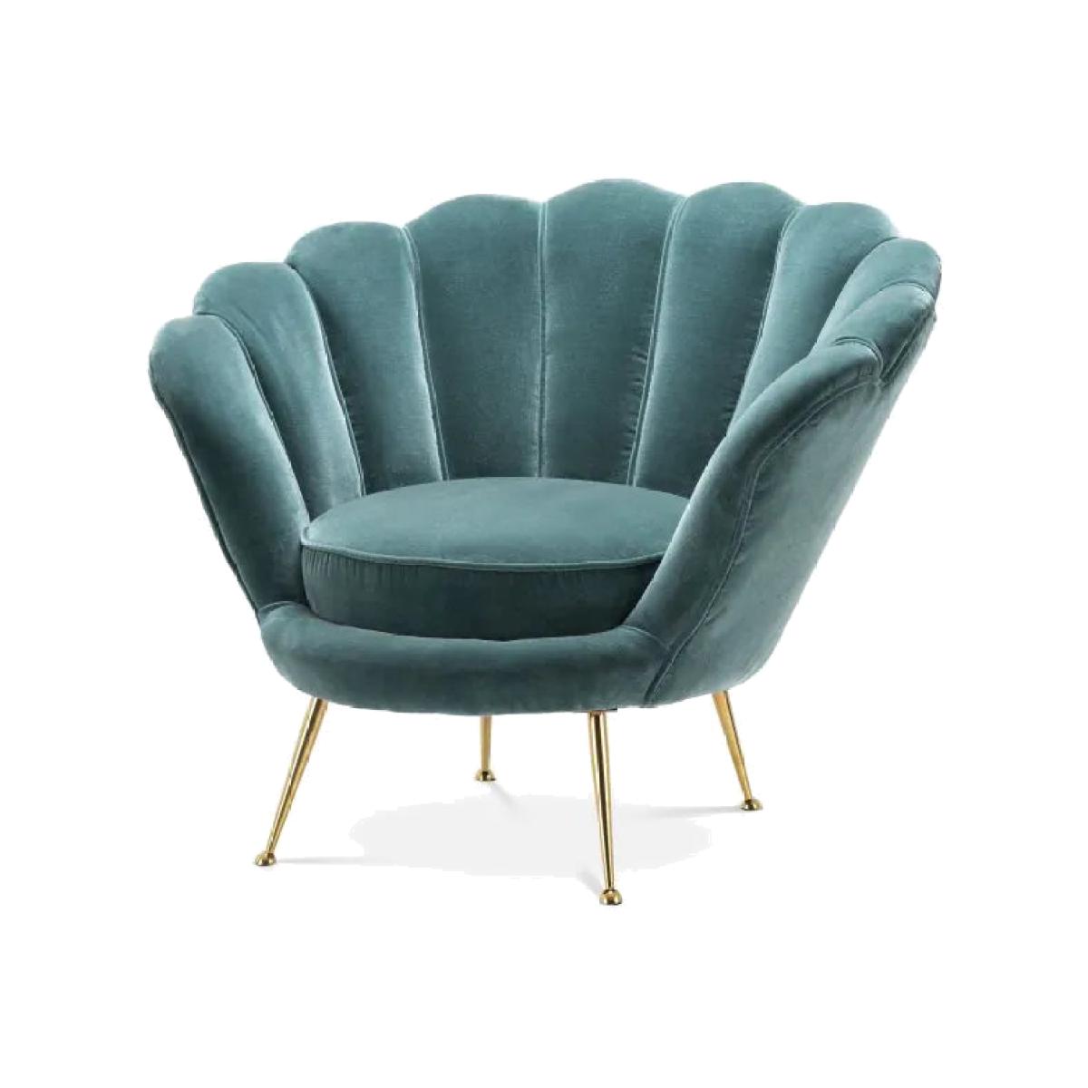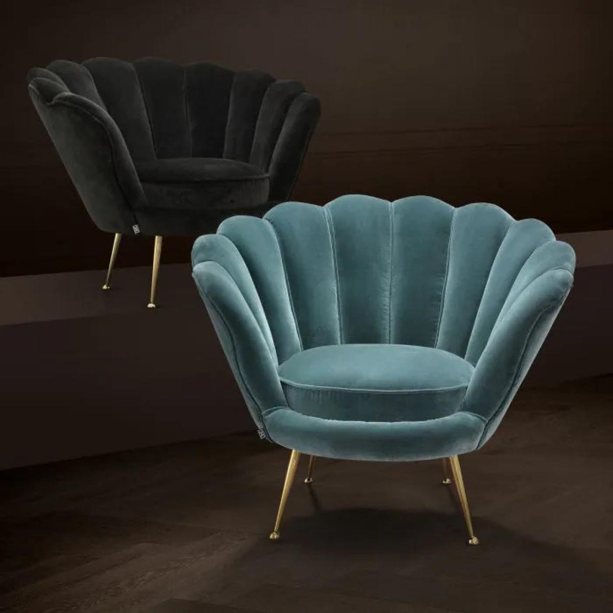 Unwind in the Art Deco inspired Trapezium Chair, which surely gives your home décor the wow-factor. With its shell-shaped frame, Cameron deep turquoise upholstery, and tapered brass legs, this gorgeous seat exudes vintage glamour. Finish/Colour: Blue