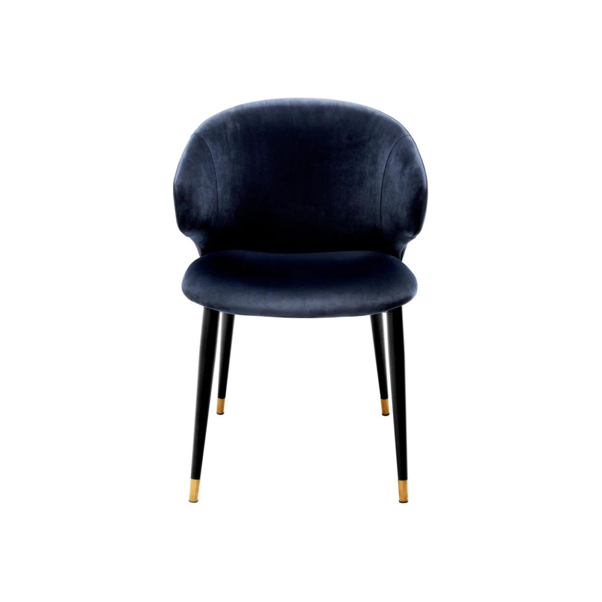 Add Mid-Century Modern appeal to your dining room or kitchen with the Volante Dining Chair. Its black frame with sleek tapered legs and brass caps features a seating and backrest in a Savona midnight blue upholstery. Team up different chairs from this series for a charming vintage style!