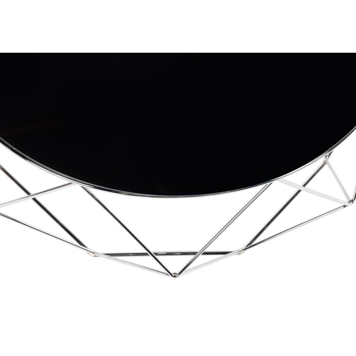 Looking for a side table that won't fade into the background? The Eiffel side table has a striking look thanks to its geometric metal base and black glass top. Why you'll love it. Circular black and silver side table is a great example of bold modern design. Contemporary style inspired by modern architecture. Black glass top is the perfect place for your favourite lamp. Geometric metal frame with a polished silver-coloured finish. Practical, easy-clean glass surface always looks fabulous. This great-value side table is part of the Eiffel range. What you need to know. Glass top, metal frame. Tighten bolts every 6 months. We recommend the use of coasters and placemats. Simply wipe clean with a non-abrasive cloth.