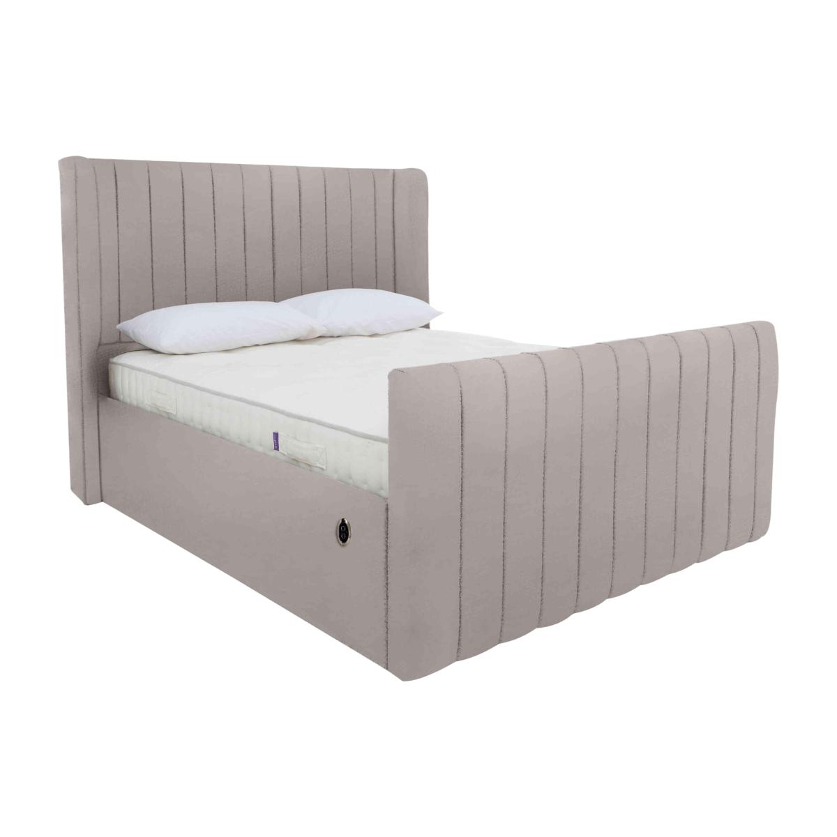 There’s nothing quite like a luxury bed frame for turning a good night's rest into a sumptuous sleep experience. Our exclusive handcrafted Eira collection offers a beautifully curated selection of bed frames with optional high foot ends – for that classic glamorous bed frame look – and underbed ottoman storage space, so useful for keeping extra pillows and duvets out of sight and dust-free. The upholstery is embellished with contemporary fluting and is available in an extensive selection of high-quality fabrics. In double, king and super king sizes and only at Furniture Village. With a powered lift mechanism and practical storage, this electric ottoman bed frame makes storing your spare bedding and clothes a breeze. And it looks fabulous, too – win, win. Why you'll love it Statement looks and plenty of storage, this ottoman bed frame is the whole package. Elegant and contemporary. Super-spacious underbed ottoman storage compartment. Electric powered lift mechanism for easy access. The tall winged headboard and high foot end are sumptuously cushioned. Luxurious upholstery features precisely tailored fluting. Available in a wide choice of on-trend fabrics and colours. Handcrafted and only available at Furniture Village. This high foot end ottoman bed frame is part of the Eira bed frame range. What you need to know Mattress sold separately. Base type: beech slats. Ottoman opens at foot end. Mattress weight limit: double 90 kg, king and super king 100kg. Please take care when opening and closing. Centre rail legs must always be vertical and fully adjusted to support the mattress when in use. Some fabrics can show wear on areas of more use or in direct sunlight. Clean weekly using a soft brush or vacuum with the curtain attachment. Deal with any spills promptly. Professional cleaning advised for oil- and grease-based stains.