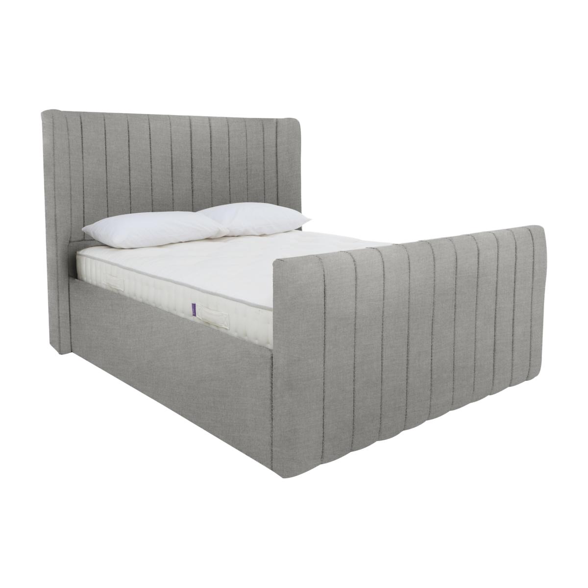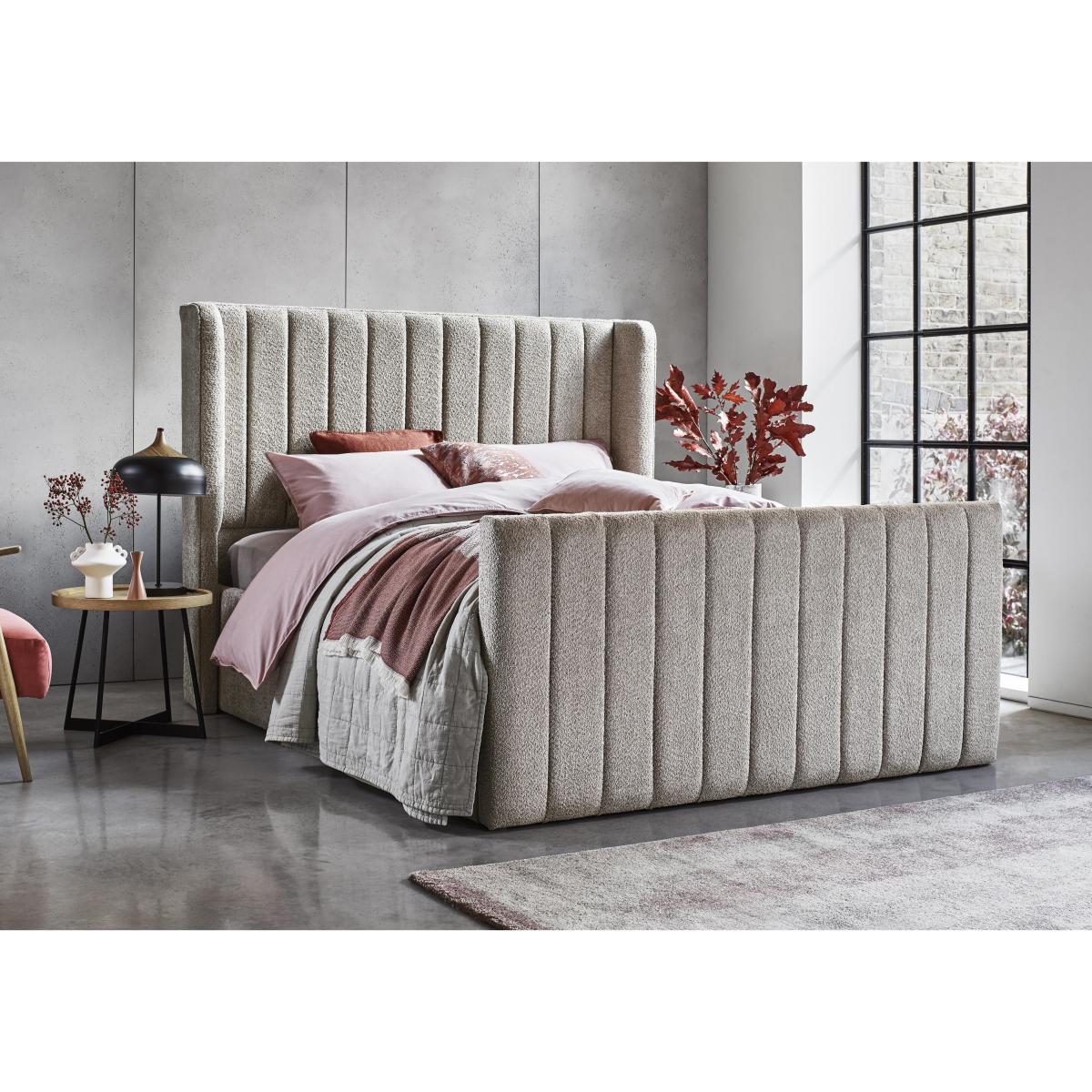 There’s nothing quite like a luxury bed frame for turning a good night's rest into a sumptuous sleep experience. Our exclusive handcrafted Eira collection offers a beautifully curated selection of bed frames with optional high foot ends – for that classic glamorous bed frame look – and underbed ottoman storage space, so useful for keeping extra pillows and duvets out of sight and dust-free. The upholstery is embellished with contemporary fluting and is available in an extensive selection of high-quality fabrics. In double, king and super king sizes and only at Furniture Village. Statement style, sumptuous finish, handcrafted quality and practical storage – this beautiful bed frame with tall headboard and high foot end is everything you want in a bed frame. Why you'll love it This striking high foot end ottoman bed frame is the ultimate bed frame. Elegant and contemporary. Super-spacious underbed ottoman storage compartment. The tall winged headboard and high foot end are sumptuously cushioned. Luxurious upholstery features precisely tailored fluting. Available in a wide choice of on-trend fabrics and colours. In double, king and super king sizes. Handcrafted and only available at Furniture Village. This high foot end ottoman bed frame is part of the Eira bed frame range. What you need to know Mattress sold separately. Base type: beech slats. Ottoman opens at the foot end. Mattress weight limit: double 90 kg, king and super king 100kg. Please take care when opening and closing. Centre rail legs must always be vertical and fully adjusted to support the mattress when in use. Some fabrics can show wear on areas of more use or in direct sunlight. Clean regularly using a soft brush or vacuum with the curtain attachment. Deal with any spills promptly. Professional cleaning advised for oil- and grease-based stains.