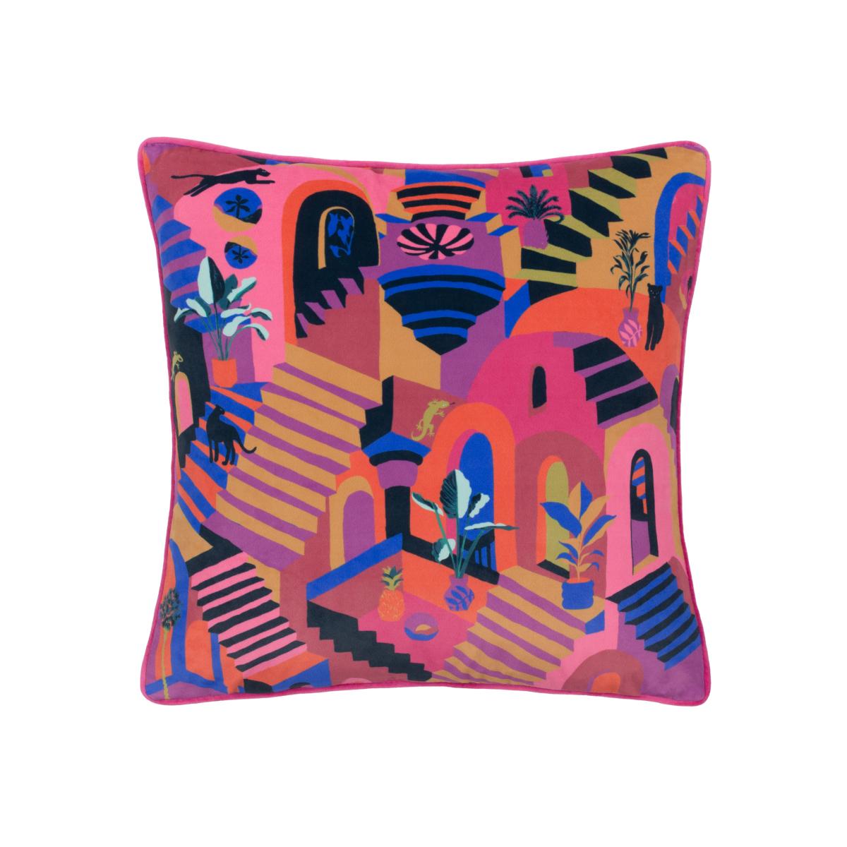 Wandering through Dalt Vila at sunset, shades of pink, orange, and purple cast luminescent shadows on the old town walls. Keep your eyes peeled for a loose wild panther or two roaming around as you watch the glowing sun sink into the Mediterranean Sea. Featuring a vibrant depiction of Ibiza old town basking in the sunset glow, embroidered on soft velvet, this cushion is complete with a reverse of printed scattered illustrations of animals, objects, or botanics found in the Mediterranean.