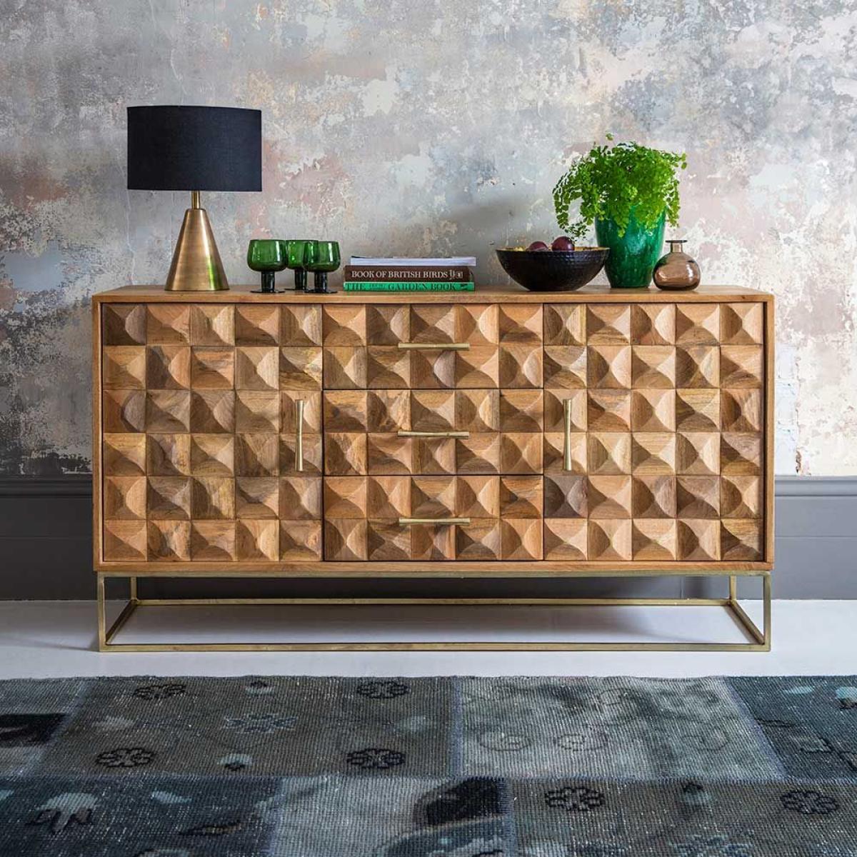 I often refer to the Capitan sideboard as a go-to for adding subtle texture without overwhelming a scheme. Its geometric oak façade and slim brass legs make it right at home in mid-century, Scandi or modern industrial settings, and the generous internal storage keeps dining or living rooms clutter-free. To style it, I’d layer a low-profile lamp at one end, a stack of coffee-table books in the middle and a single statement vase or plant at the other. If you’re using it in a hallway, hang a simple round mirror above, and keep the surface clear enough to slip mail and keys into a decorative tray.