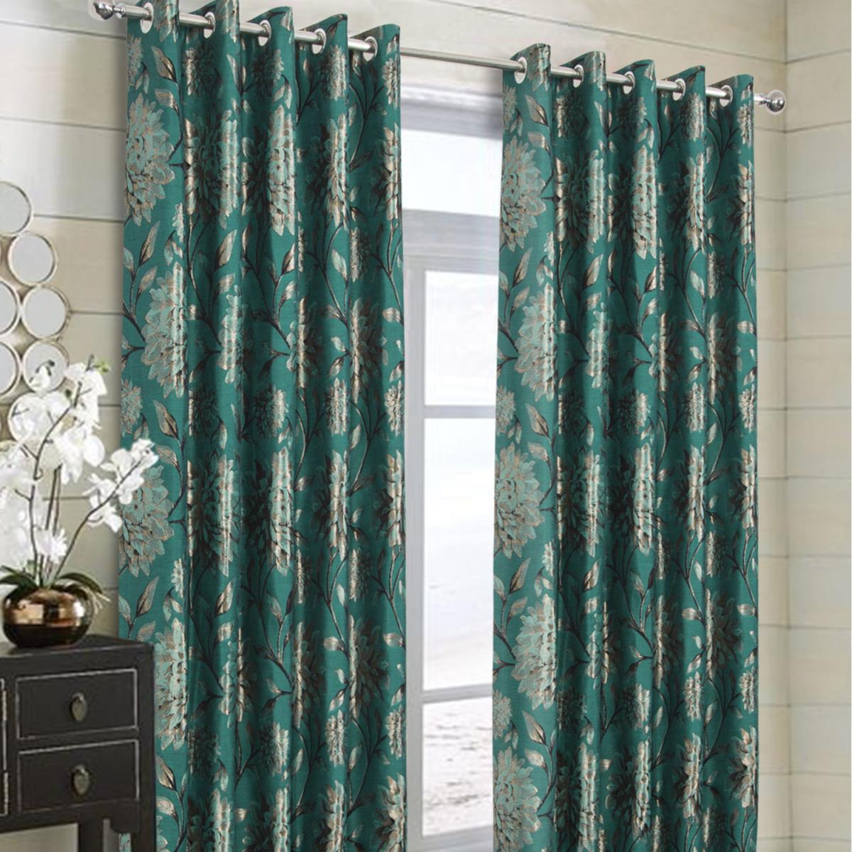 Elanie Fully Lined Floral Metallic Eyelet Curtains - Teal / 165cm / 229cm