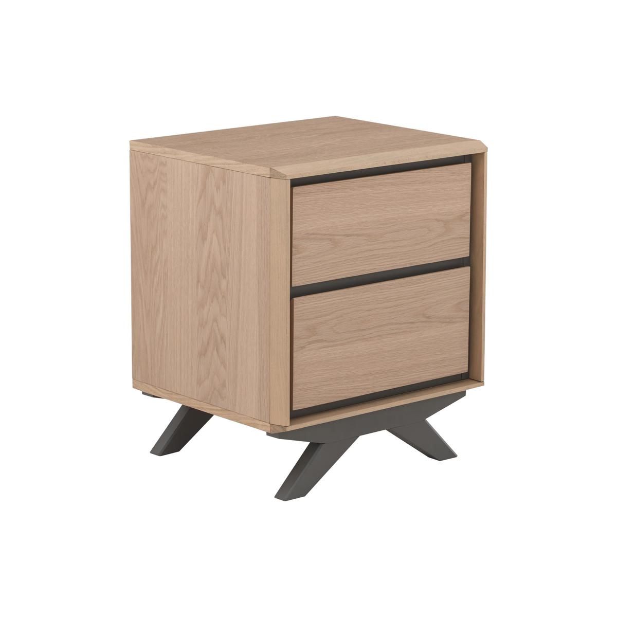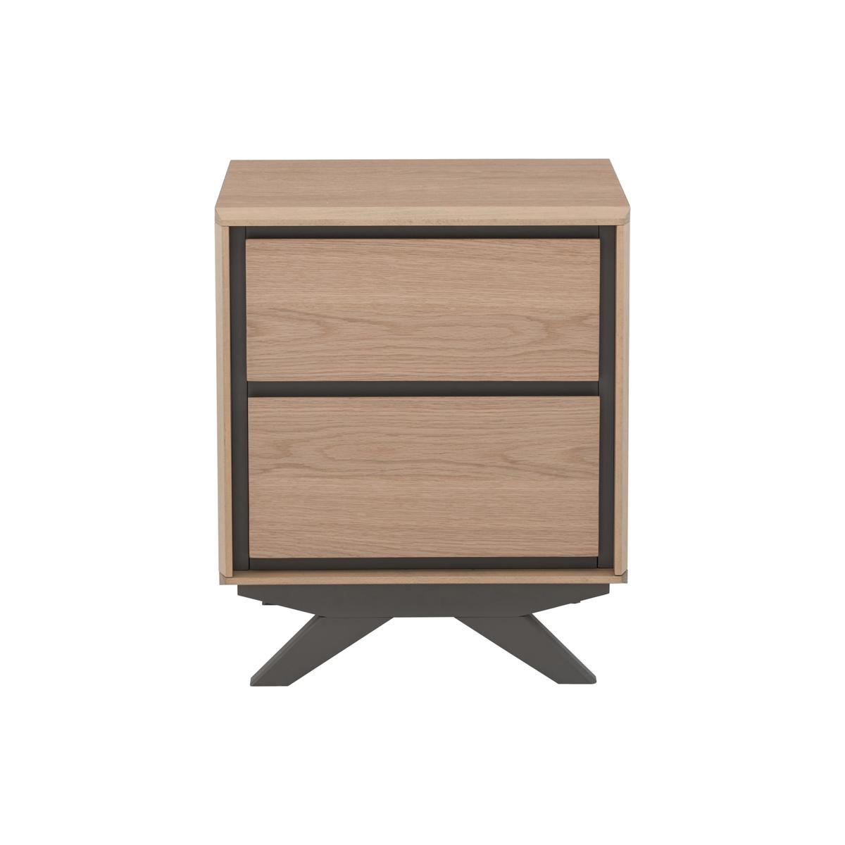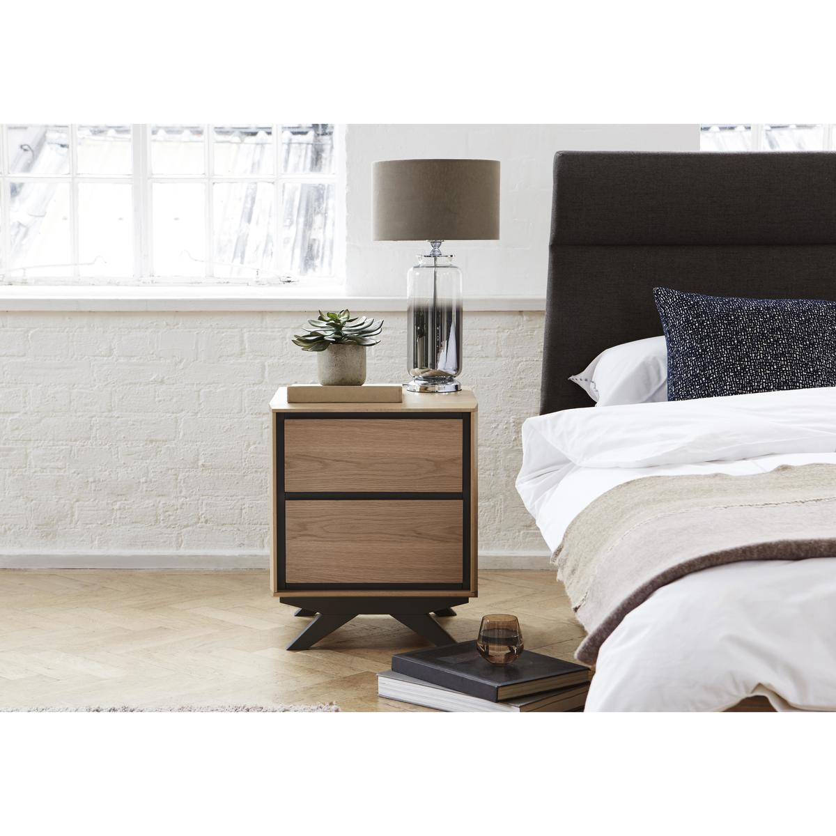 Scandi-inspired contemporary style. Solid construction in beech and oak veneers. An elegant modern look for any bedroom. The perfect bedside table offers storage and style in equal measure, adding to your overall bedroom design aesthetic while not taking up too much space. The Elara 2 drawer bedside, in cool, clean Scandi-inspired style with two useful drawers, is a perfect example. You’ll love the look too, especially if you’re a fan of modern linear style. Solidly constructed from American oak and veneer, it has a bevelled edge frame and two recessed drawers with a contrasting dark grey surround. Drawers have integrated handles and soft-close runners. It rests on a dark grey base with splayed legs made of beech. The neat proportions ensure that it’ll work well in all sizes and styles of bedroom. The Elara 2 drawer bedside table is part of the Elara bedroom furniture collection which includes chests of drawers, a wardrobe and a dressing table, as well as a single drawer bedside table and a gorgeous bed frame with an upholstered headboard. Did you know? Natural wood has unique markings, with some colour variation. The colour and tone of wood improves with age.