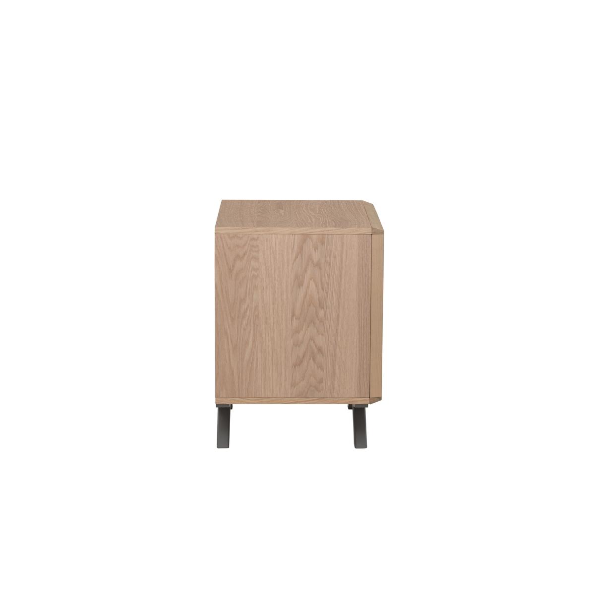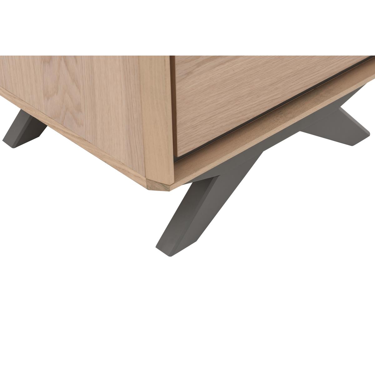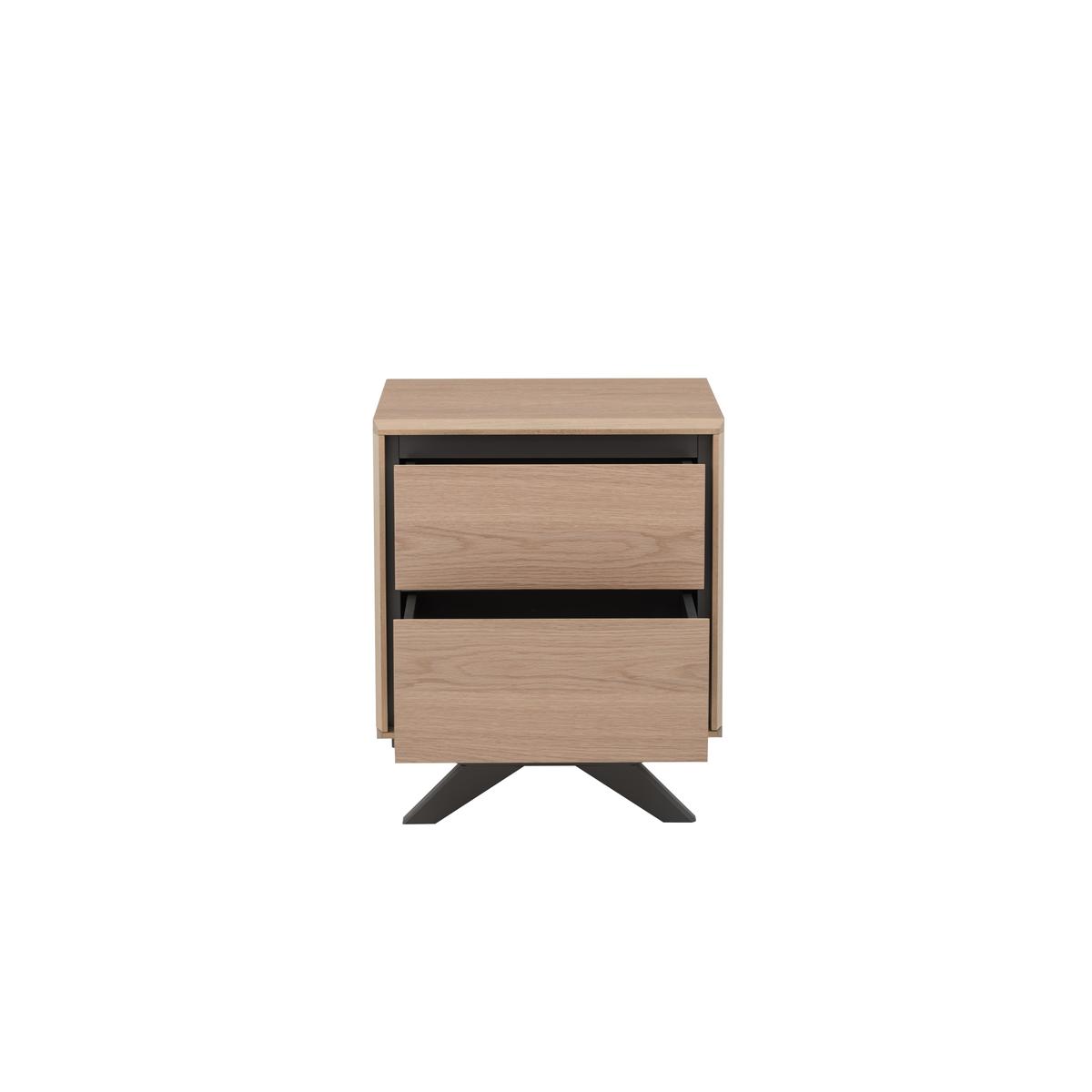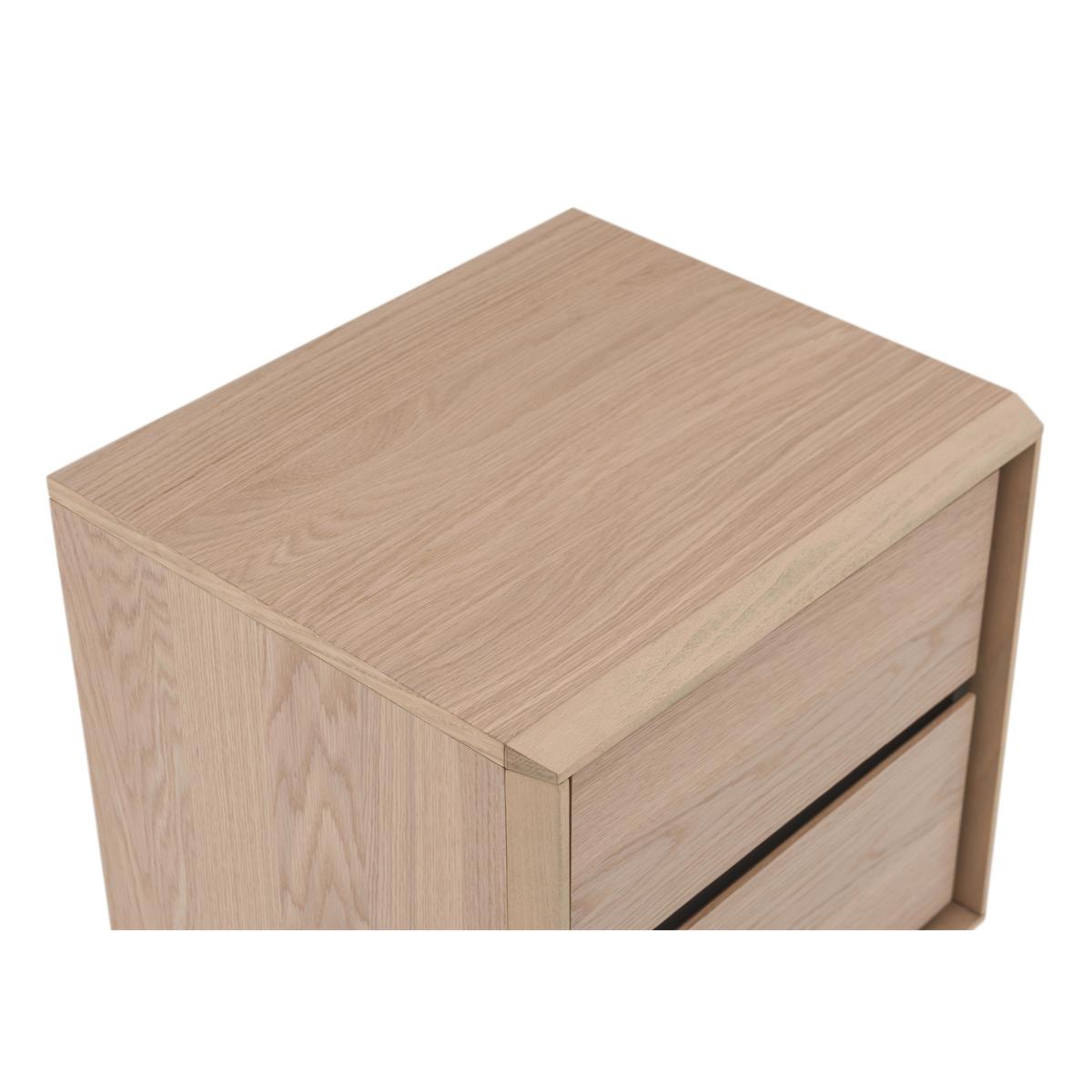 Scandi-inspired contemporary style. Solid construction in beech and oak veneers. An elegant modern look for any bedroom. The perfect bedside table offers storage and style in equal measure, adding to your overall bedroom design aesthetic while not taking up too much space. The Elara 2 drawer bedside, in cool, clean Scandi-inspired style with two useful drawers, is a perfect example. You’ll love the look too, especially if you’re a fan of modern linear style. Solidly constructed from American oak and veneer, it has a bevelled edge frame and two recessed drawers with a contrasting dark grey surround. Drawers have integrated handles and soft-close runners. It rests on a dark grey base with splayed legs made of beech. The neat proportions ensure that it’ll work well in all sizes and styles of bedroom. The Elara 2 drawer bedside table is part of the Elara bedroom furniture collection which includes chests of drawers, a wardrobe and a dressing table, as well as a single drawer bedside table and a gorgeous bed frame with an upholstered headboard. Did you know? Natural wood has unique markings, with some colour variation. The colour and tone of wood improves with age.