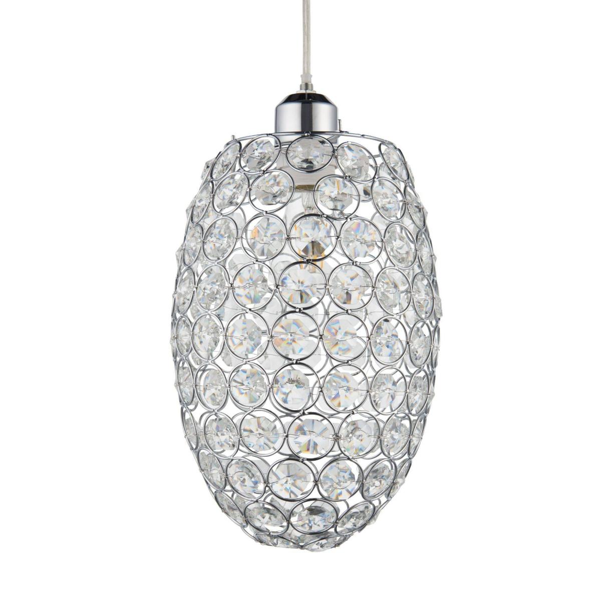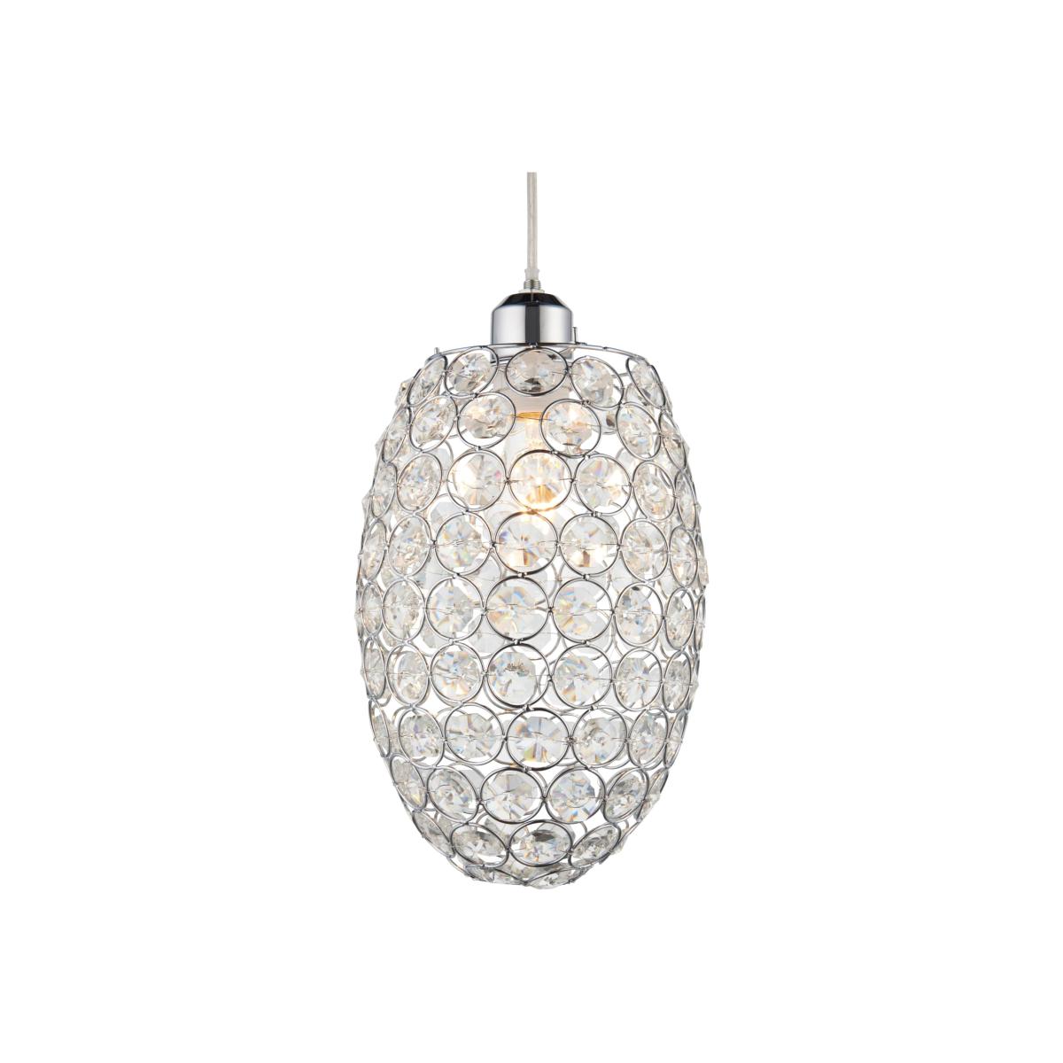 Contemporary oval pendant light shade featuring crystal glass detailing. Update your interiors with the glamorous Elara ceiling light shade, a beautiful crystal ceiling pendant, exclusive to Pagazzi. This easy-fit oval-shaped shade features round clear glass crystal beads suspended within circular polished chrome frames. This instant statement light adds a touch of glam at a modest price! Seamlessly attach to your existing light fitting for an instant refresh to bedrooms, living rooms and hallways.