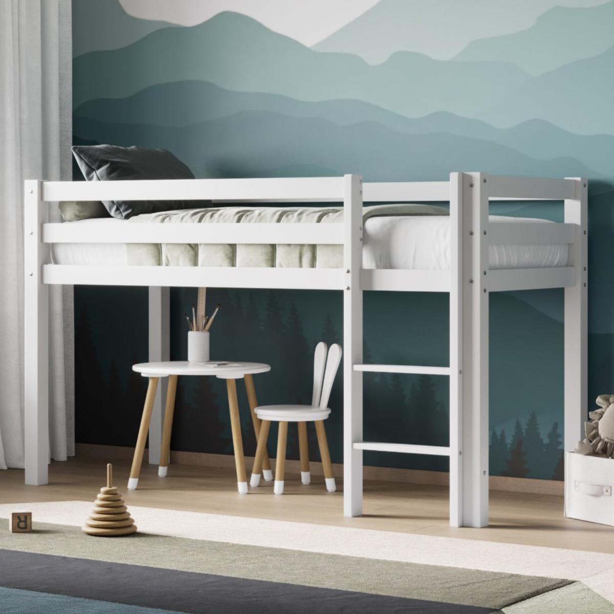 * Solid pine frame* Sleek finish* Wide steps* Short Mattress required This bunk bed is a stylish and practical solution crafted from solid pine, designed to bring both durability and charm to your child's room. This mid sleeper features wide steps that ensure safe and comfortable access to the elevated sleeping area, making it an ideal choice for younger children. The bed frame's compact design maximises floor space, providing ample room underneath for storage or play.