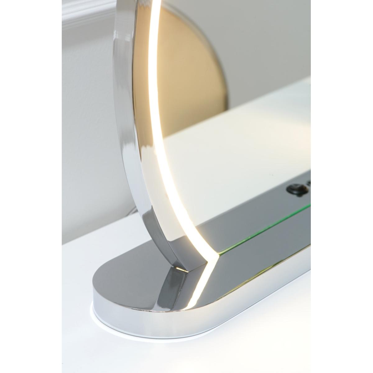 An elegant celestial inspired dressing mirror. Toughened mirror with a polished chrome frame. Warm LED ring light feature, perfect for applying make-up or taking self portraits. On/Off switch button located at the front of the base. Supplied with UK 3 amp plug with silver coloured woven flexi cable.