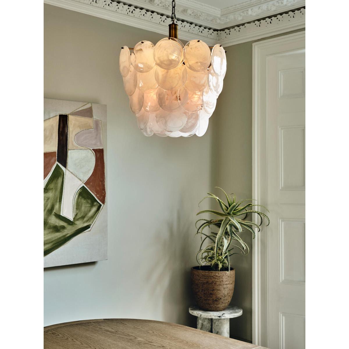 Originally designed for Soho House Rome, the Elba chandelier isformed into a tiered chevron with clear glass discs that arecharacterised by white swirls. Hang it in a hallway, bedroom orliving room to bring the laid-back elegance of Soho House Rome intoyour home. Handmade clear glass. Antique brass frame. Adjustable chain. Requires six x E14 LED/ 5W max bulb. Inspired by our Soho House Rome.
