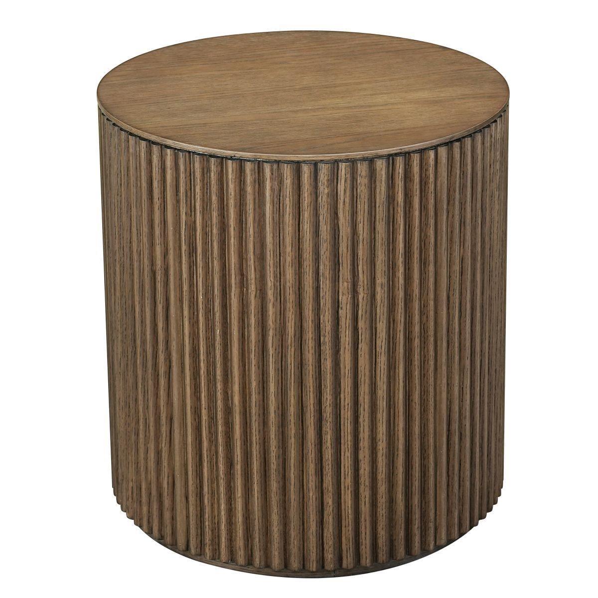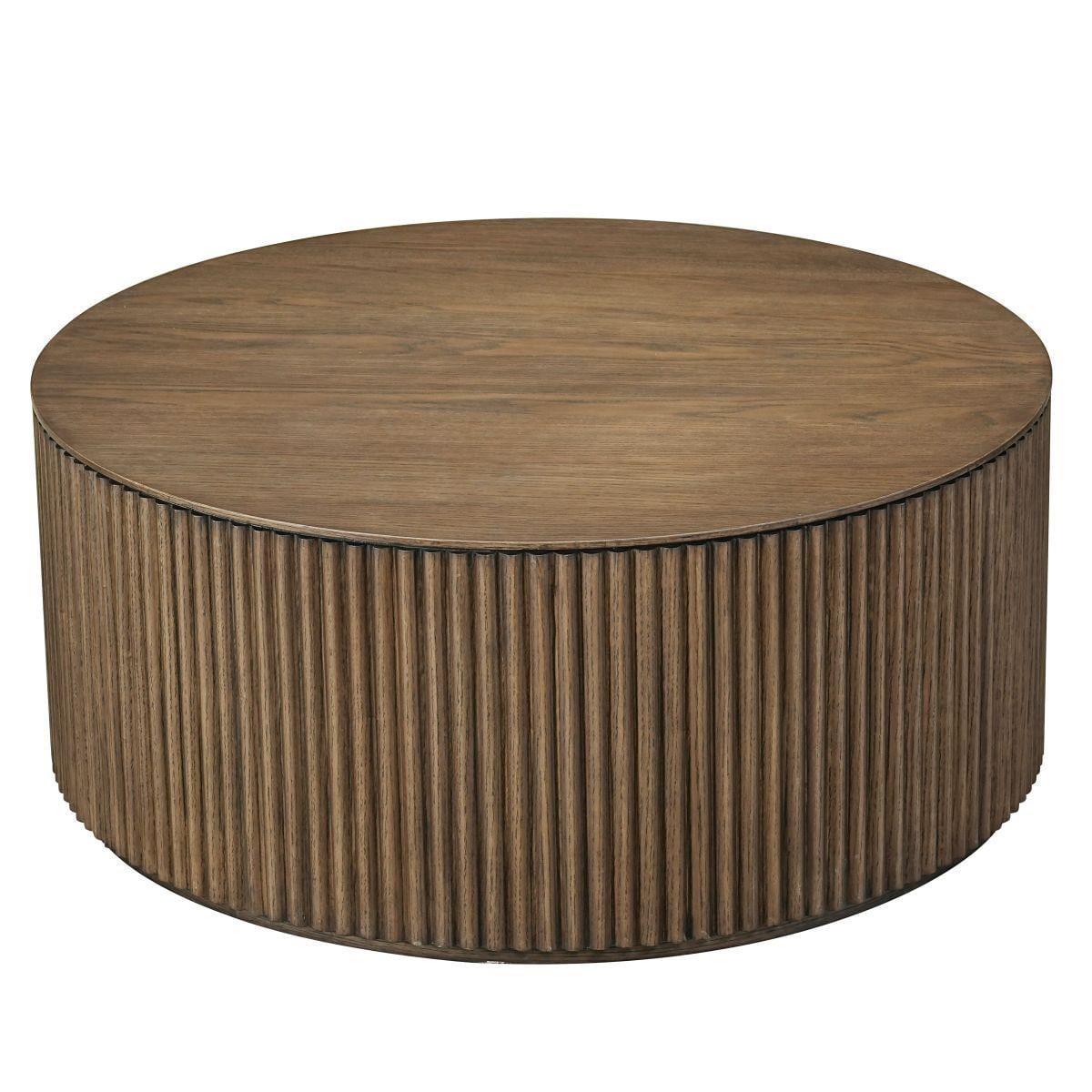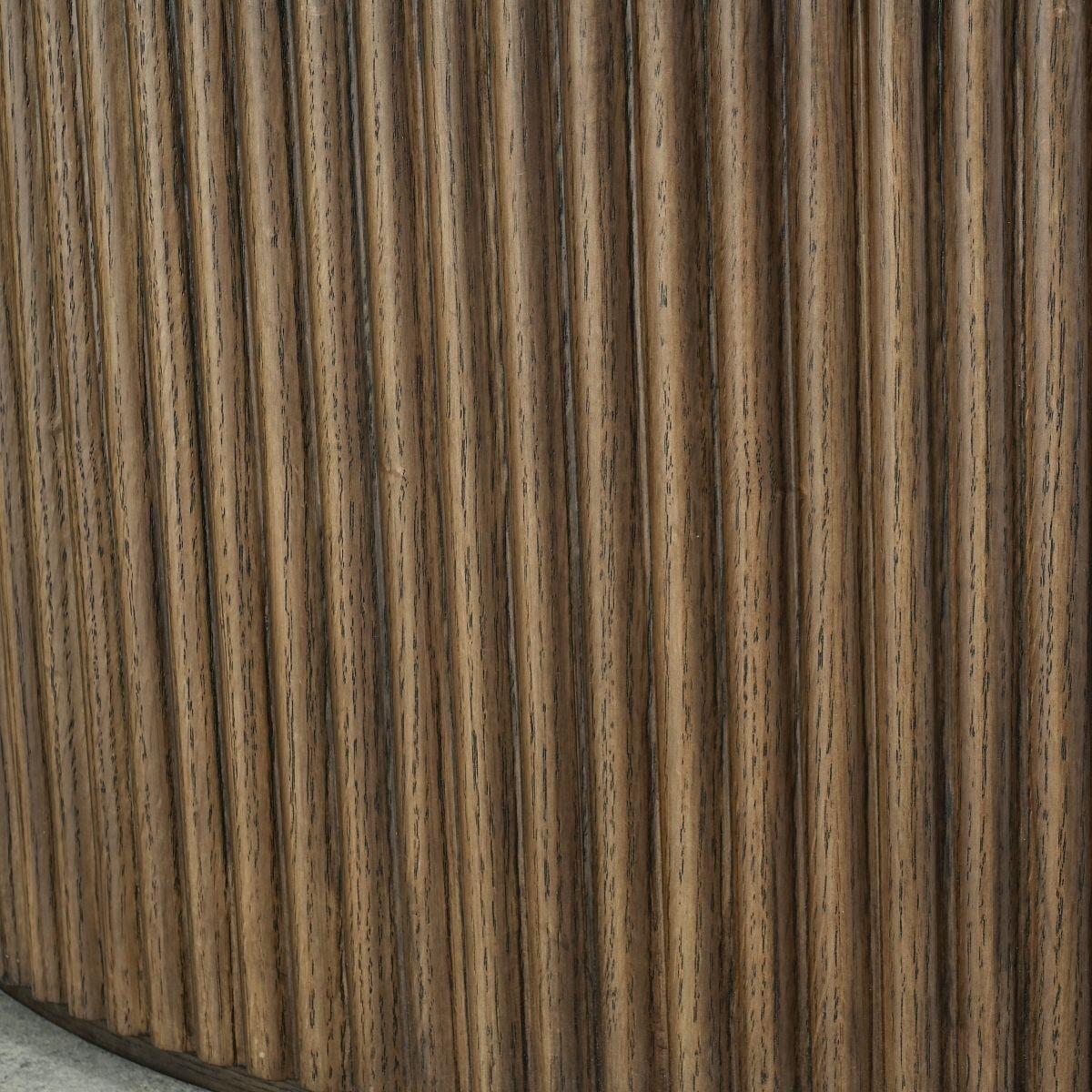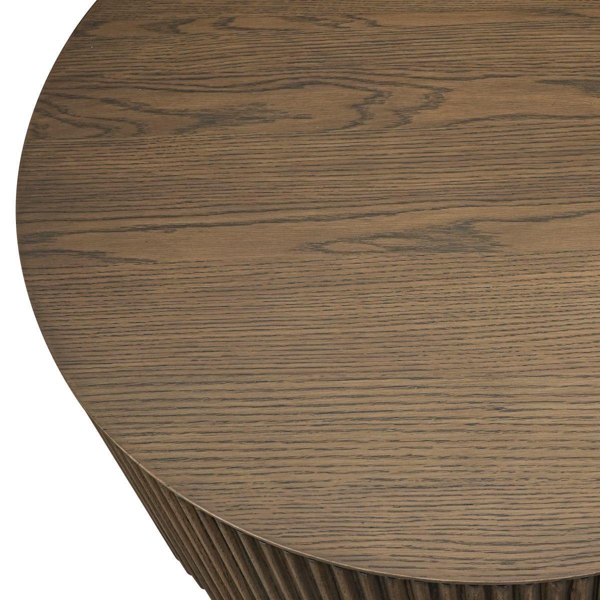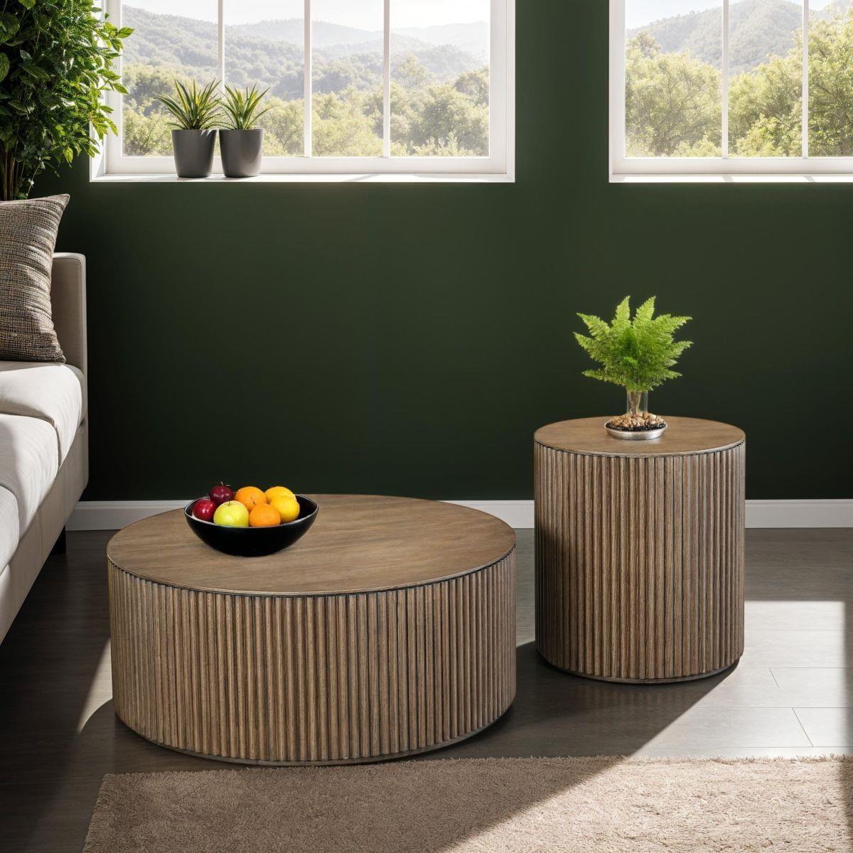 Upgrade your living room with this set of 2 living room tables, featuring a round coffee table and a round side table. These modern coffee tables combine rustic charm with unique style, thanks to their fluted oak veneer finish. Ideal as wooden coffee tables or lamp tables for your space. This coffee table and side table set is expertly crafted to offer both style and functionality. The premium oak veneer features a fluted finish, delivering a unique, modern look that complements any decor. The durable veneer ensures the wooden side tables are built to last while remaining elegant. The tables boast a stained oak veneer, offering a rustic wood finish that blends natural charm with contemporary design. The spacious tabletops are perfect for daily use, making these tables versatile as living room tables, or even as a bedside table. The round coffee table measures 90cm in diameter and 38cm in height, making it a large coffee table for your living room. The round side table is compact with a 50cm diameter and 55cm height, perfect as a lamp table or round wooden side table. Coffee Table Size W90cm D90cm H38cm Side Table Size W50cm D50cm H55cm Round Coffee Table & Side Table Set