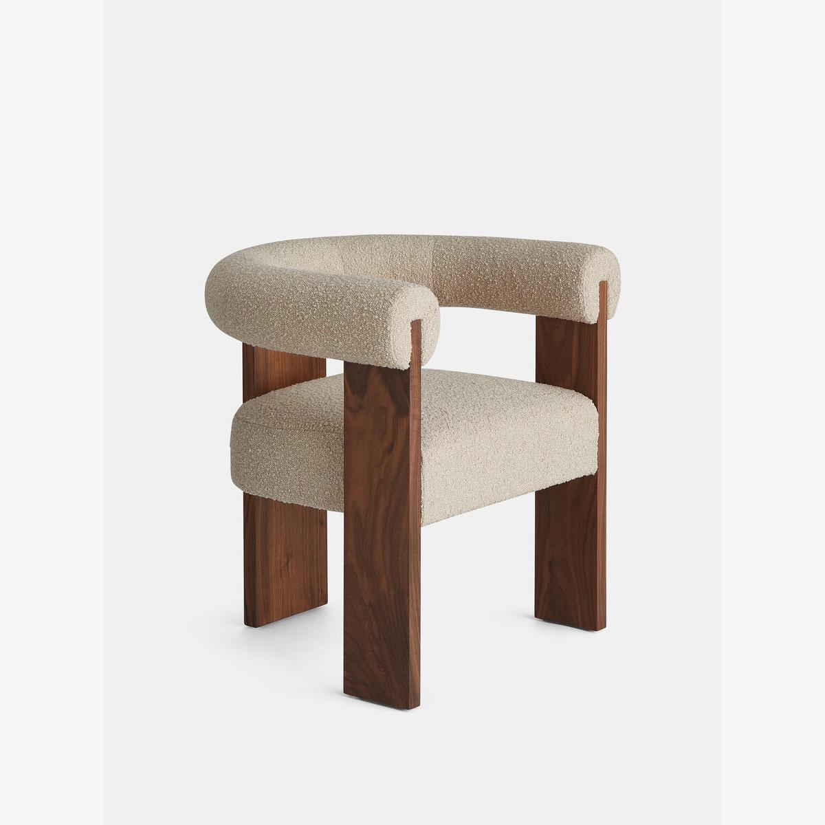 Referencing the vintage shapes at DUMBO House in Brooklyn, our Eldon dining chair is designed for low, relaxed dining. The clean lines of the exposed walnut frame contrast the curves of the tactile boucle. Pair with the Eldon sofa and armchair to bring balance and harmony into your space. Dining chair Boucle upholstery Walnut legs Inspired by DUMBO House