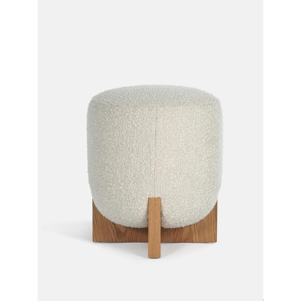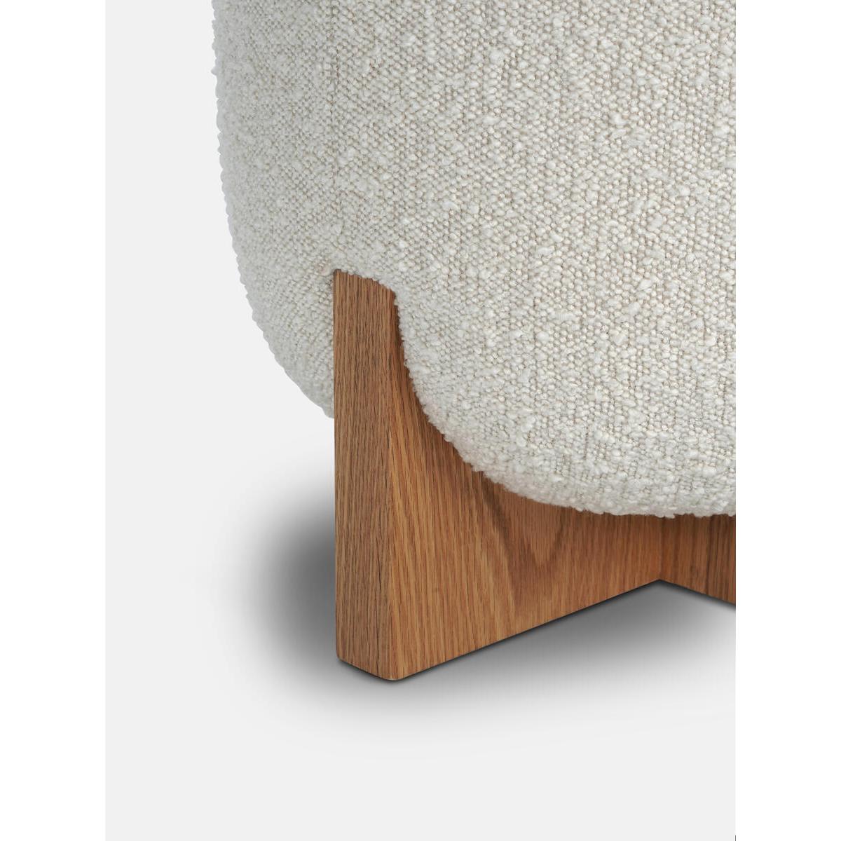 Clean lines give this footstool a compact, contemporary feel,plus a hint of Italian Modernism. Inspired by the interiors atDUMB. O House in Brooklyn, it's perfect for seating extra guests orsupporting a tray of drinks. The oak legs and bouclé upholsteryalso bring warmth and tactility. Bouclé upholstered footstool. Oak legs. Inspired by DUMBO House.