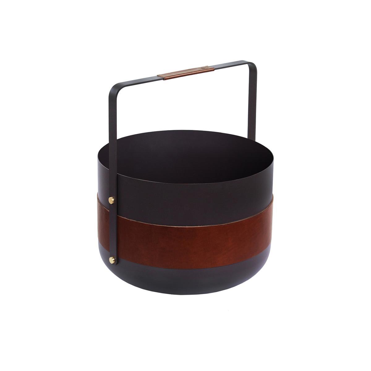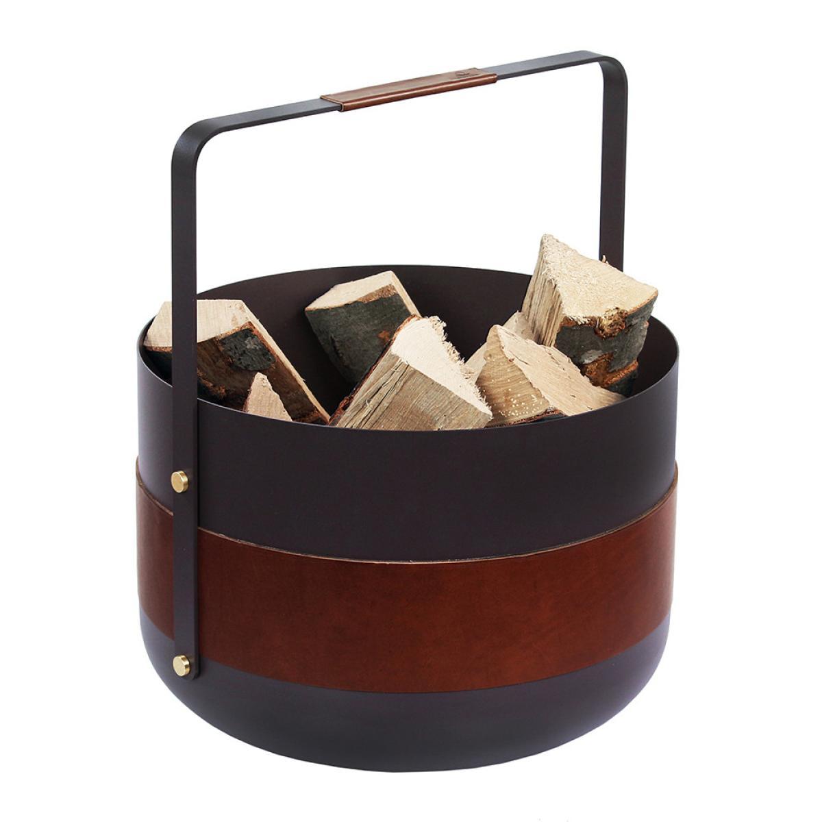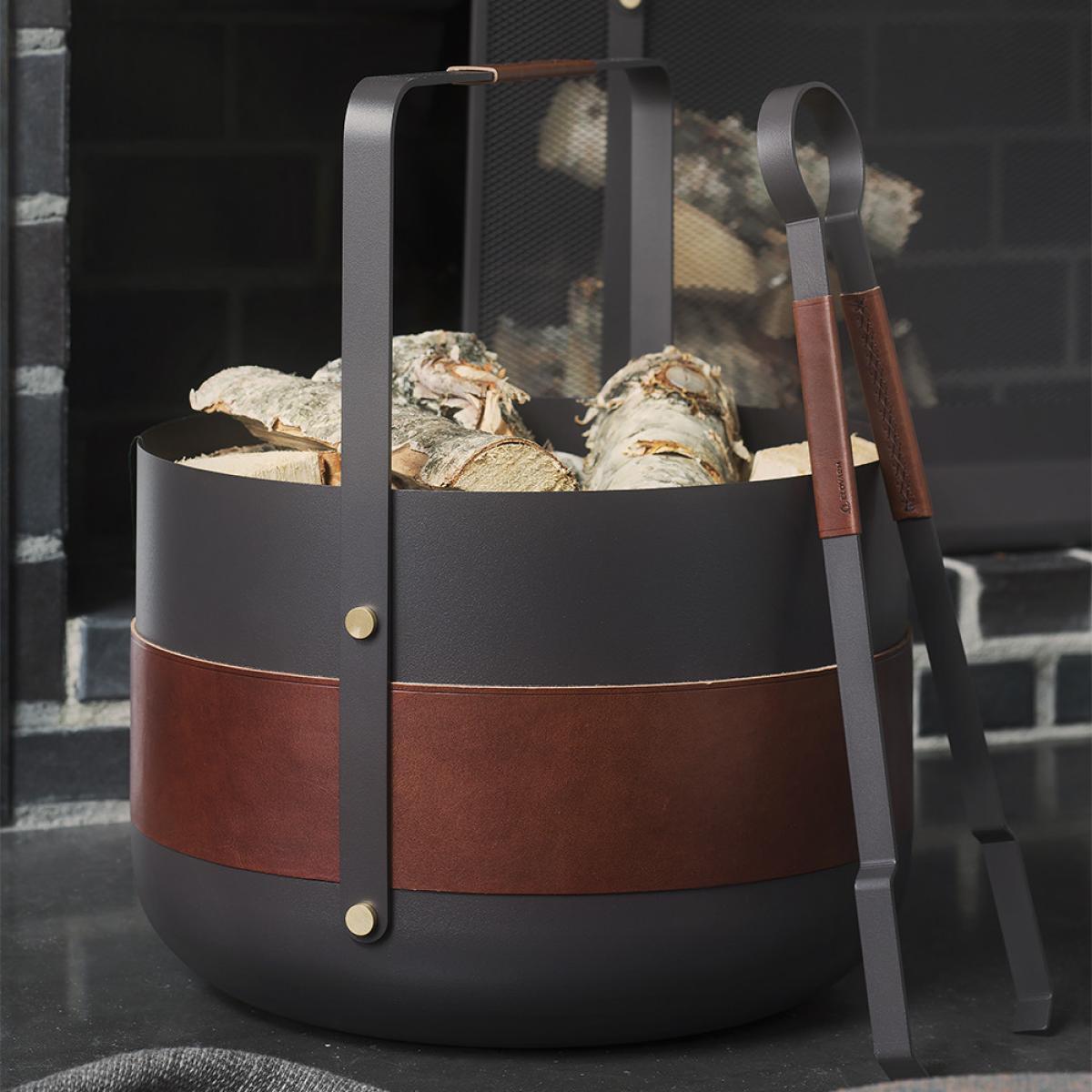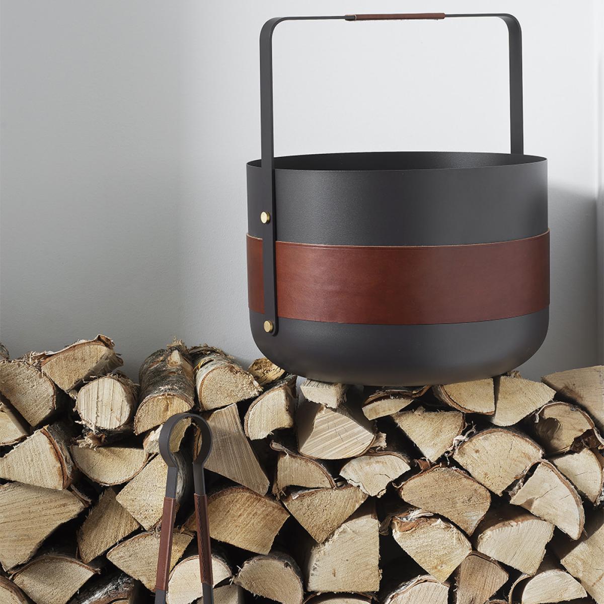Store your spare fireside logs in ultimate elegance with this Emma Wood Basket from Eldvarm. The circular design by Emma Olbers adds a contemporary Scandi feel in any home, with a simple yet luxurious leather band and handle detail. Made from powder coated steel with brass finishing touches, this basket is the perfect addition placed next to the fireplace and wonderfully complements further fireside accessories available separately.