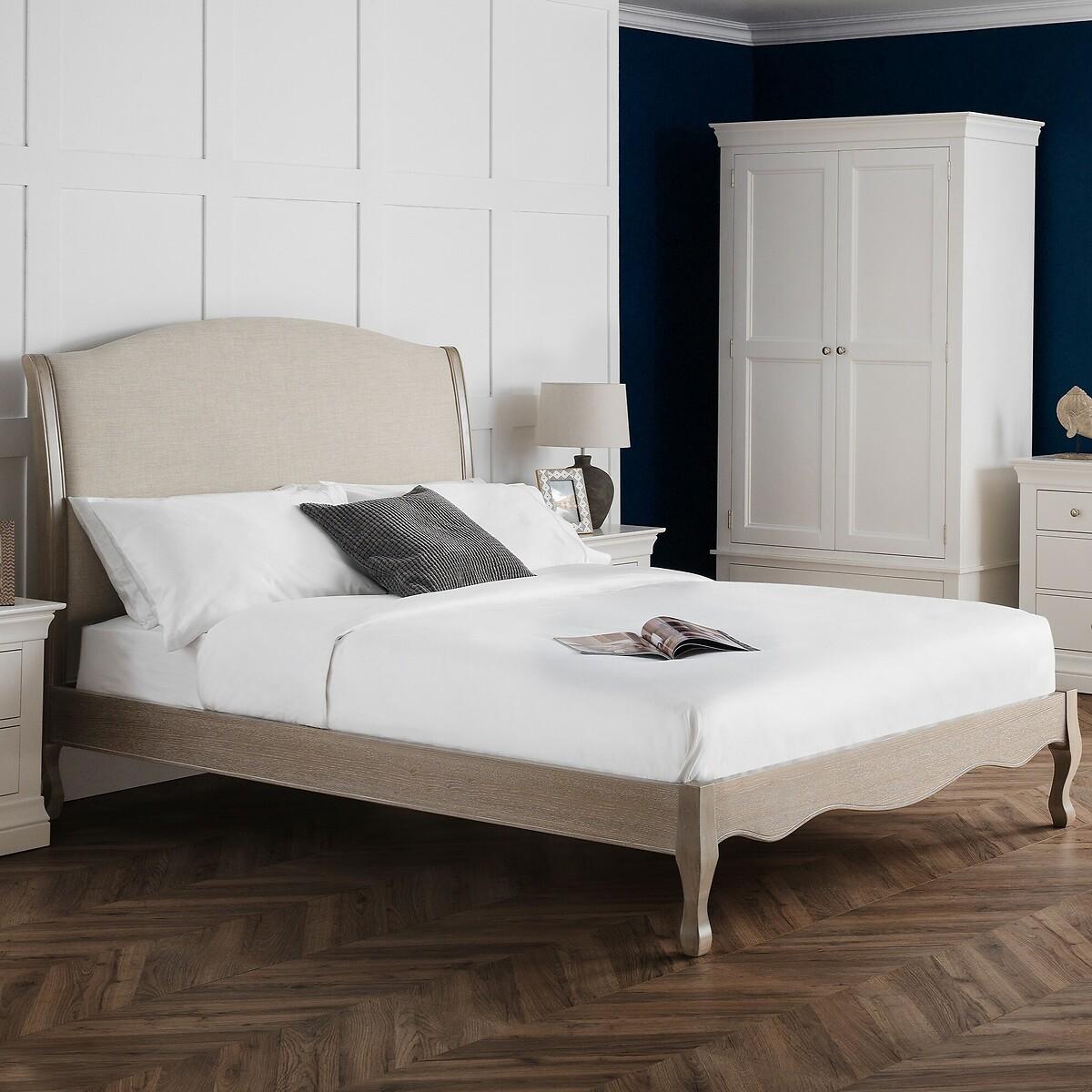Inspired from a classic French design, the Eléa bed excels in elegance. Featuring traditional ornate details, from the curved and arched headboard, to a scalloped footboard with cabriole legs, this bed is the definition of a timeless design. The frame is finished in a limed oak effect, with a soft upholstered headboard covered in an oatmeal linen fabric. Product Details • Linen upholstered headboard • Limed Oak effect frame made from rubberwood • Cabriole legs • Wooden slats included • Assembly required (recommended 2 person) • Fixings supplied • 12 month manufacturers warranty • Compatible with UK standard size double mattresses (190 cm x 135 cm), UK standard size king mattresses (200 cm x 150 cm), and UK standard size super king mattresses (200 cm x 180 cm) • Mattress not included. Product Composition - 50% Wood, 25% Fabric, 20% Foam, 5% Metal. Product Dimensions Double 204.5 cm x 145 cm x 128.5 cm , Weight - 36 KGKing 212.5 cm x161 cm x128.5 cm , Weight - 46.5 KGSuper King 217.5 cm x191 cm x128.5 cm , Weight - 48 KGPackaged Dimensions. Double: Parcel 1 Packaged Dimensions - 152 cm x 135 cm x 17 cm, Weight 19.5 kg Parcel 2 Packaged Dimensions - 201 cm x 20 cm x 13 cm, Weight 16.1 kg Parcel 3 Packaged Dimensions - 152 cm x 42 cm x 14.5 cm, Weight 11.2 kg. King:Parcel 1 Packaged Dimensions - 168 cm x 135 cm x 16 cm, Weight 21 kg Parcel 2 Packaged Dimensions - 209 cm x 20 cm x 13 cm, Weight 16.6 kg Parcel 3 Packaged Dimensions - 169.5 cm x 42 cm x 14.5 cm, Weight 17.9 kg Super King: Parcel 1 Packaged Dimensions - 198 cm x 136 cm x 16.5 cm, Weight 23 kg Parcel 2 Packaged Dimensions - 210 cm x 20.5 cm x 13.5 cm, Weight 16.6 kg Parcel 3 Packaged Dimensions - 200 cm x 42 cm x 14.5 cm, Weight 19.3 kg. This product will be dispatched by one of our trusted suppliers. You’ll be contacted by their selected courier about your delivery. Please note: this product cannot be delivered to all Offshore Islands, Northern Ireland or Republic of Ireland.