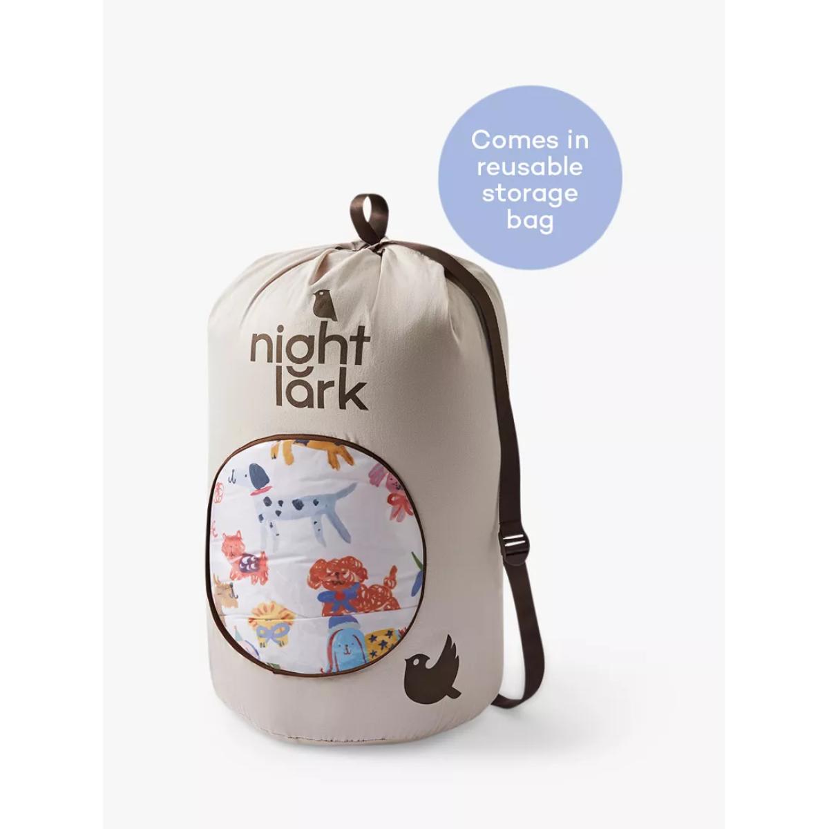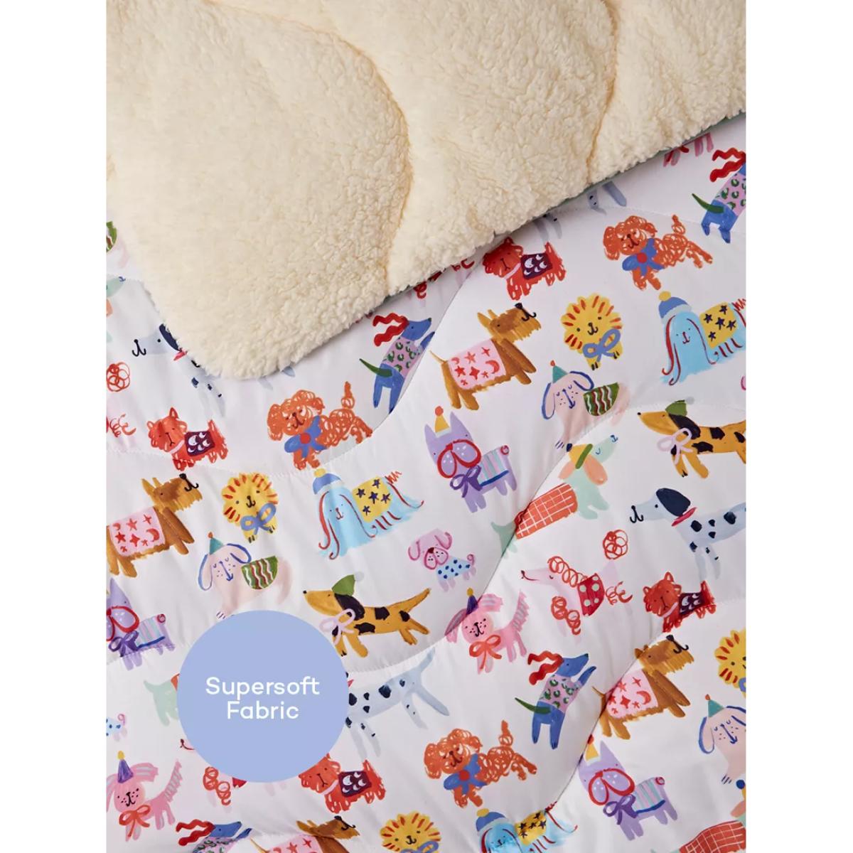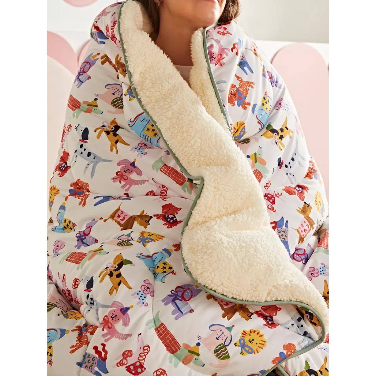 A collaboration between Eleanor Bowmer and Night Lark®, this cosy throw features an iconic Happy Dogs design, showcasing a playful array of dog breeds in a colourful palette. Made with super-soft Sherpa fleece on one side and with a silky microfibre reverse, it will keep you snug throughout winter. Its plush Smartfil® filling is made from recycled PET plastic bottles that will retain its shape, wash after wash, and it's even designed with popper buttons so that you can wrap it around yourself securely when lounging at home. Perfect for dog lovers and great for gifting Designed with popper buttons so it will stay snug around you Easy to squash and wash at home, plus it's quick drying, either by air or tumble dryer Supplied in handy duffle bag for easy storage when the seasons change Made in a B Corp™ certified European Eco Factory in Estonia