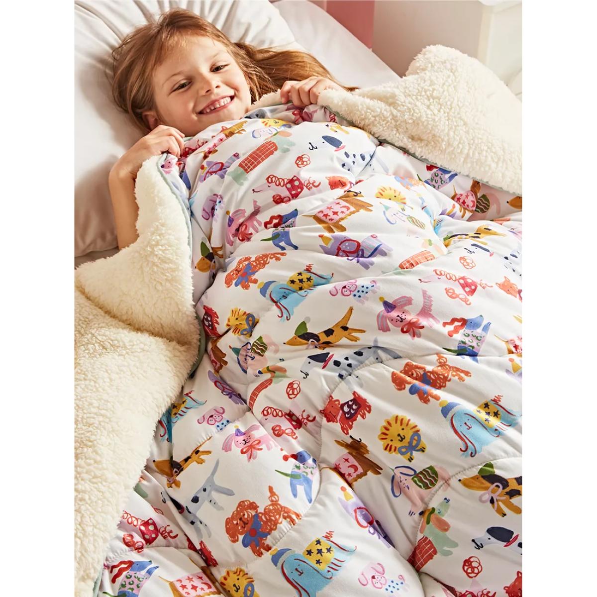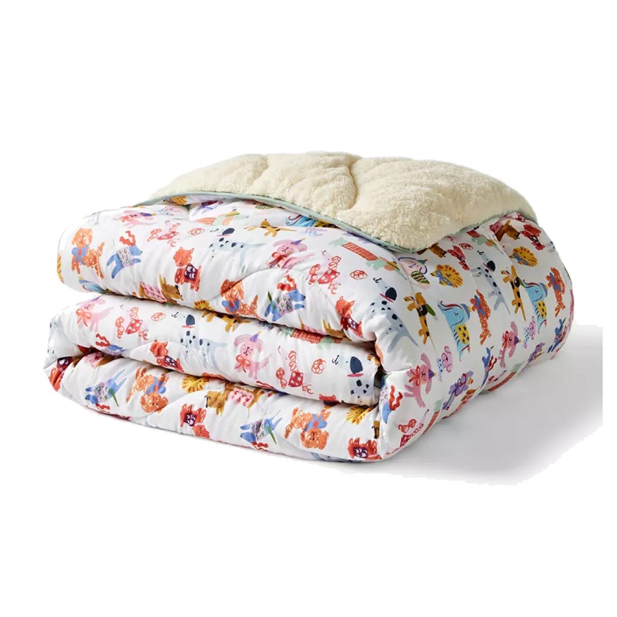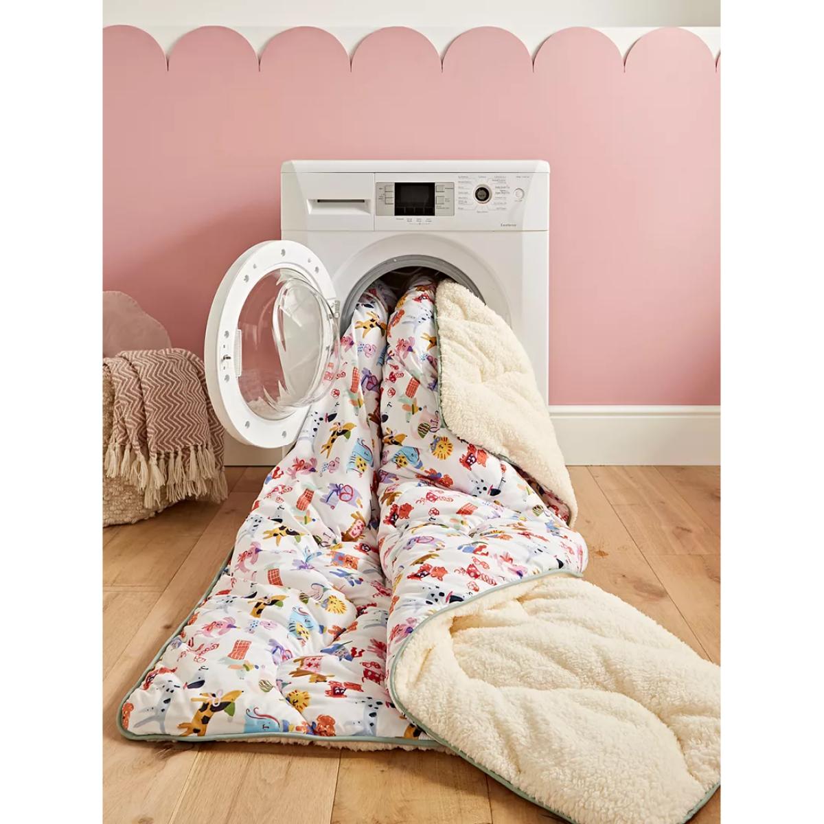 A collaboration between Eleanor Bowmer and Night Lark®, this cosy throw features an iconic Happy Dogs design, showcasing a playful array of dog breeds in a colourful palette. Made with super-soft Sherpa fleece on one side and with a silky microfibre reverse, it will keep you snug throughout winter. Its plush Smartfil® filling is made from recycled PET plastic bottles that will retain its shape, wash after wash, and it's even designed with popper buttons so that you can wrap it around yourself securely when lounging at home. Perfect for dog lovers and great for gifting Designed with popper buttons so it will stay snug around you Easy to squash and wash at home, plus it's quick drying, either by air or tumble dryer Supplied in handy duffle bag for easy storage when the seasons change Made in a B Corp™ certified European Eco Factory in Estonia