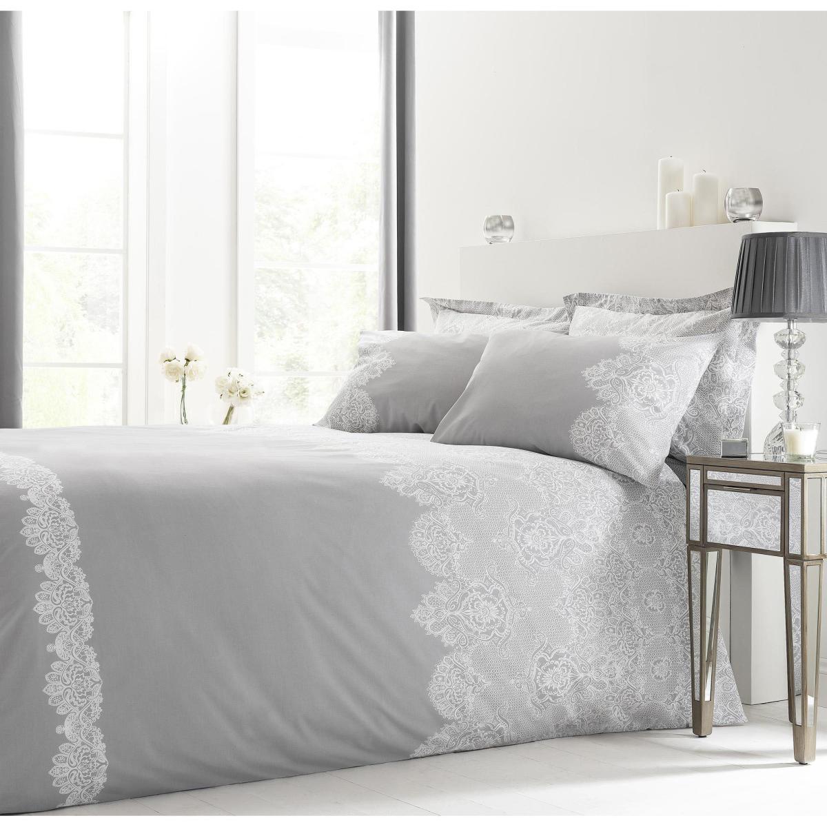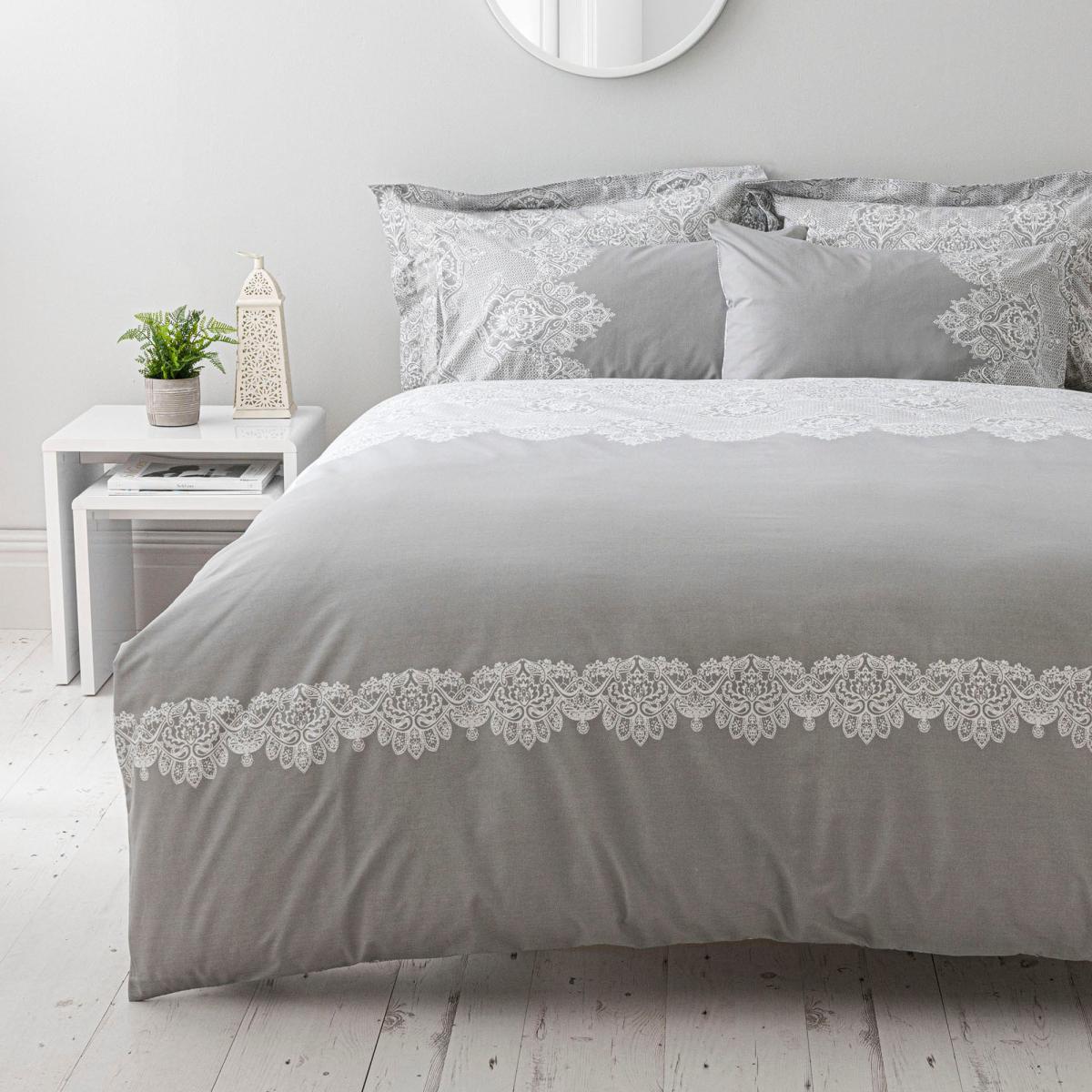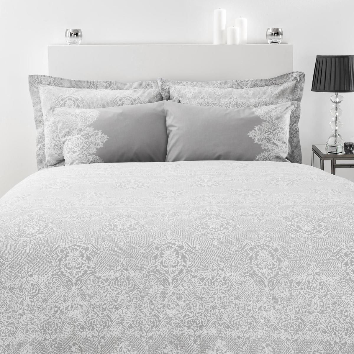 Featuring a pretty lace print in a modern grey colourway, this duvet cover set is crafted from a practical and durable blend of polyester and cotton requiring minimal ironing. Reversible to change the look of your room easily, it's available in a variety of sizes and has a coordinating oxford pillowcase in the range.