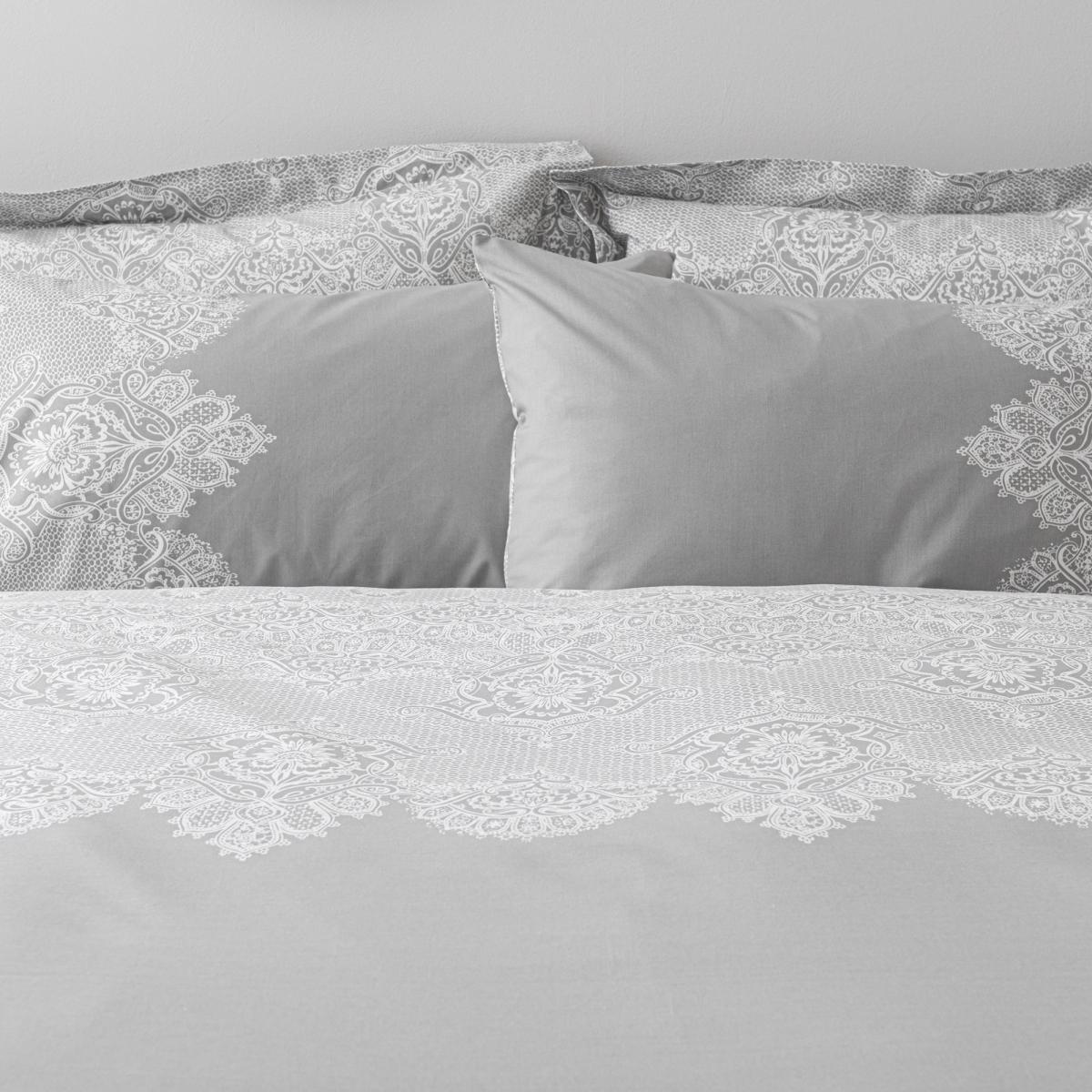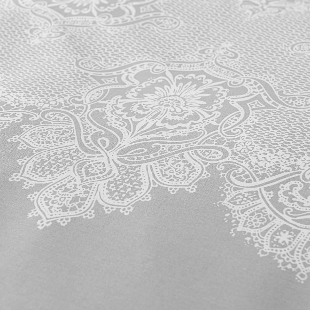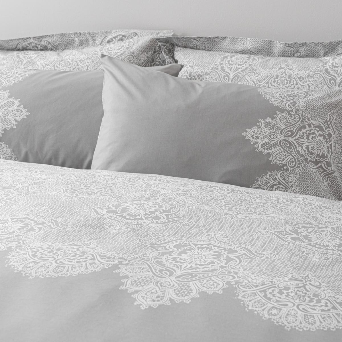 Featuring a pretty lace print in a modern grey colourway, this duvet cover set is crafted from a practical and durable blend of polyester and cotton requiring minimal ironing. Reversible to change the look of your room easily, it's available in a variety of sizes and has a coordinating oxford pillowcase in the range.