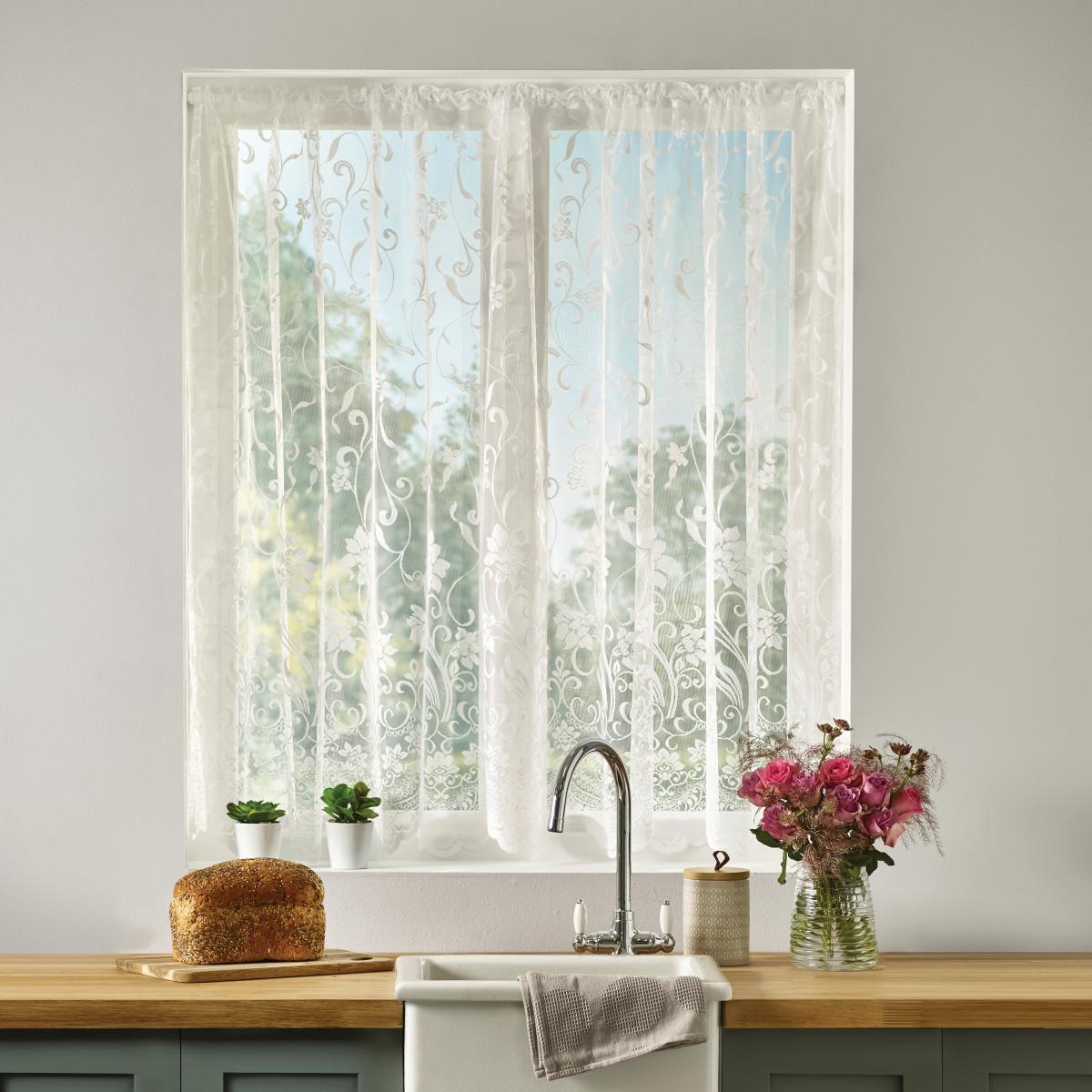 I love this net curtain for its delicate lace pattern and crisp white colour, which add a subtle touch of elegance without overwhelming the room. It works especially well in classic or country-style interiors, though it can also soften modern minimal spaces when layered with blackout or plain curtains. Practical styling tips include pairing it with slightly heavier drapes for privacy and insulation, or using it alone to maximise natural light while maintaining a light, airy feel. It’s versatile enough to suit kitchens, living rooms, or bedrooms, especially when you want to introduce a gentle, traditional touch.