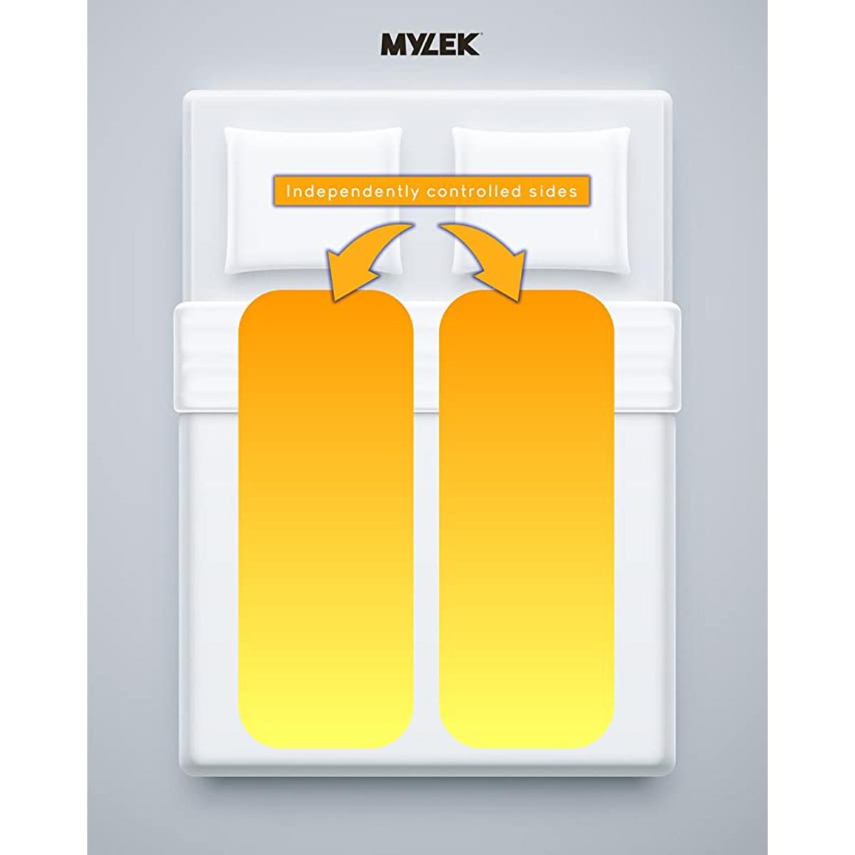 An easy-to-use premium fleece electric blanket with dual controls and a choice of 3 heat settings. The detachable (allowing the blanket to be machine washable at 30o. C) dual controls allow each user to choose their own individual heat setting with an ultra-fast heat-up time. Super soft cosy fleece finishes with extra foot warmth - great for those who suffer from cold feet or circulation problems. Fully fitted deep elasticated skirt to ensure a secure fit to your mattress with thin non-obtrusive wires for a super comfortable undisturbed sleep. All Mylek Electric Blankets are safe for all night use, are CE certified and are RoH S compliant to the highest UK standards by a European Recognised Testing House with a Built-In Advanced Overheat Protection System and Automatic Safety Shut Off for your peace of mind.