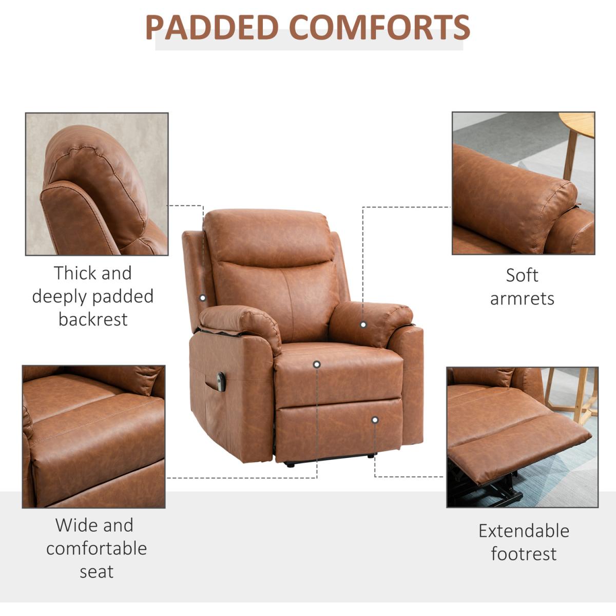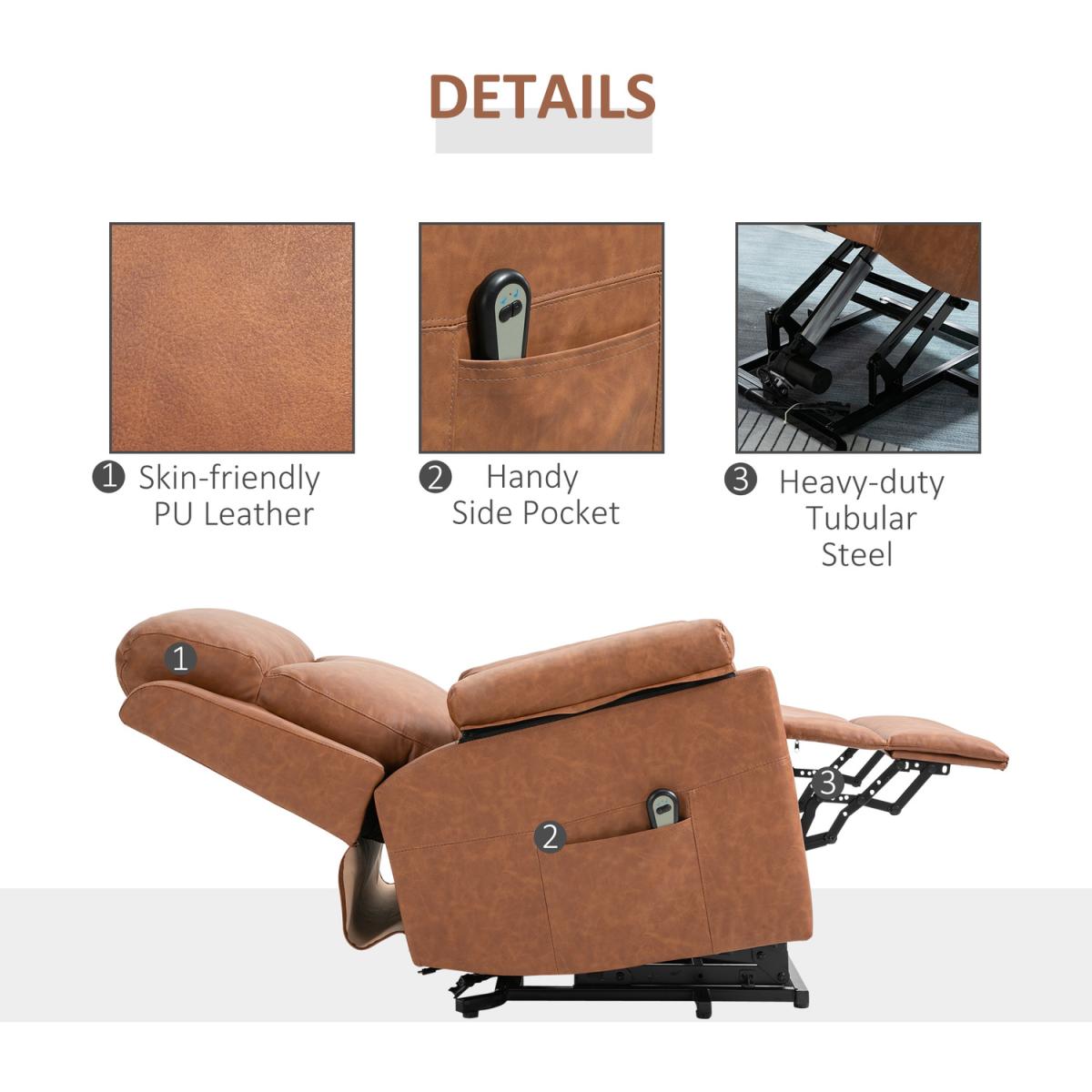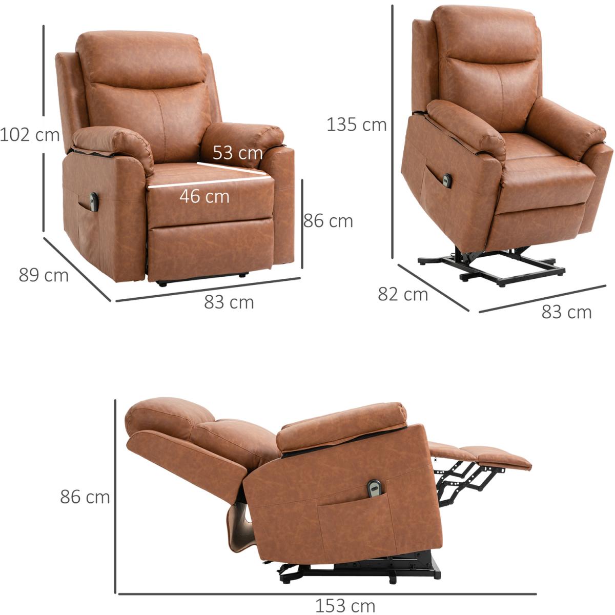 I’m a fan of this brown lift chair for its straightforward blend of comfort and ease of use - the electric mechanism is discreet and the cushioning feels supportive without looking bulky. It sits comfortably in both modern and transitional schemes, pairing well with neutral walls and warm wooden accents. To style, position it as a reading nook beside a slimline floor lamp and a simple side table in oak or ash. A textured throw in a muted shade and a small patterned cushion will soften the leather look without overpowering it. Keep surrounding décor minimal so the chair remains the practical focal point.