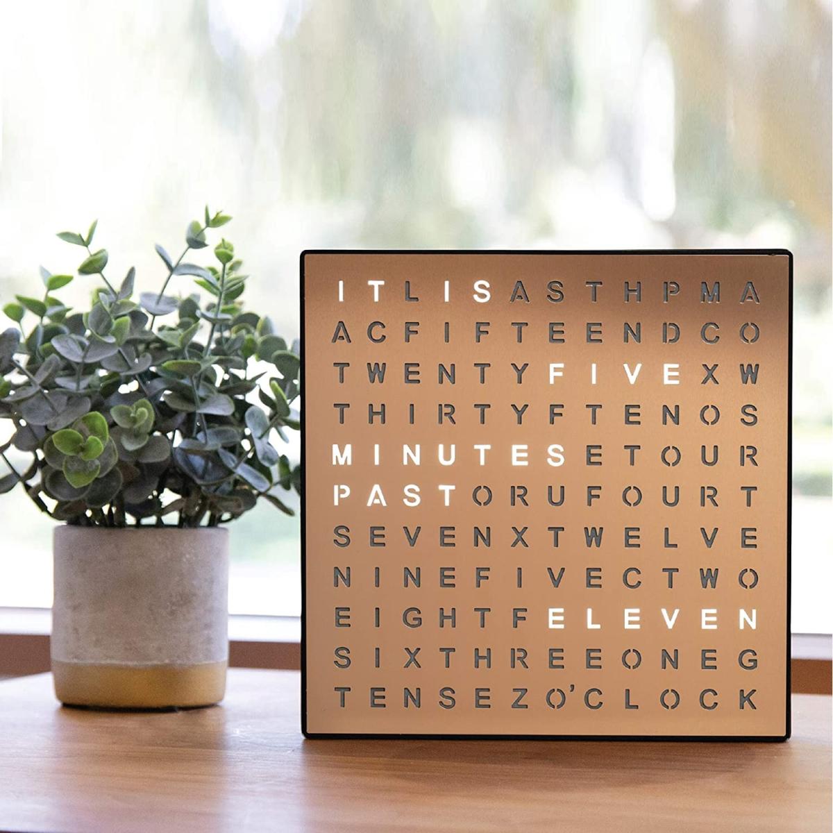 Gr8 Home Electronic Copper Black Led Light Up Word Clock Square Battery Powered Wall Desktop Bedside Desk Letter Time Clock. A Unique and Fun Way Of Telling Time. The Clock Appears To Be Nothing More Than A Jumble Of Letters,But When The Clock Lights Up, Words Appear Among The Scrambled Letters To Tell The Time. The Clock Tells Time In Intervals Of Five Minutes And Is A Refreshing Change From Traditional Analog Or Digital Displays. Stylish and Functional. Elevate Your Space with the Word Clocks Sophisticated Copper Black Finish, Light up Letters, And Clock Compact Design. At Nearly 8 inch Square, The Clock Is Large Enough To Capture Attention, But Small Enough To Integrate Into Any Home Or Office Space. Its The Epitome of Form and Function. Product Size: 20x20x3.5cm, Item Weight: 375g, Power Supply: 3 x AA Batteries (Not Included) Or USB powered DC 5V (not included), Led Lock Displays Time Using Light Up Words