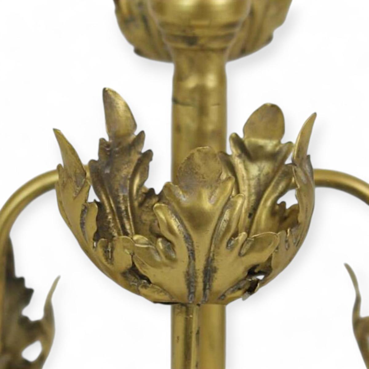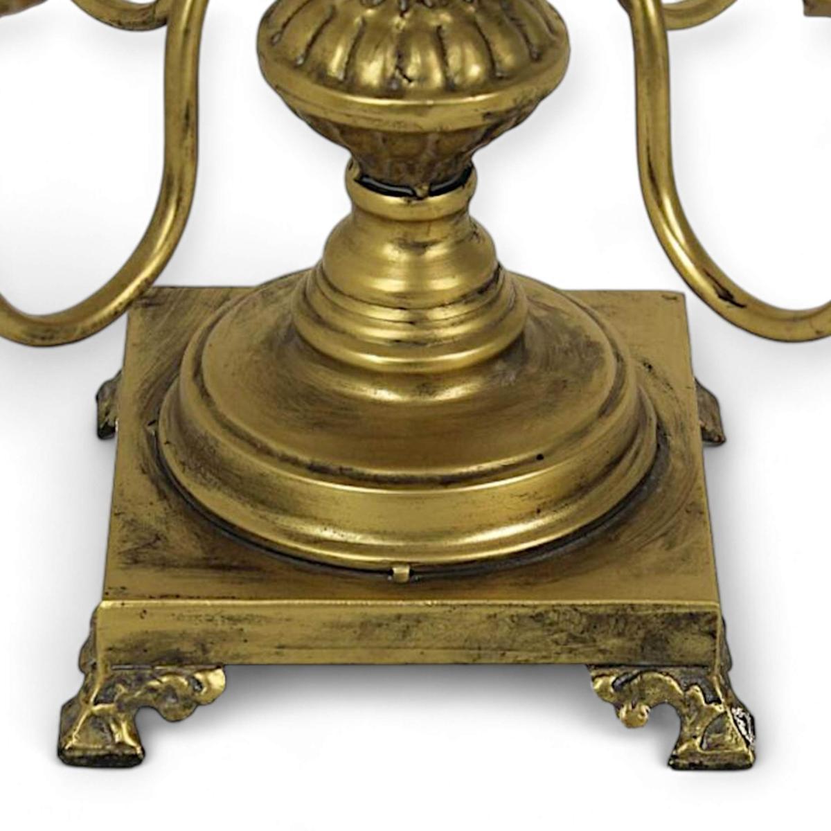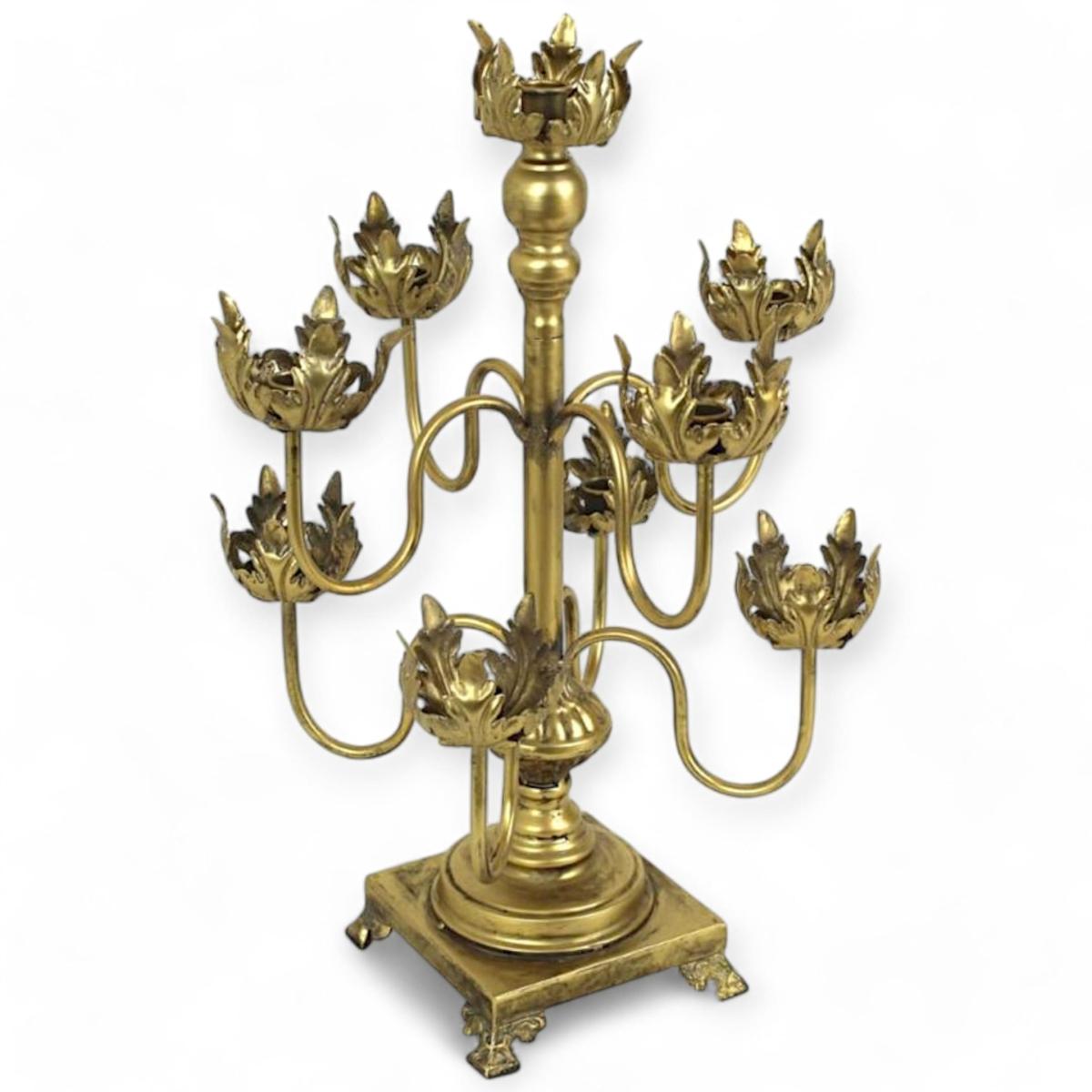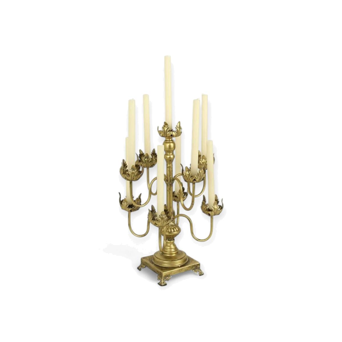 Elevate your décor with the Elegant Golden Flourish Candelabra. This striking piece boasts eight intricately designed arms, each culminating in a leaf-like bobeche and a central column that holds an additional candle. Picture the soft glow of candlelight highlighting the exquisite details of this candelabra, creating an ambience of refined elegance.