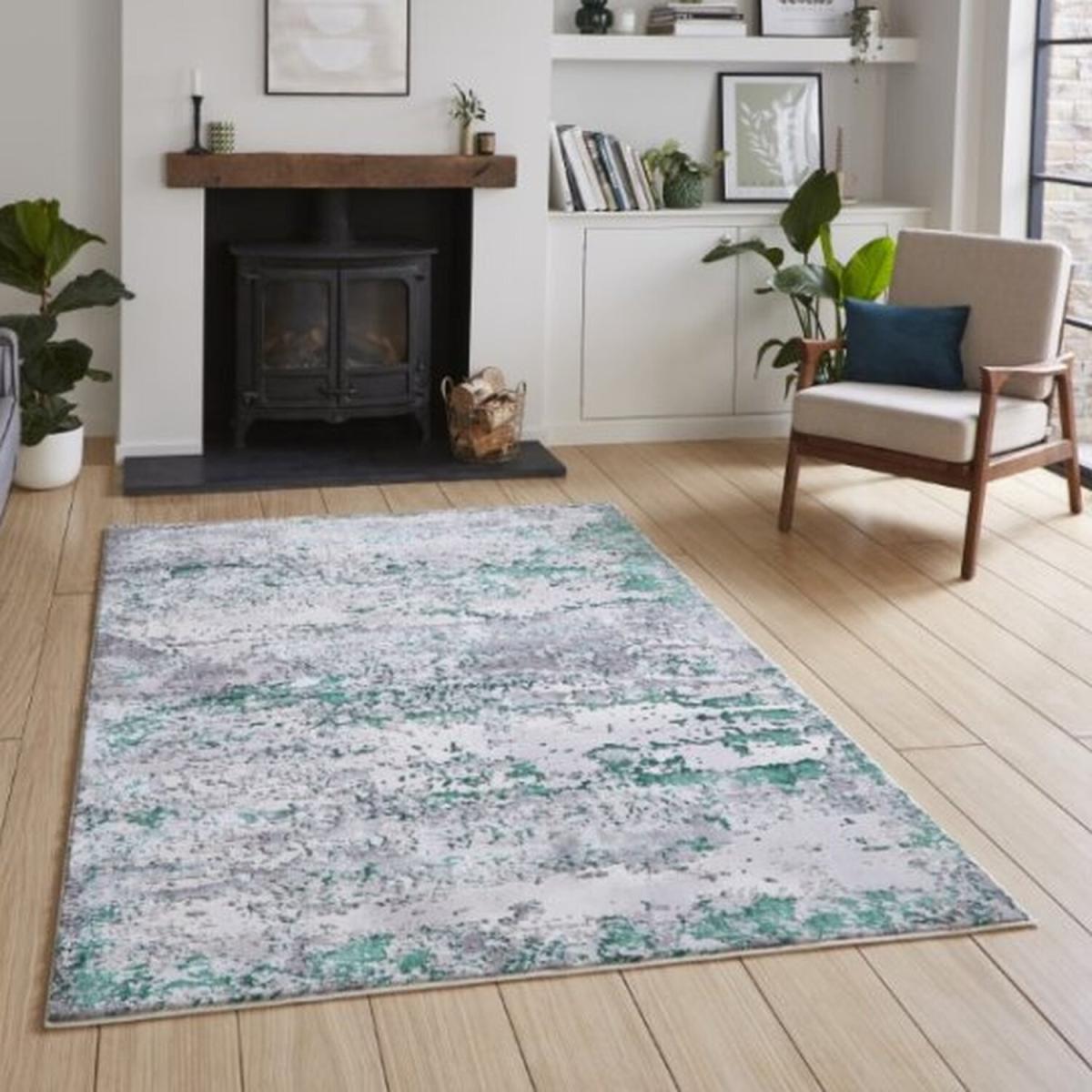 The green metallic abstract rug is a versatile piece that can add a contemporary edge to both modern and eclectic interiors. I love its subtle metallic sheen, which brings a touch of sophistication without overwhelming the space. It works particularly well in neutral-toned rooms, providing a pop of colour and texture that can tie together elements like soft furnishings or houseplants. For practical styling, pair it with simple furniture in natural wood or muted tones, and keep accessories minimalist to let the rug be the focal point. Its size makes it perfect for creating a cozy vignette in a lounge or a reading nook, adding visual interest while maintaining a relaxed vibe.