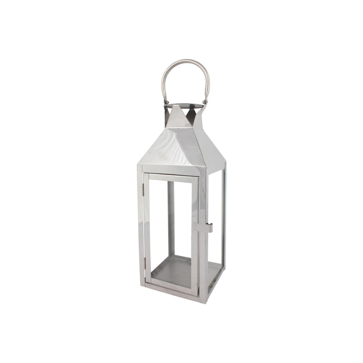 This beautiful silver lantern is great for use both indoors and out. Please note it is advisable to bring this item in from the garden overnight. The lantern features a chunky metal handle and glass display windows which allows you to see inside the lantern. Candle not included.