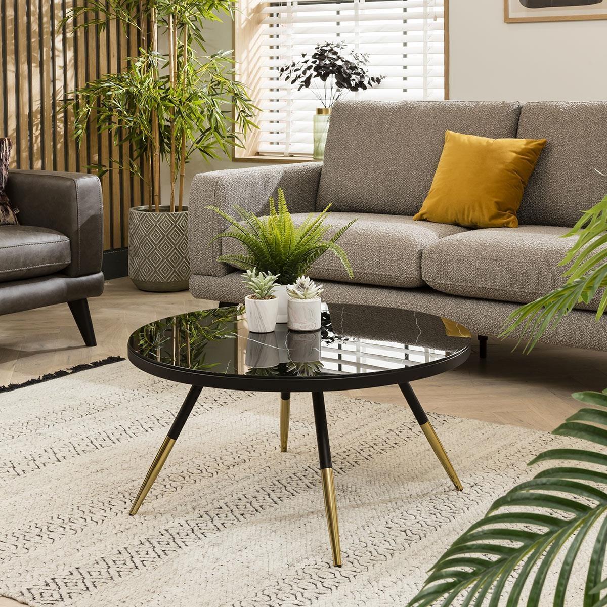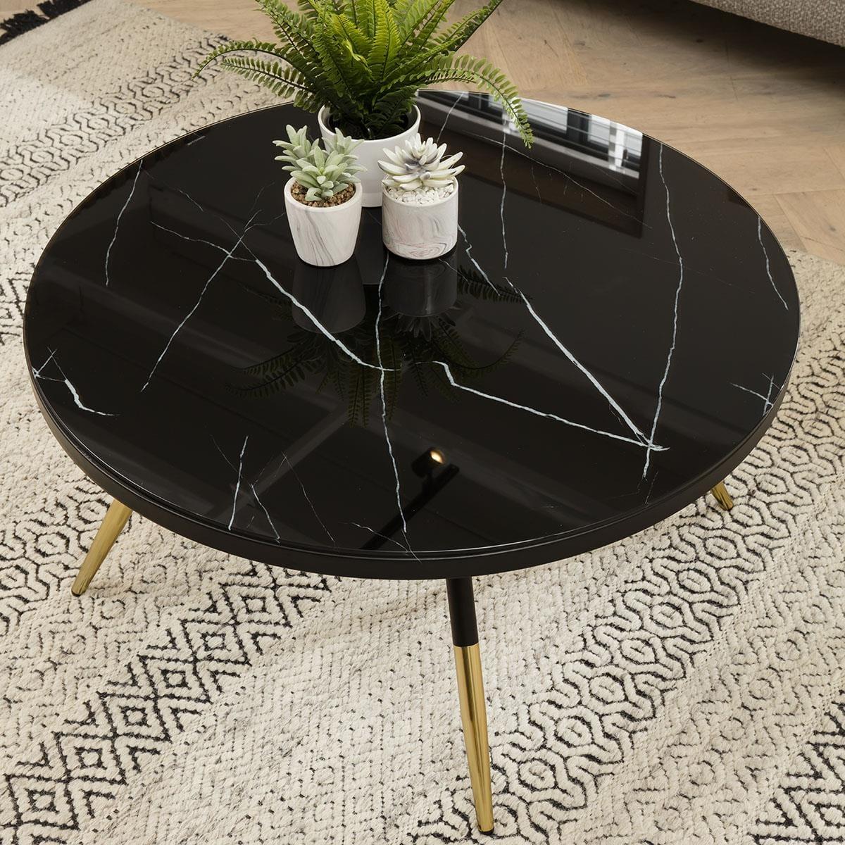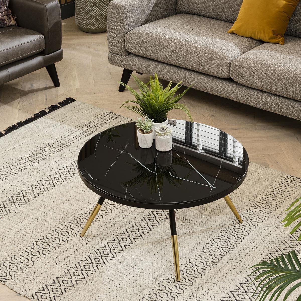 Boasting a breathtaking round black marble top with white veining adding a tonal contrast, the Clements coffee table is a real statement piece for any living space. Featuring a thick black metal table top in powder-coated black, this round coffee table is our interpretation of an eternal classic. The top is supported by four angled and tapered metal legs. The tip of each leg features a golden metallic finish, adding a touch of elegance to this statement coffee table. If you need more information about this product, use the Live Chat service to speak to the team or send us a message. Spread the cost our with interest-free finance options. Minimum spend applies. W80cm D80cm H40cm Round Metal Coffee Table with Black Marble-Effect Top The coffee table has splayed metal legs with golden tips
