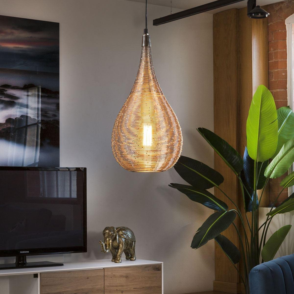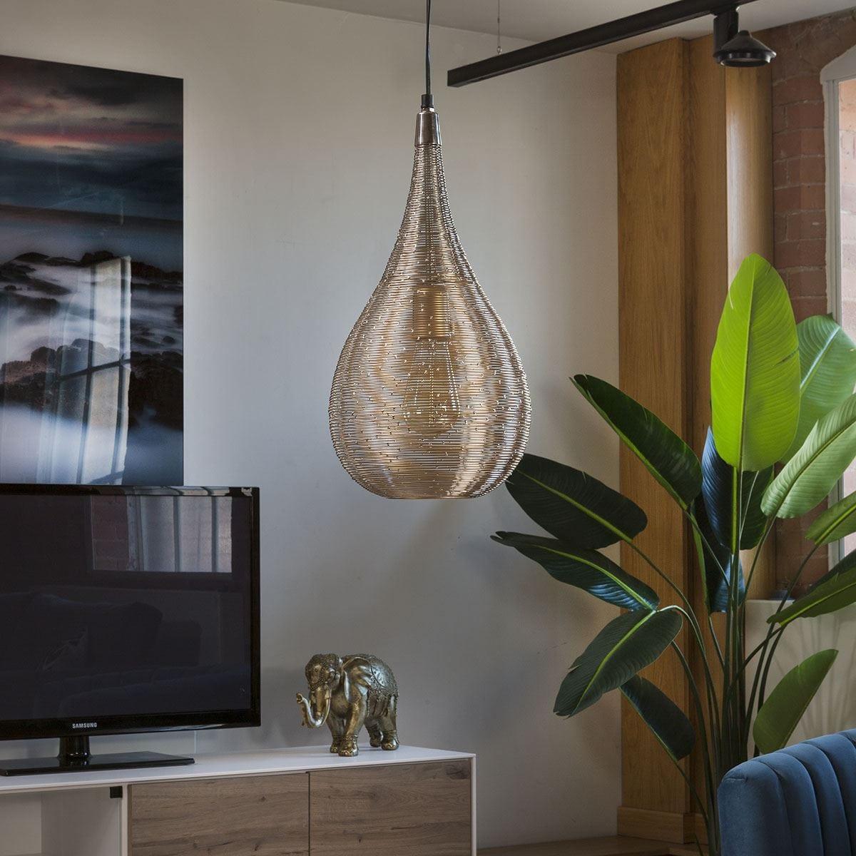 A lamp can bring so much more than light to a room and our Coil Lamps and Pendants do just that. Mild steel wire is carefully wrapped around a teardrop shaped frame, and then held in place with a beaded weld. Nickel plated to create a shimmering, atmospheric light, the inside of the lamps are sumptuously gold coloured for a rich, warm glow. W23cm D23cm H43cm Bulbs Included Fully Assembled
