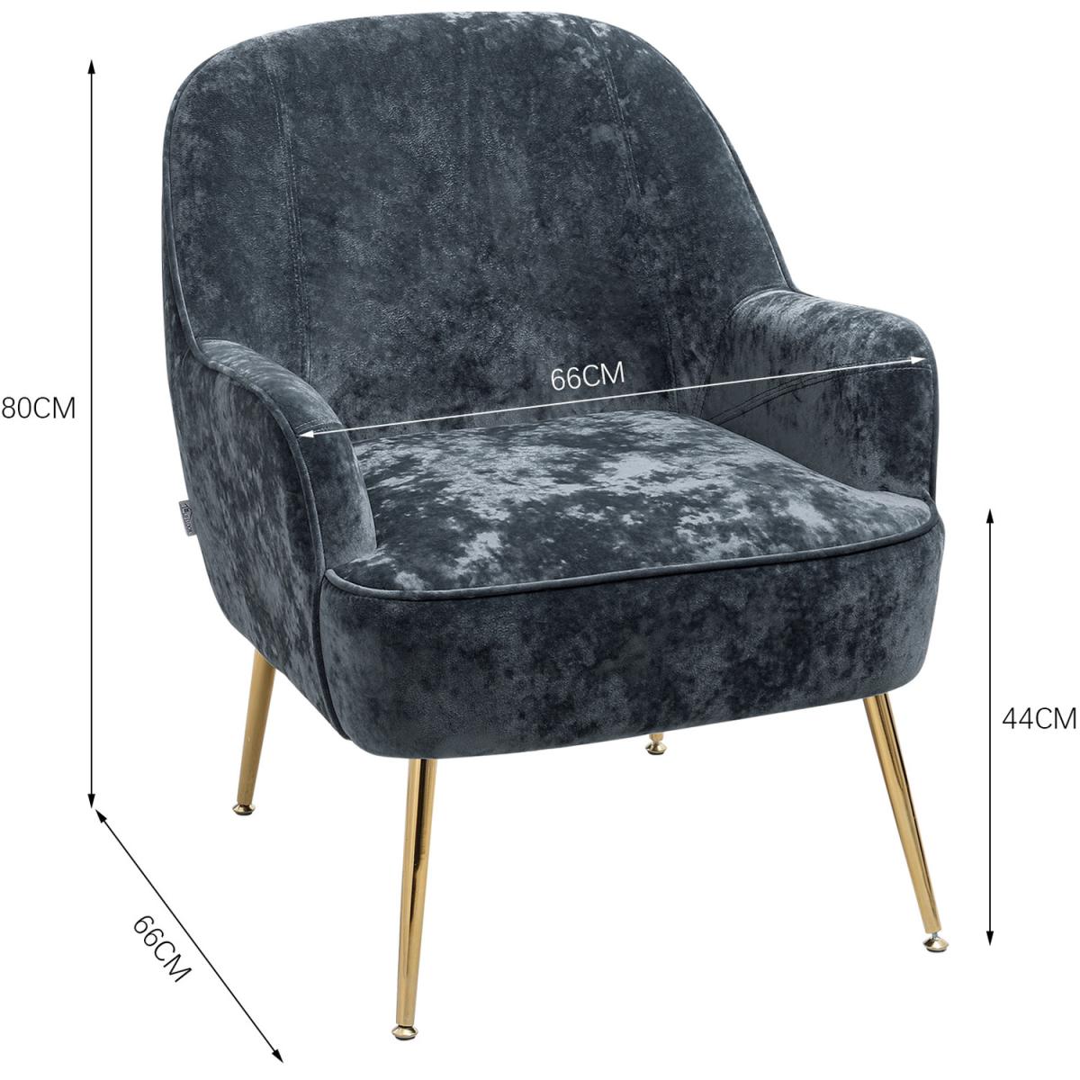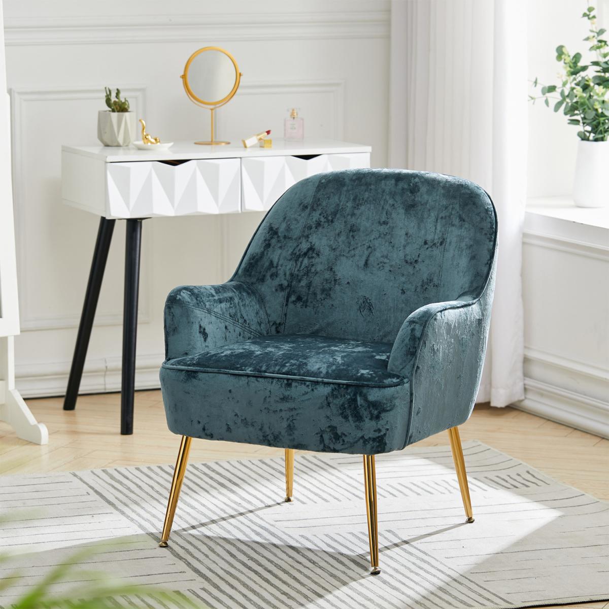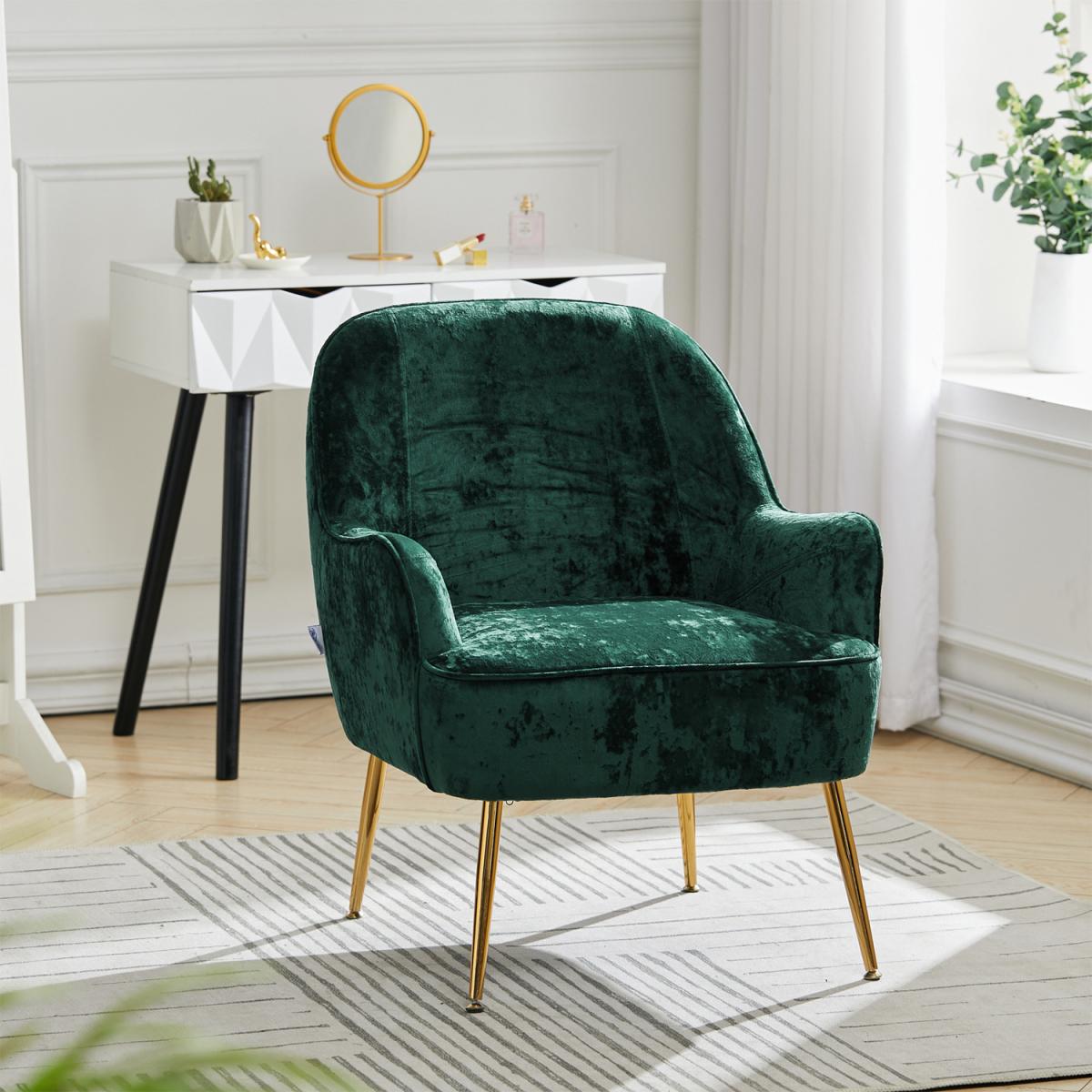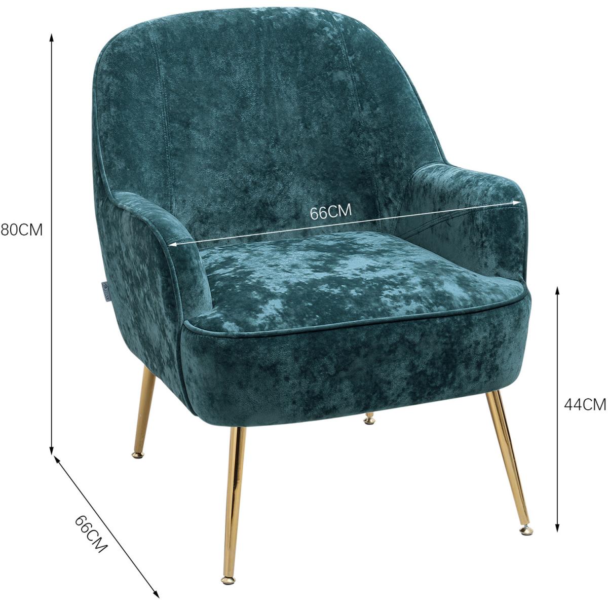 Introducing our Velvet Armchair with Gold Legs, a leisure accent chair perfect for elevating the ambience of your living room or cafe.1. Visual Appeal Meets Comfort:This upholstered accent chair combines stunning visuals with comfortable seating, thanks to its padded seat, ergonomic inclining backrest, and neatly designed armrests.2. Effortless Elegance: Featuring an elegant style, meticulous stitching details, and sleek metal legs with a gold finish, this chair adds a touch of sophistication to any room.3. Neat and Tidy: Crafted with quality fabric and piped edges, this chair boasts a clean and polished finish, enhancing its overall aesthetic.4. Ergonomic Design:The inclining backrest is designed for ergonomic support, ensuring your comfort during extended periods of relaxation.5. Easy Assembly: Follow the provided instructions for a hassle-free assembly process, so you can enjoy your chair in no time.6. Simple Maintenance: Keeping your chair spotless is a breeze - just wipe it clean with a soft, dry cloth to maintain its pristine appearance. Whether it's in your living room, dining room, home office, or a cosy corner, this velvet armchair is as perfect for your personal space as it is for your cafe's ambience. Upgrade your seating experience with this blend of style, comfort, and quality craftsmanship.