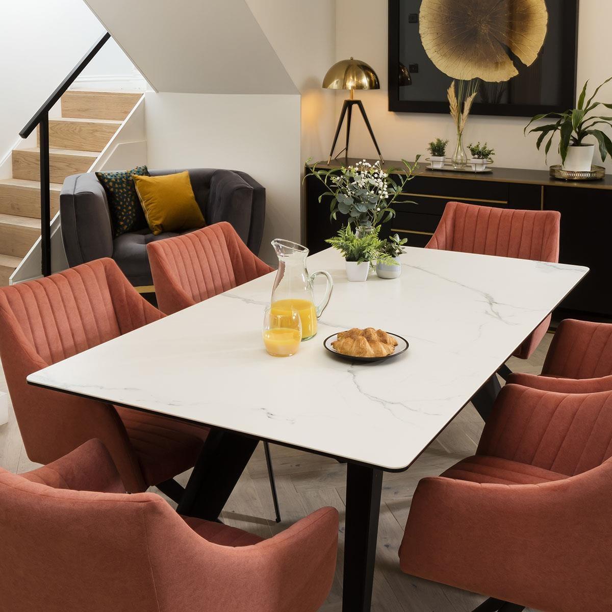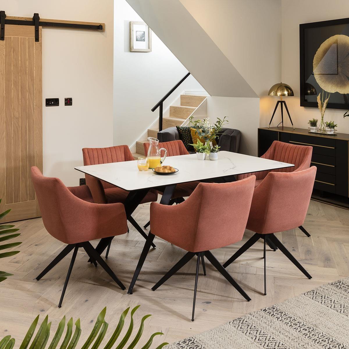 Anchor your dining ensemble in designer fashion with this stunning marble effect ceramic glass top dining table, ideal for both upscale dinner parties and casual morning meals. The table features tempered glass with a smooth 3mm imported white ceramic finish with beautiful grains that compliments a geometric base. The whole construction is placed on rough black powder coated metal legs that reinforce the contemporary look of the product. Boasting a rectangular silhouette, the 6 seater 160cm dining table provides ample space to entertain your friends and relatives. This modern swivel carver chair is a real gem at the dining table with their medium-high backrests and soft armrests, ensuring particularly high comfort. Its unique cocooning shape lets you sit back snugly, while channel tufted pink fabric upholstery and foam cushioning ensure you'll want to stay. The chair is upholstered with a premium fabric and has a black powder coated base - both fit perfectly in any modern interior. For an added touch of practicality, the swivel seat allows for seamless socialising. Elegant yet edgy, this chair is sure to add a very luxurious and rich appearance to any dining room. W200cm D90cm H76cm Hard wearing ceramic tabletop Set includes the dining table and 6 chairs