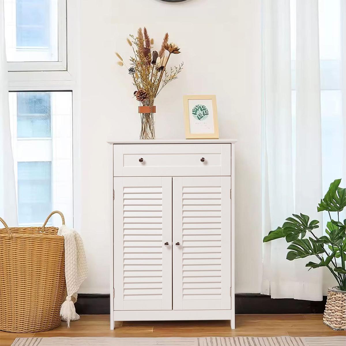 Part of the White Shutter Series, this sideboard cabinet brings ample storage and modern style to your home. It includes a spacious drawer with two metal knobs and a cabinet with shutter doors, ideal for storing tableware, essentials, and small appliances. The countertop is perfect for showcasing vases, aromatherapy, or artwork, creating a clean and inviting atmosphere.