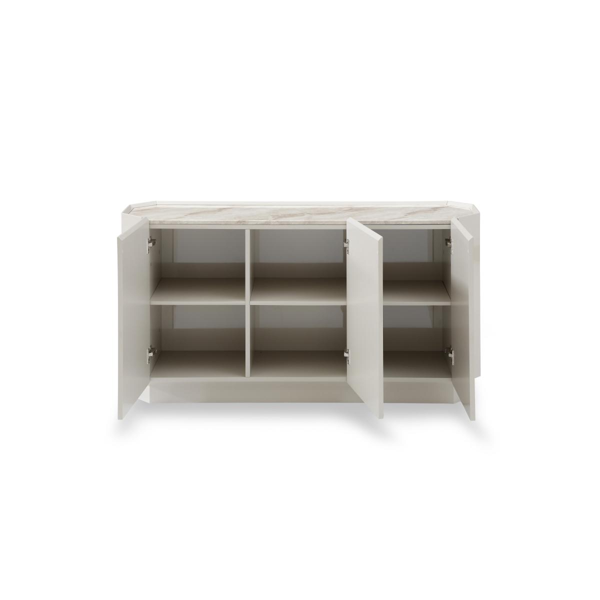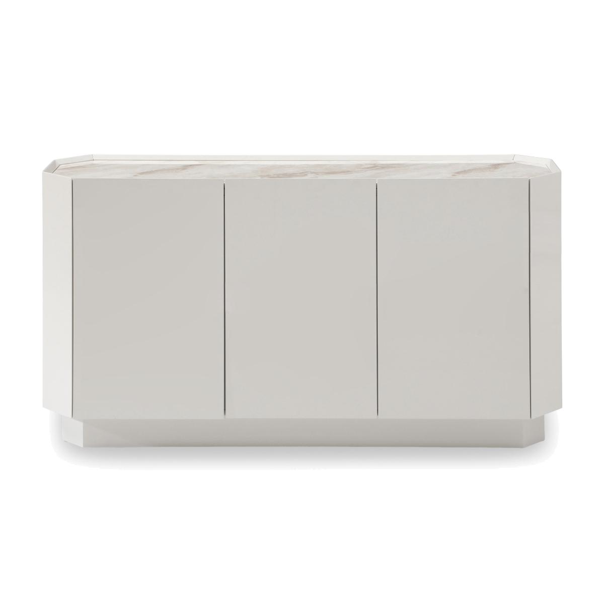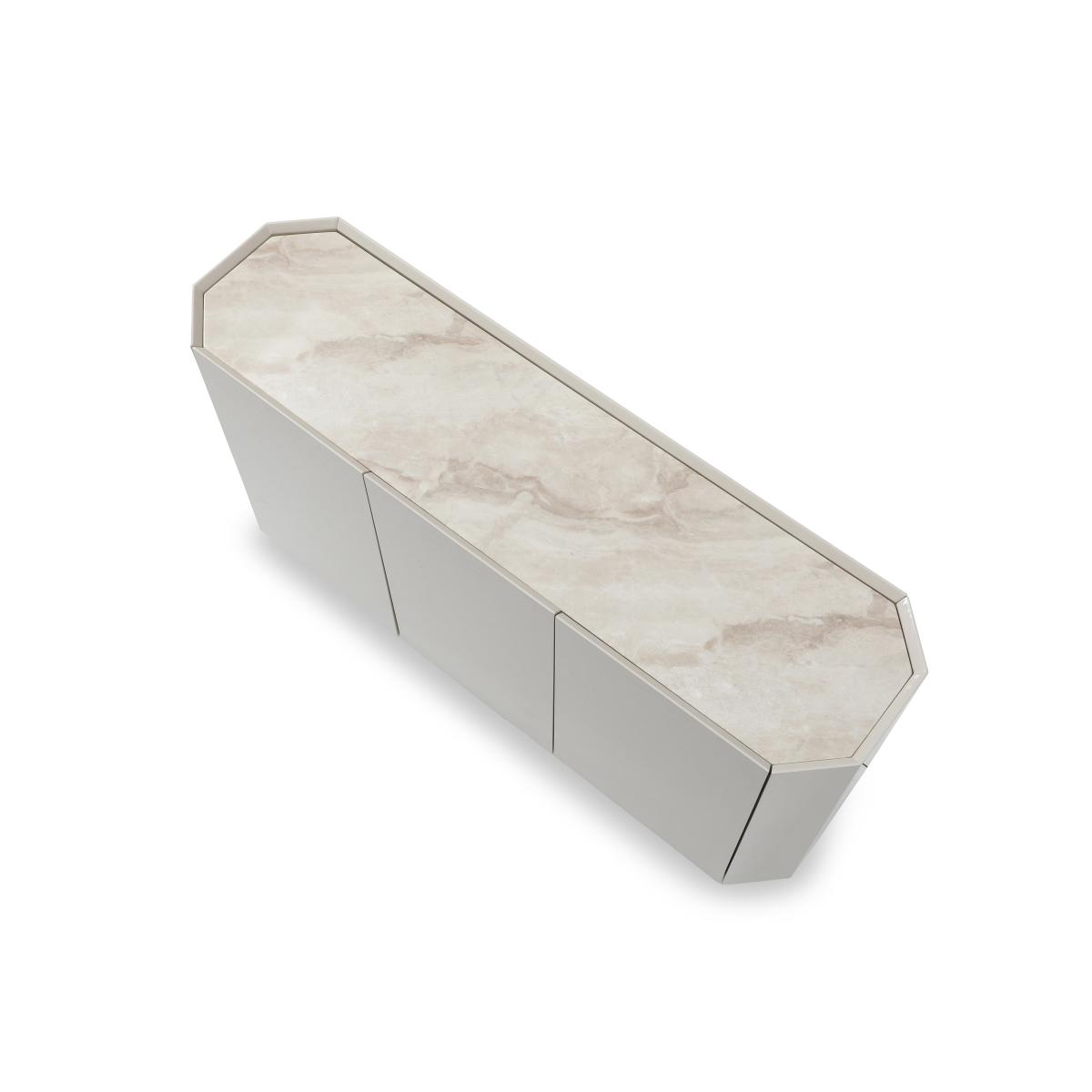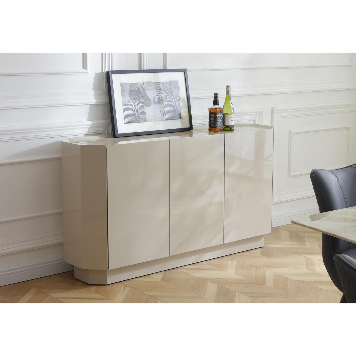Luxurious, opulent, exquisite – our Elegante collection of marble furniture is all this and more. Or perhaps we should say less. Incredibly well-priced, this range makes the beauty of natural marble furniture a real option for more homes. Showcasing bold sculptural lines, authentic marble patterning and a sophisticated neutral colour palette, the collection is designed to enhance and elevate the aesthetic of any modern home. This carefully curated collection includes two sizes of dining tables, dining sets, a sideboard, occasional tables and dining room seating. The Elegante range is exclusively available at Furniture Village. All the opulence of marble furniture is yours with our simply stunning and very well-priced Elegante range. This octagonal three-door sideboard has a beautiful glossy marble top. Why you'll love it Crafted from real marble, this sideboard takes centre stage in any home. Authentic style, elegance and grandeur at an exceptional price. This octagonal sideboard has an on-trend taupe frame. Marble top has a high-gloss, marbled resin finish. A stunning recreation of authentic marble patterning in an on-trend neutral palette. Carefully crafted to preserve and protect the marble’s natural beauty. A Furniture Village exclusive. This 3-door sideboard is part of our Elegante range. What you need to know Marble top. 2 cupboards each with an adjustable shelf. Marble is hardwearing but not indestructible, so it’s important to care for it properly. Spillages need to be removed immediately. To clean, wipe gently with a damp cloth using warm water, then buff dry. We recommend that you use coasters and placemats to protect against heat and moisture. Do not use knives to cut food on a marble table top, use as a work top, place heavy weights on the table or use acidic or abrasive cleaners. You should never sit or stand on a marble surface. For more advice on caring for your marble furniture, see our Dining care guide. WARNING! Item code: ELGE3DSB--001