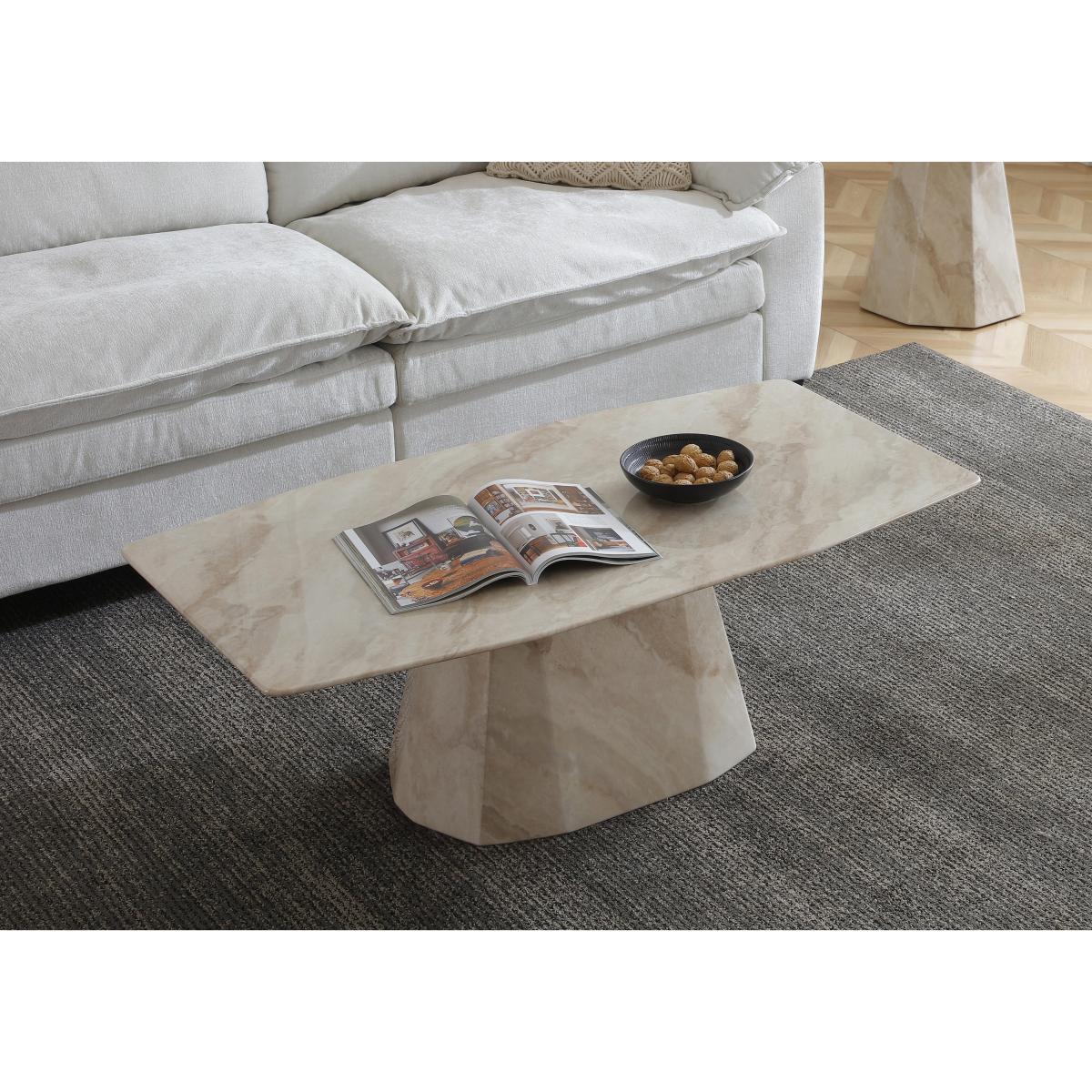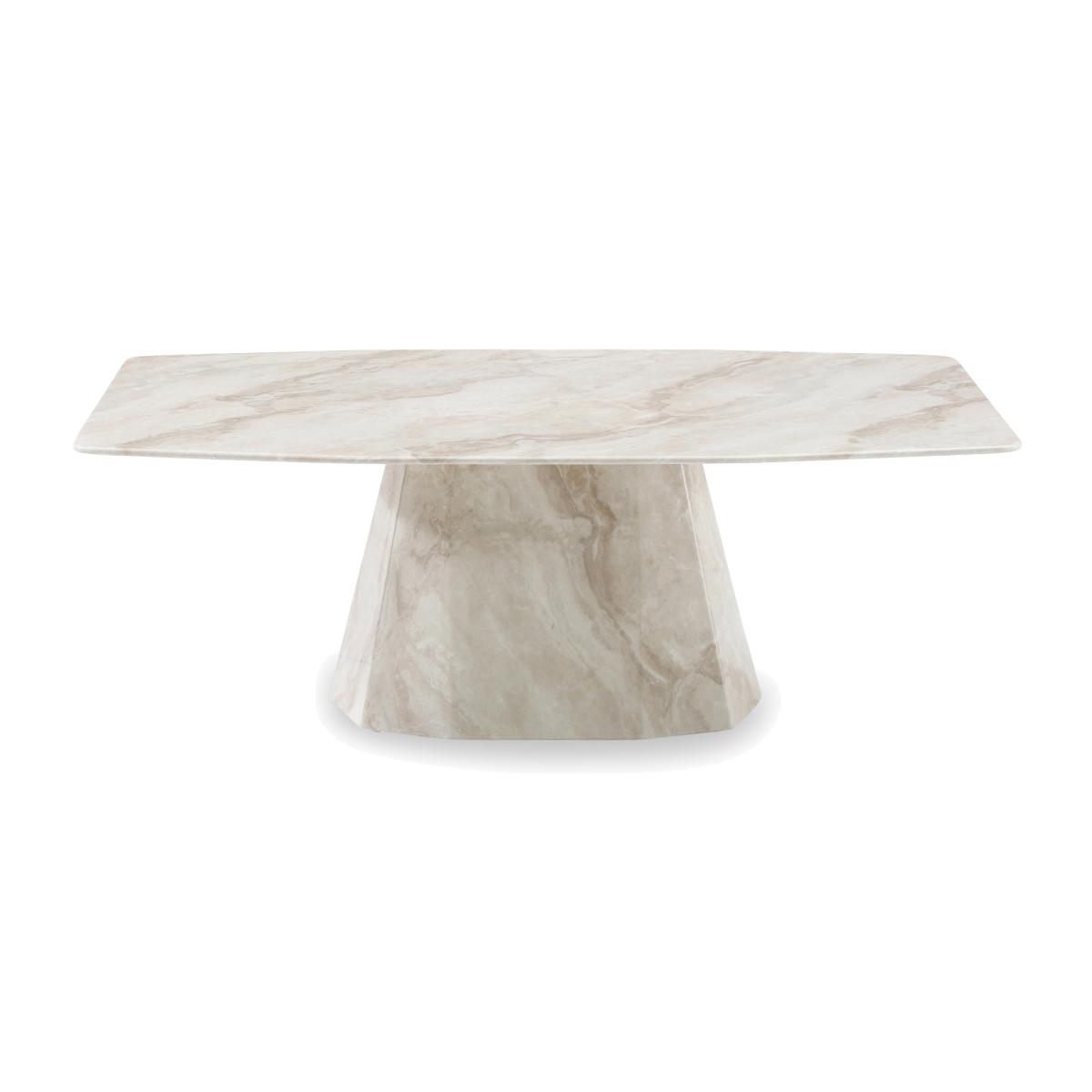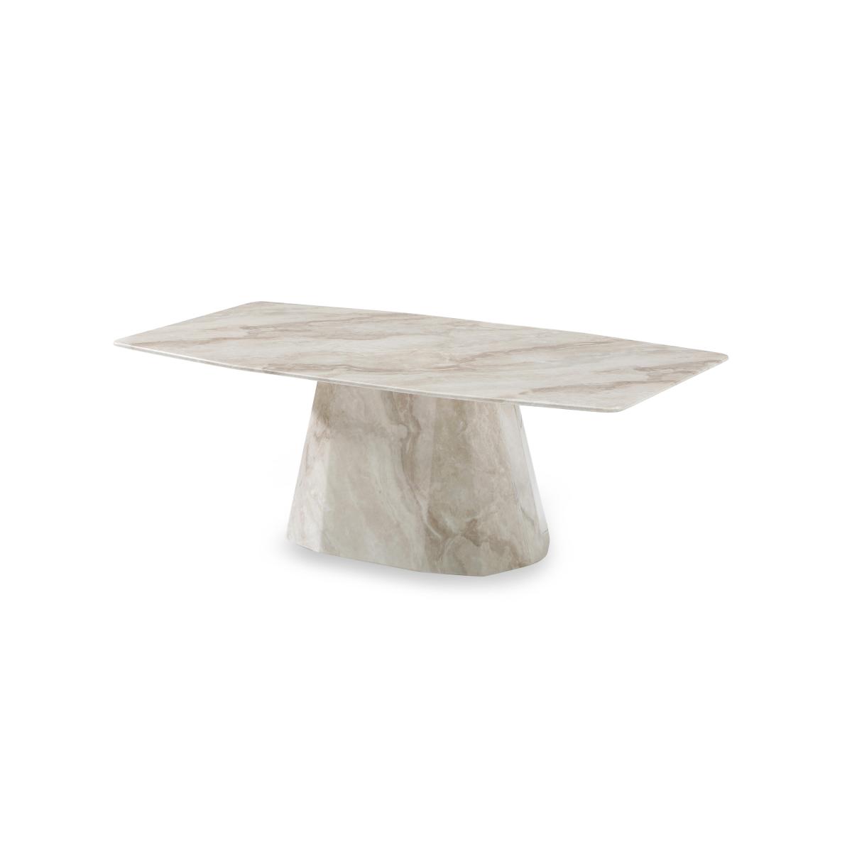 Luxurious, opulent, exquisite – our Elegante collection of marble furniture is all this and more. Or perhaps we should say less. Incredibly well-priced, this range makes the beauty of natural marble furniture a real option for more homes. Showcasing bold sculptural lines, authentic marble patterning and a sophisticated neutral colour palette, the collection is designed to enhance and elevate the aesthetic of any modern home. This carefully curated collection includes two sizes of dining tables, dining sets, a sideboard, occasional tables and dining room seating. The Elegante range is exclusively available at Furniture Village. All the opulence of marble furniture is yours with our simply stunning and very well-priced Elegante range. This showstopping coffee table is crafted from solid marble and has a beautiful glossy finish. Why you'll love it Crafted from real marble, this coffee table takes centre stage in any home. Authentic style, elegance and grandeur at an exceptional price. Coffee table has a boat-shaped top with a sculptural pedestal base. Made entirely from solid marble with a high-gloss, marbled resin finish. A stunning recreation of authentic marble patterning in an on-trend neutral palette. Carefully crafted to preserve and protect the marble’s natural beauty. A Furniture Village exclusive. This marble coffee table is part of our Elegante range. What you need to know Marble top and base. Marble is hardwearing but not indestructible, so it’s important to care for it properly. Spillages need to be removed immediately. To clean, wipe gently with a damp cloth using warm water, then buff dry. We recommend that you use coasters and placemats to protect against heat and moisture. Do not use knives to cut food on a marble table top, use as a work top, place heavy weights on the table or use acidic or abrasive cleaners. You should never sit or stand on a marble surface. For more advice on caring for your marble furniture, see our Dining care guide. Item code: ELGECT----001