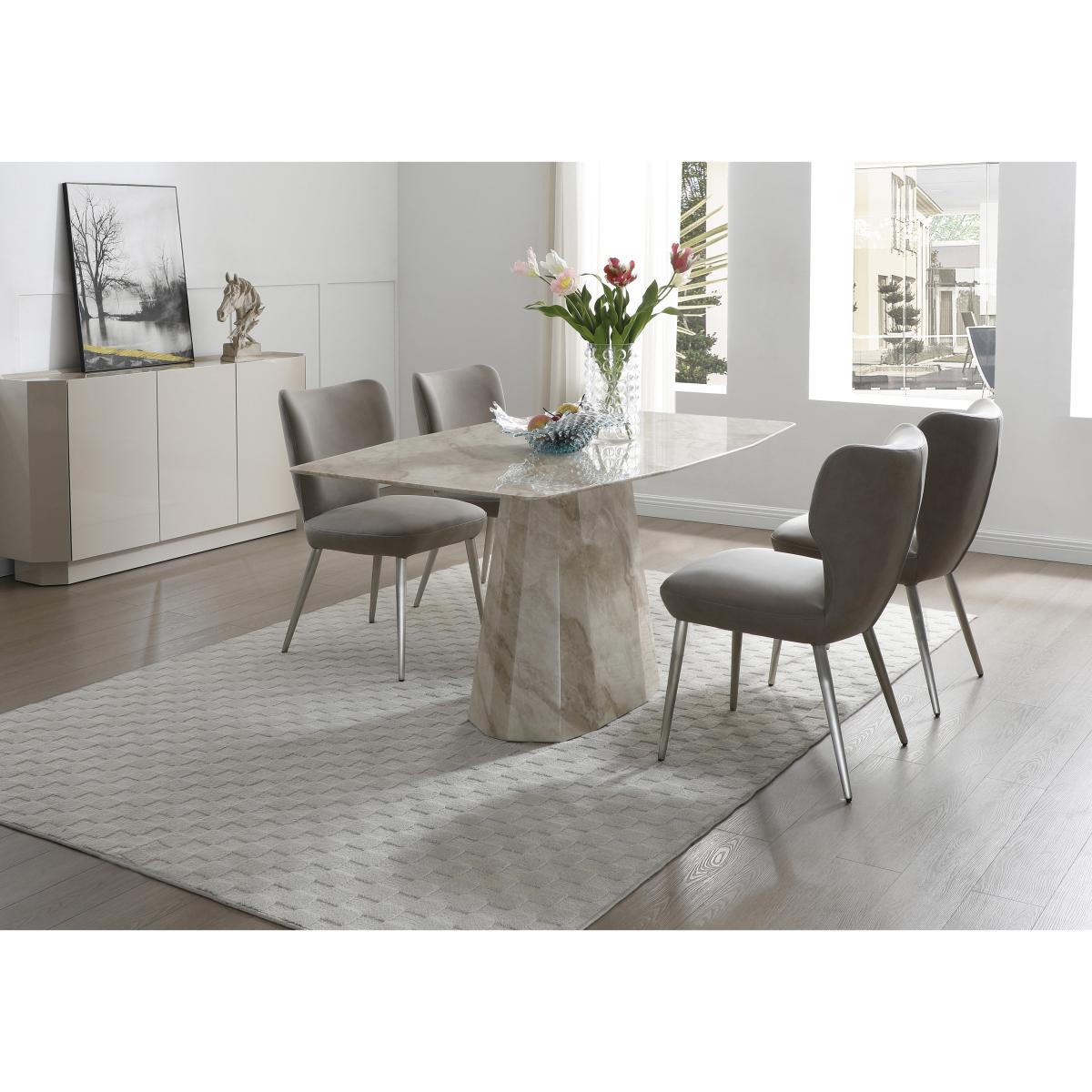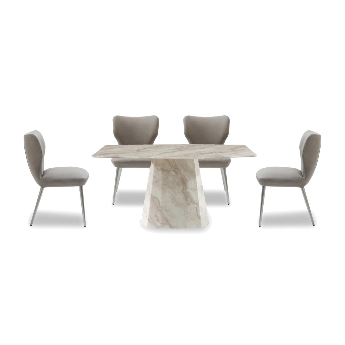 Luxurious, opulent, exquisite – our Elegante collection of marble furniture is all this and more. Or perhaps we should say less. Incredibly well-priced, this range makes the beauty of natural marble furniture a real option for more homes. Showcasing bold sculptural lines, authentic marble patterning and a sophisticated neutral colour palette, the collection is designed to enhance and elevate the aesthetic of any modern home. This carefully curated collection includes two sizes of dining tables, dining sets, a sideboard, occasional tables and dining room seating. The Elegante range is exclusively available at Furniture Village. All the opulence of marble furniture is yours with our simply stunning and very well-priced Elegante range. This showstopping dining set is crafted from solid marble and includes four dining chairs. Why you'll love it Crafted from real marble, this dining set takes centre stage in any home. Authentic style, elegance and grandeur at an exceptional price. The dining table has a boat-shaped top with a sculptural pedestal base. It’s made entirely from solid marble with a high-gloss, marbled resin finish. A stunning recreation of authentic marble patterning in an on-trend neutral palette. Carefully crafted to preserve and protect the marble’s natural beauty. Table is available in 2 sizes. Dining set includes 4 modern dining chairs with striking lines. Chairs have ultra-comfortable pocket spring seats. Brushed stainless steel legs. Upholstered in a choice of colours. A Furniture Village exclusive. This marble dining set is part of our Elegante range. What you need to know Chairs have metal frames and legs and are cushioned with foam. Dining table has a marble top and base. Small 150 cm dining table seats up to 6. Large 180 cm dining table seats up to 8. Marble is hardwearing but not indestructible, so it’s important to care for it properly. Spillages need to be removed immediately. To clean, wipe gently with a damp cloth using warm water, then buff dry. We recommend that you use coasters and placemats to protect against heat and moisture. Do not use knives to cut food on a marble table top, use as a work top, place heavy weights on the table or use acidic or abrasive cleaners. You should never sit or stand on a marble surface. For more advice on caring for your marble furniture, see our Dining care guide. Item code: ELGEDST5TPE-001
