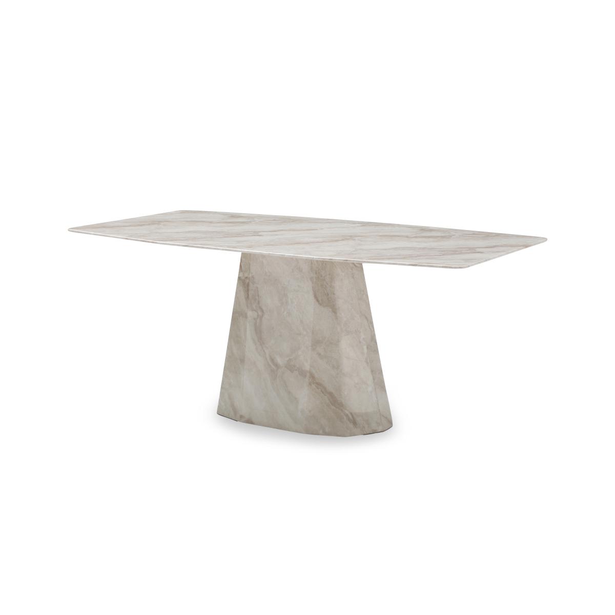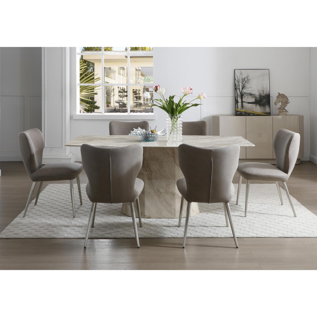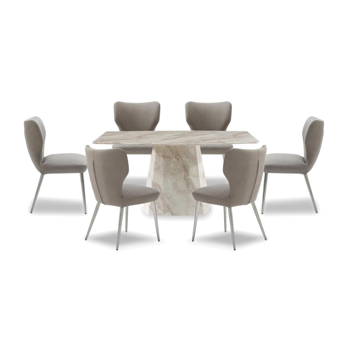 Luxurious, opulent, exquisite – our Elegante collection of marble furniture is all this and more. Or perhaps we should say less. Incredibly well-priced, this range makes the beauty of natural marble furniture a real option for more homes. Showcasing bold sculptural lines, authentic marble patterning and a sophisticated neutral colour palette, the collection is designed to enhance and elevate the aesthetic of any modern home. This carefully curated collection includes two sizes of dining tables, dining sets, a sideboard, occasional tables and dining room seating. The Elegante range is exclusively available at Furniture Village. All the opulence of marble furniture is yours with our simply stunning and very well-priced Elegante range. This showstopping dining set is crafted from solid marble and includes six dining chairs. Why you'll love it Crafted from real marble, this dining set takes centre stage in any home. Authentic style, elegance and grandeur at an exceptional price. The dining table has a boat-shaped top with a sculptural pedestal base. It’s made entirely from solid marble with a high-gloss, marbled resin finish. A stunning recreation of authentic marble patterning in an on-trend neutral palette. Carefully crafted to preserve and protect the marble’s natural beauty. Table is available in 2 sizes. Dining set includes 6 modern dining chairs with striking lines. Chairs have ultra-comfortable pocket spring seats. Brushed stainless steel legs. Upholstered in a choice of colours. A Furniture Village exclusive. This marble dining set is part of our Elegante range. What you need to know Chairs have metal frames and legs and are cushioned with foam. Dining table has a marble top and base. Small 150 cm dining table seats up to 6. Large 180 cm dining table seats up to 8. Marble is hardwearing but not indestructible, so it’s important to care for it properly. Spillages need to be removed immediately. To clean, wipe gently with a damp cloth using warm water, then buff dry. We recommend that you use coasters and placemats to protect against heat and moisture. Do not use knives to cut food on a marble table top, use as a work top, place heavy weights on the table or use acidic or abrasive cleaners. You should never sit or stand on a marble surface. For more advice on caring for your marble furniture, see our Dining care guide. Item code:ELGEDST6TPE-001