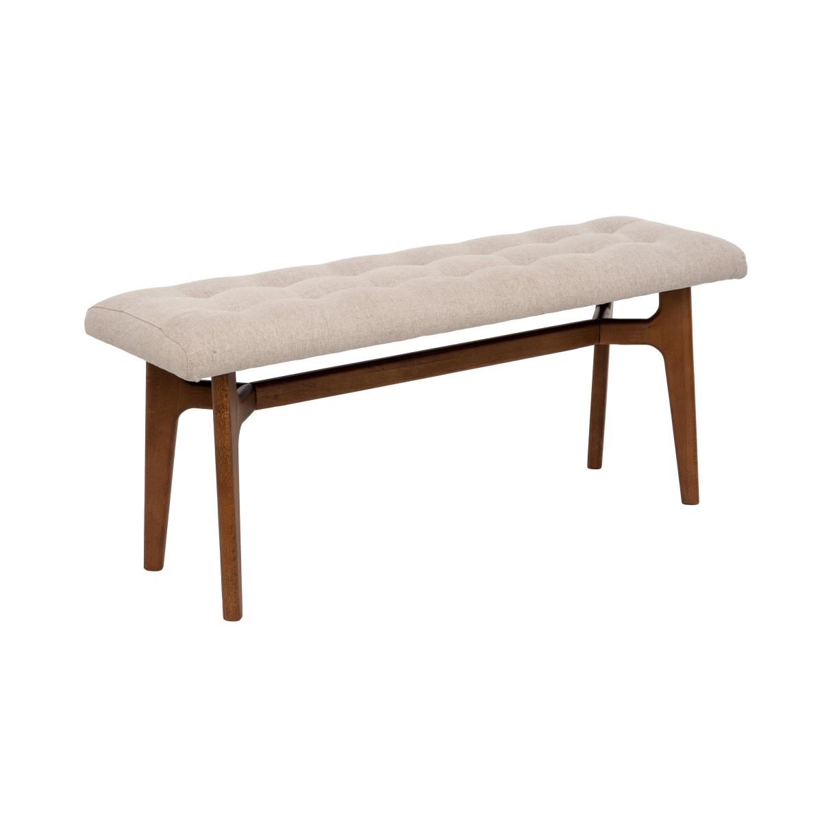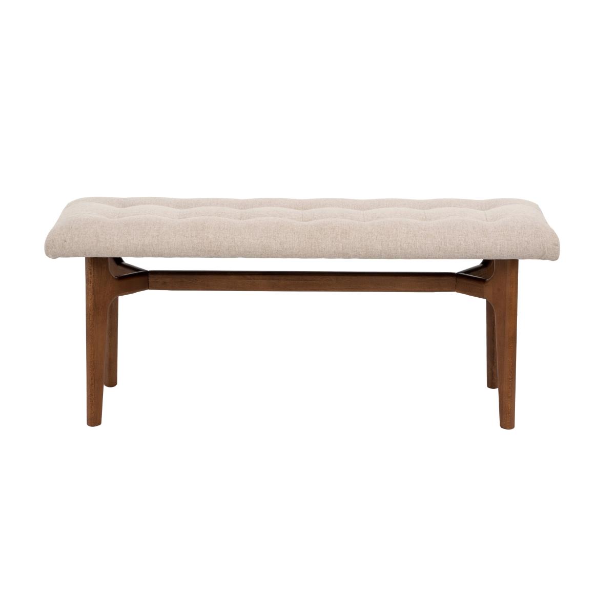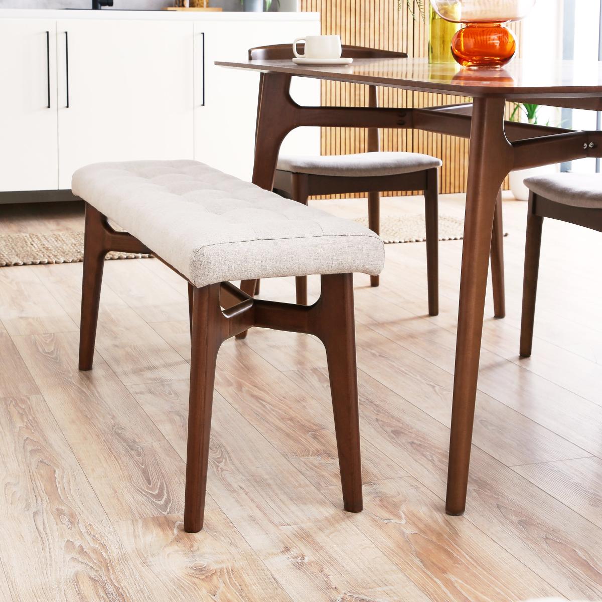 Give your kitchen or dining room a warm, stylish look with this Elements Alva dining bench. Enjoy a casual dining set up with this walnut stained dining bench. The design is mid century modern inspired with a comfortable upholstered seat and features solid beech construction that will stand up to years of use.
