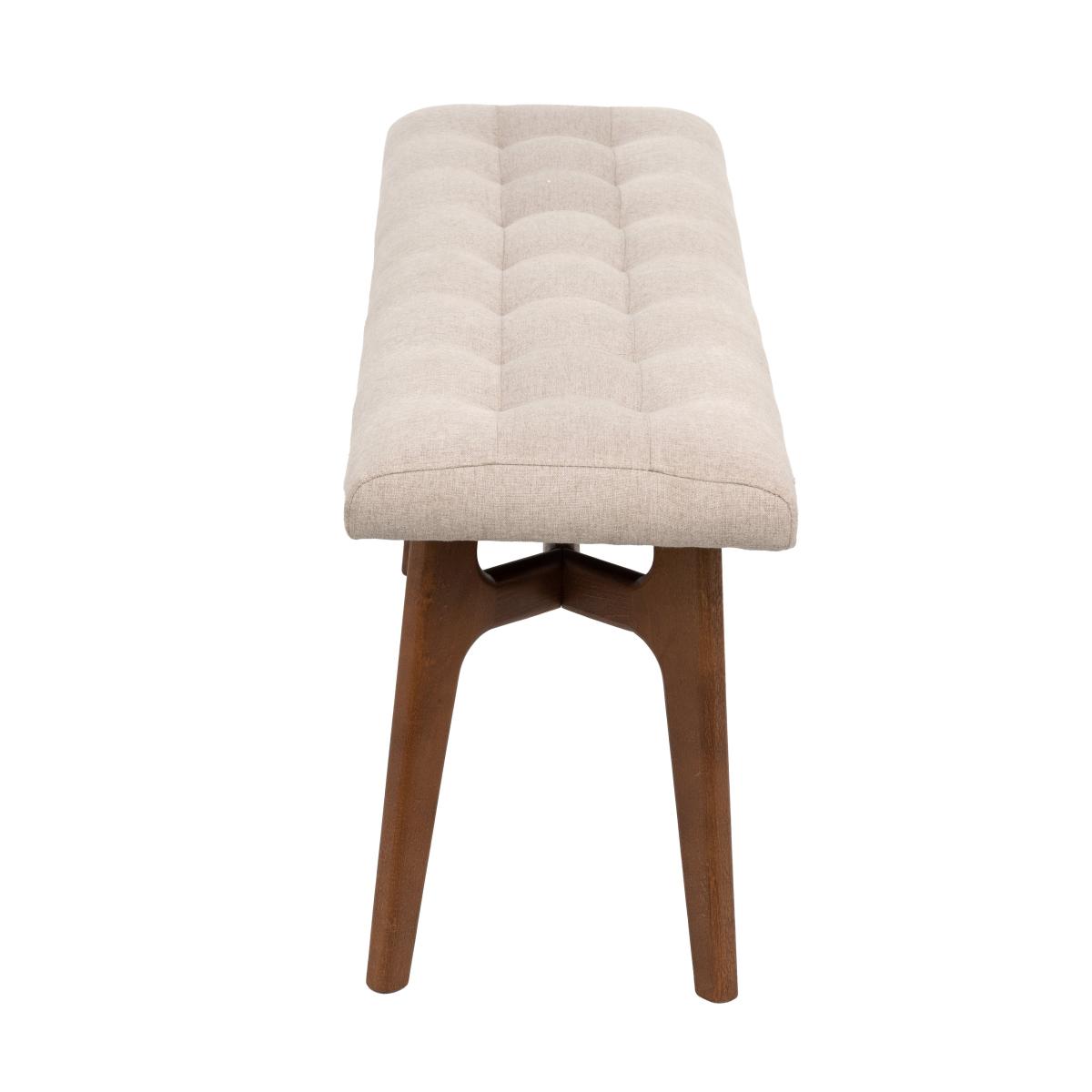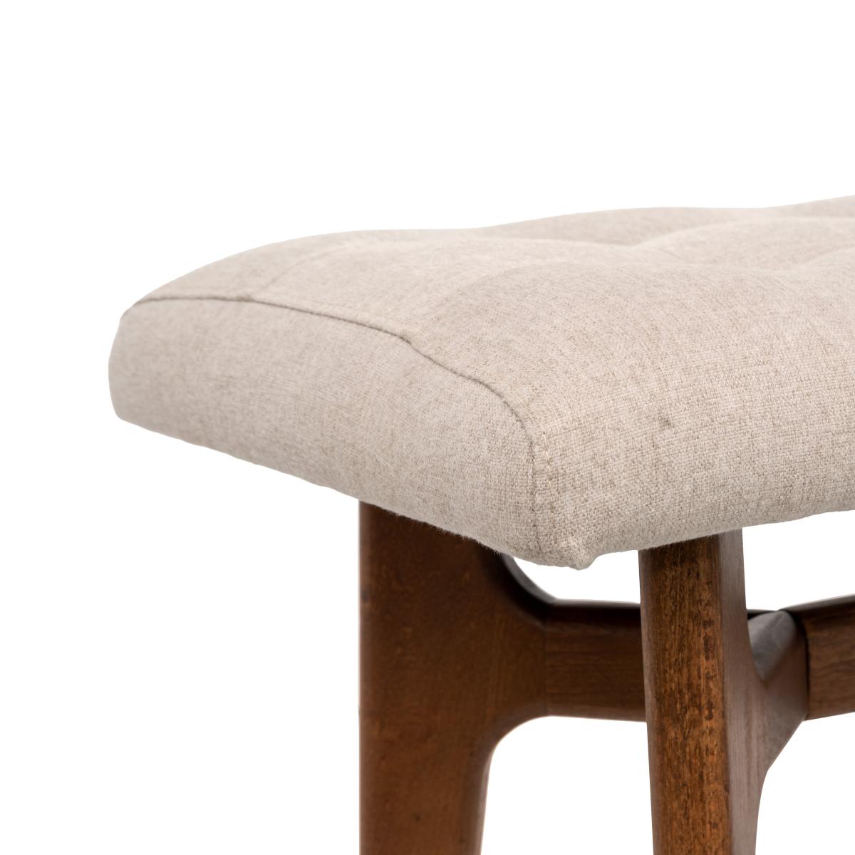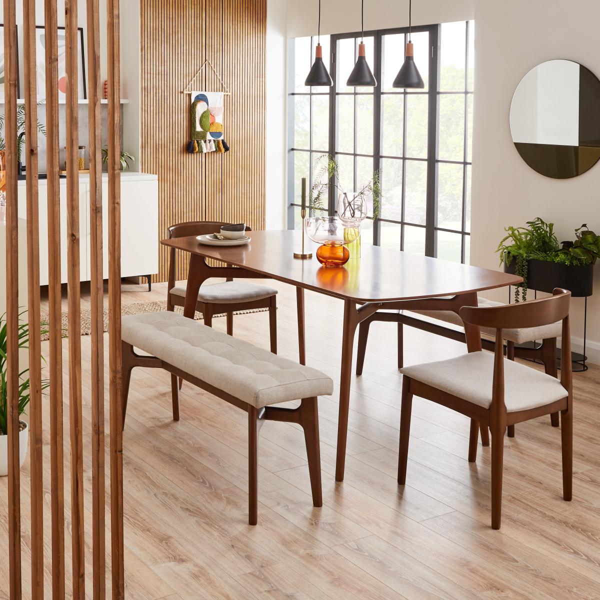 Give your kitchen or dining room a warm, stylish look with this Elements Alva dining bench. Enjoy a casual dining set up with this walnut stained dining bench. The design is mid century modern inspired with a comfortable upholstered seat and features solid beech construction that will stand up to years of use.