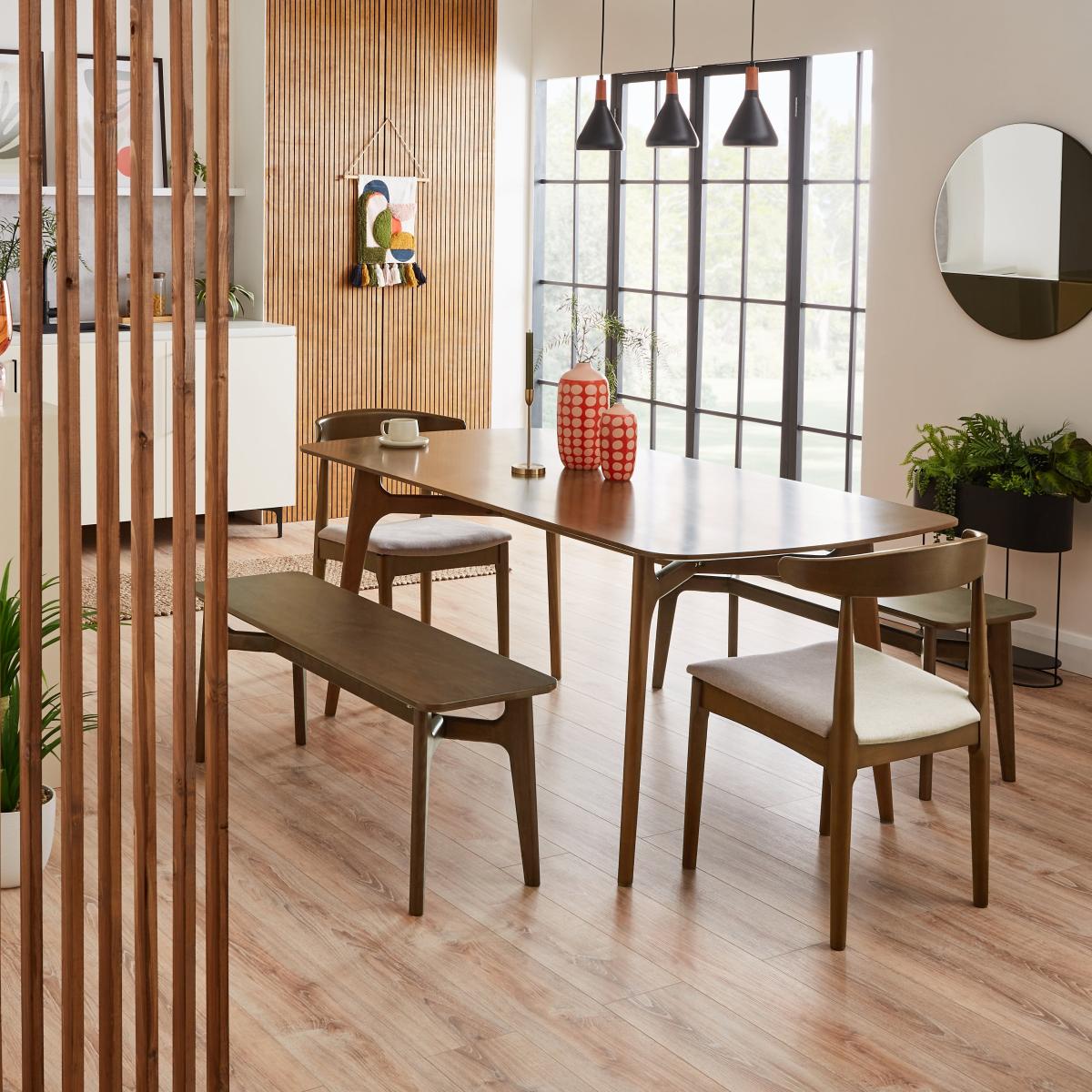 The Alva dining bench in walnut offers a sleek, contemporary look that works especially well in modern or Scandinavian-inspired interiors. I love its simple, understated design which can effortlessly complement a range of colour schemes, from neutral tones to more vibrant palettes. Practical styling tips include pairing it with a mix of upholstered and wooden chairs around the table for added visual interest, or using it in a hallway or mudroom as a versatile seating option. Its warm walnut stain adds richness and helps anchor the space while remaining versatile enough to suit both casual and more polished dining areas.