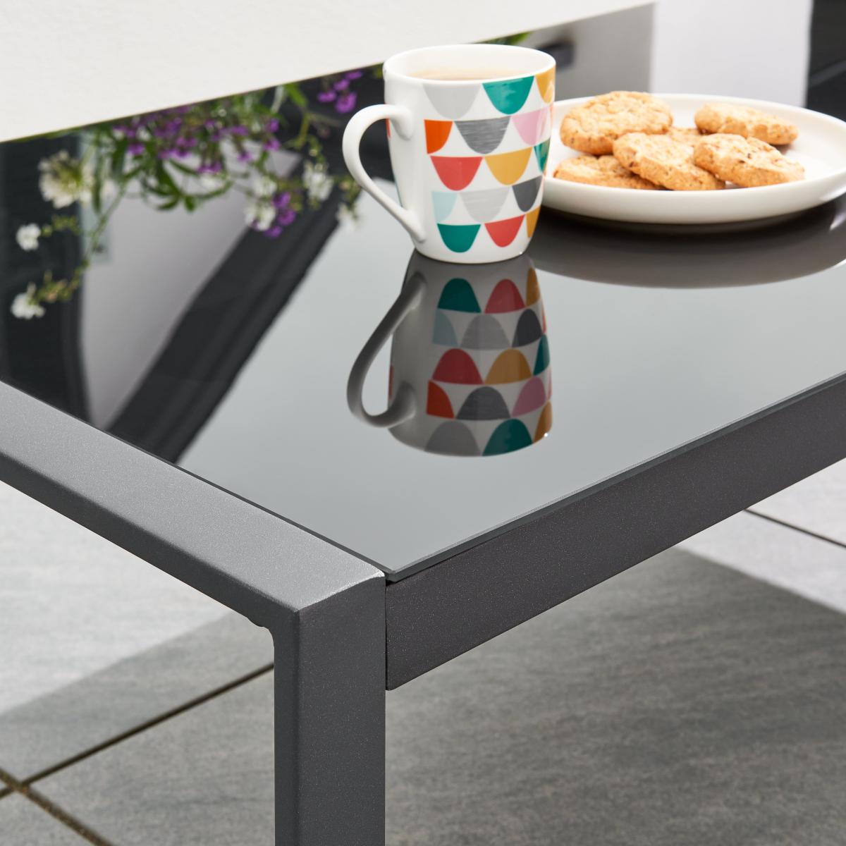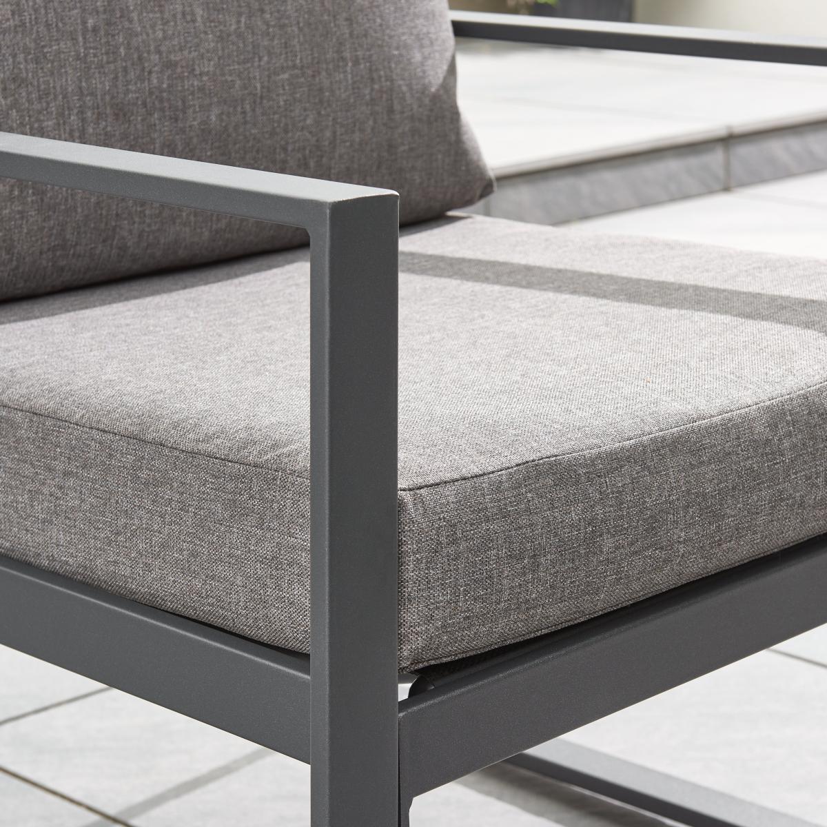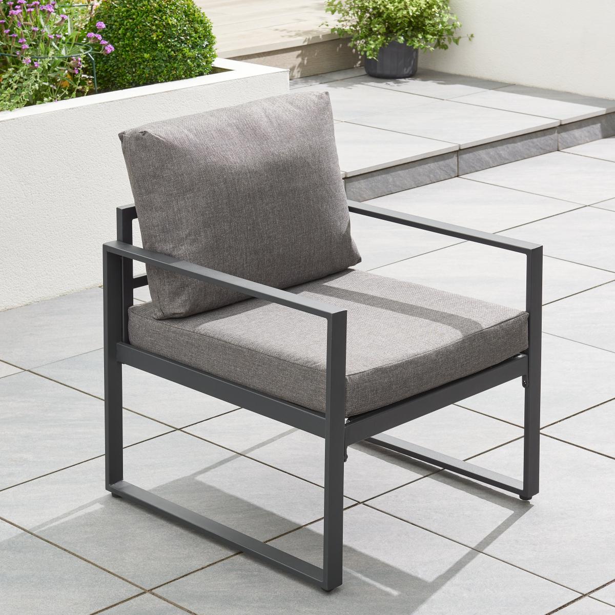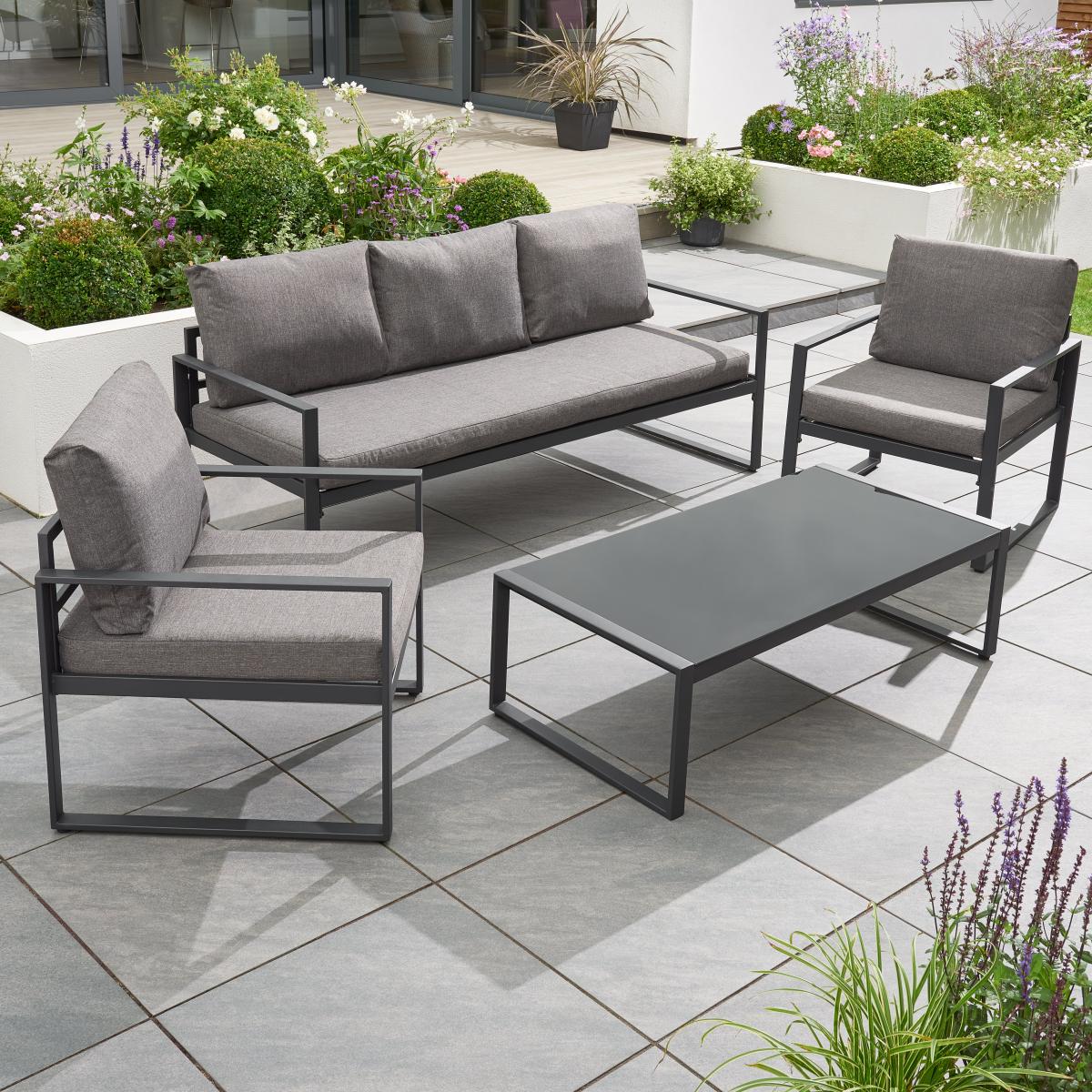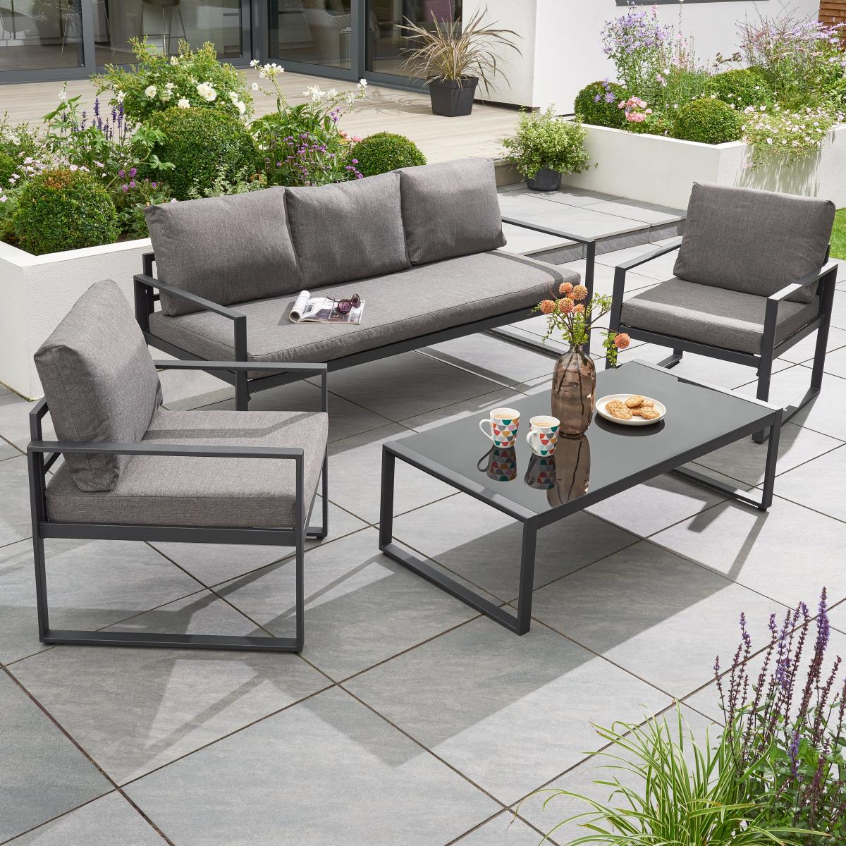 I love this set for its sleek, modern aesthetic and versatility, making it a fantastic focal point for outdoor living spaces. Its black frame and neutral cushions work well in contemporary gardens, rooftop terraces, or minimalist patios, providing a chic, understated look. To style around it, consider adding some colourful outdoor cushions or throws for comfort and visual interest. Incorporating some layered lighting like lanterns or fairy lights can create inviting evening ambiance. This set’s clean lines also make it easy to pair with various accessories, whether lush greenery, a vibrant outdoor rug, or decorative tableware, helping to create a stylish yet functional garden retreat.