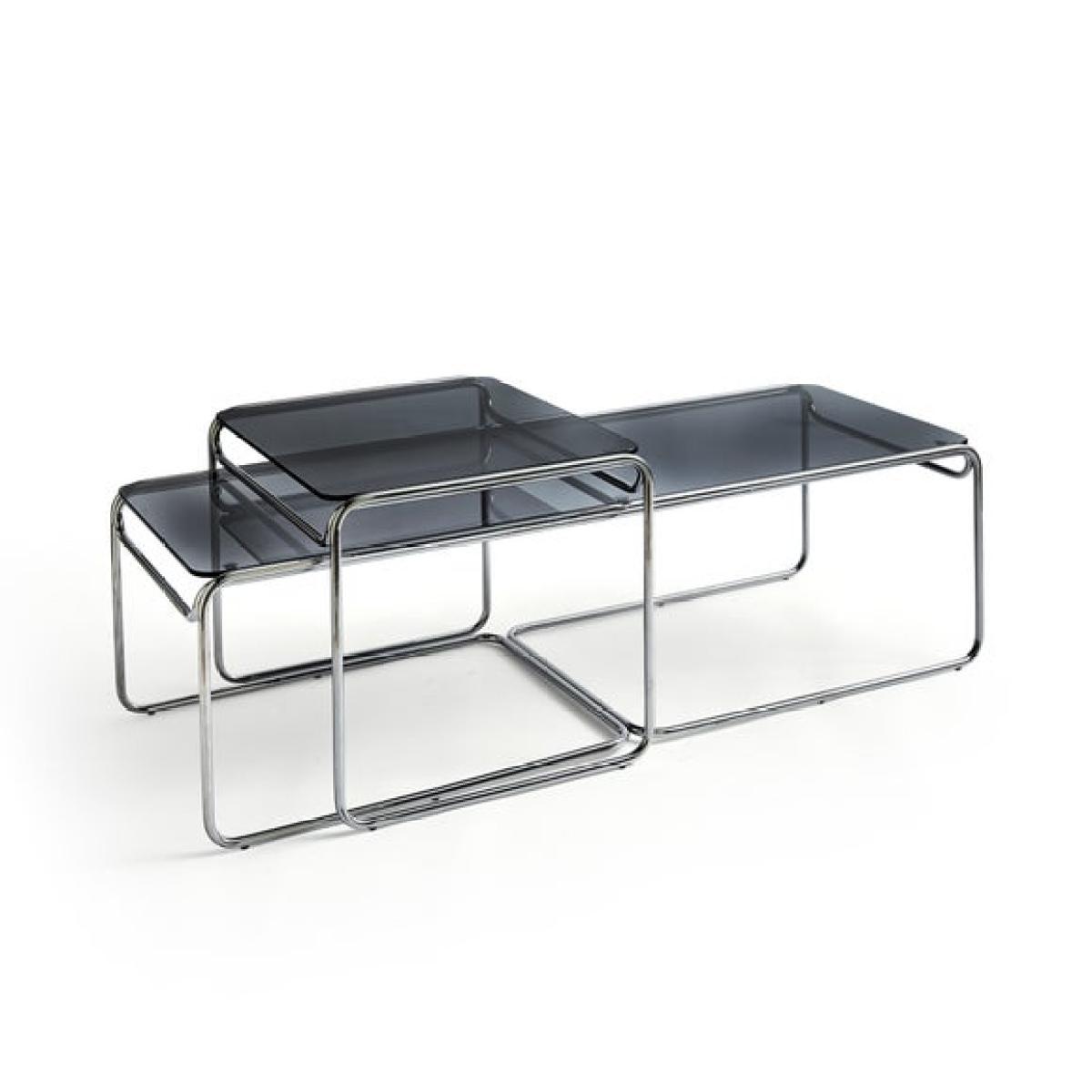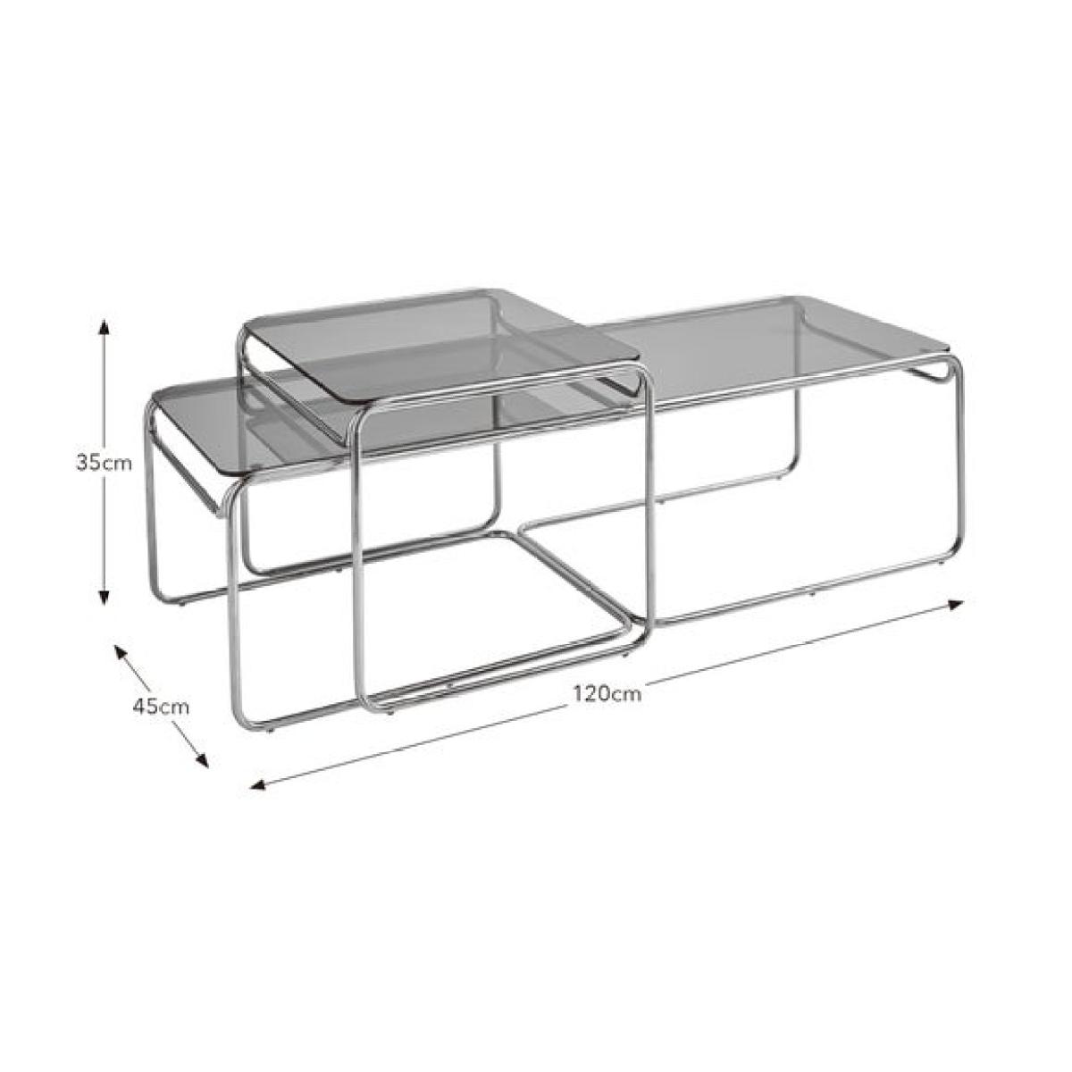* Set of 2 tables * Metal frame * Glass table tops This stylish nest of coffee tables offers a sleek and versatile solution for modern living spaces. Featuring a smoked glass top and a minimalist metal frame, the design blends effortlessly into a variety of interiors. The nesting format allows you to save space when needed or spread them out for entertaining, making them as practical as they are elegant.