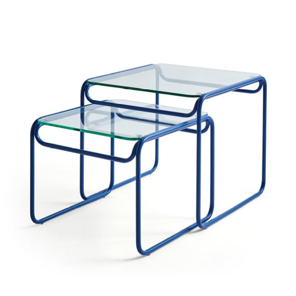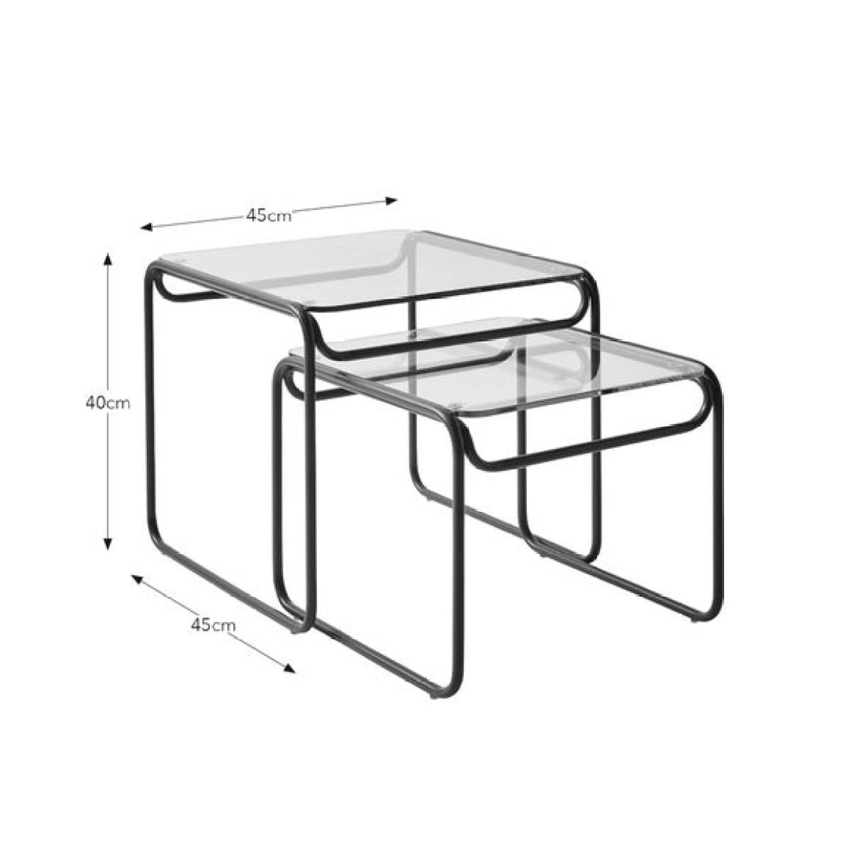 * Set of 2 tables * Metal frame * Glass table tops Compact and contemporary, this nest of side tables is perfect for adding stylish functionality to your living space. The smoked glass tops offer a subtle, sophisticated finish, while the nesting design provides flexibility and space-saving convenience. Ideal beside a sofa or armchair for drinks, books, or decorative accents.