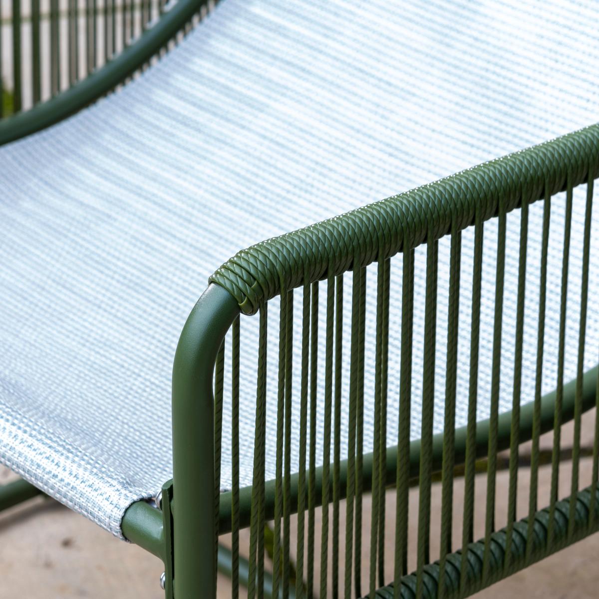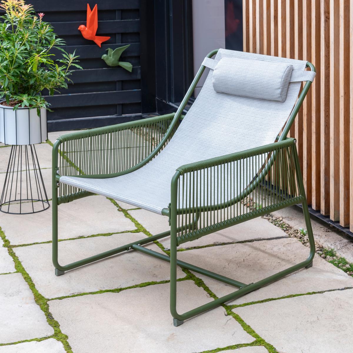 I love this garden chair for its clean, modern lines and versatile colour. The olive green frame offers a refreshing alternative to classic rattan or metallic finishes, making it suitable for both contemporary and bohemian outdoor styles. It works particularly well in relaxed, coastal, or woodland-inspired gardens, but can also add a pop of colour to minimalist patios. Practical styling tips include pairing it with neutral or patterned cushions to add comfort and personality, and combining it with natural textures like wicker or wood for a cohesive look. Its sturdy design also means it can transition easily between outdoor lounging and more structured outdoor dining areas.